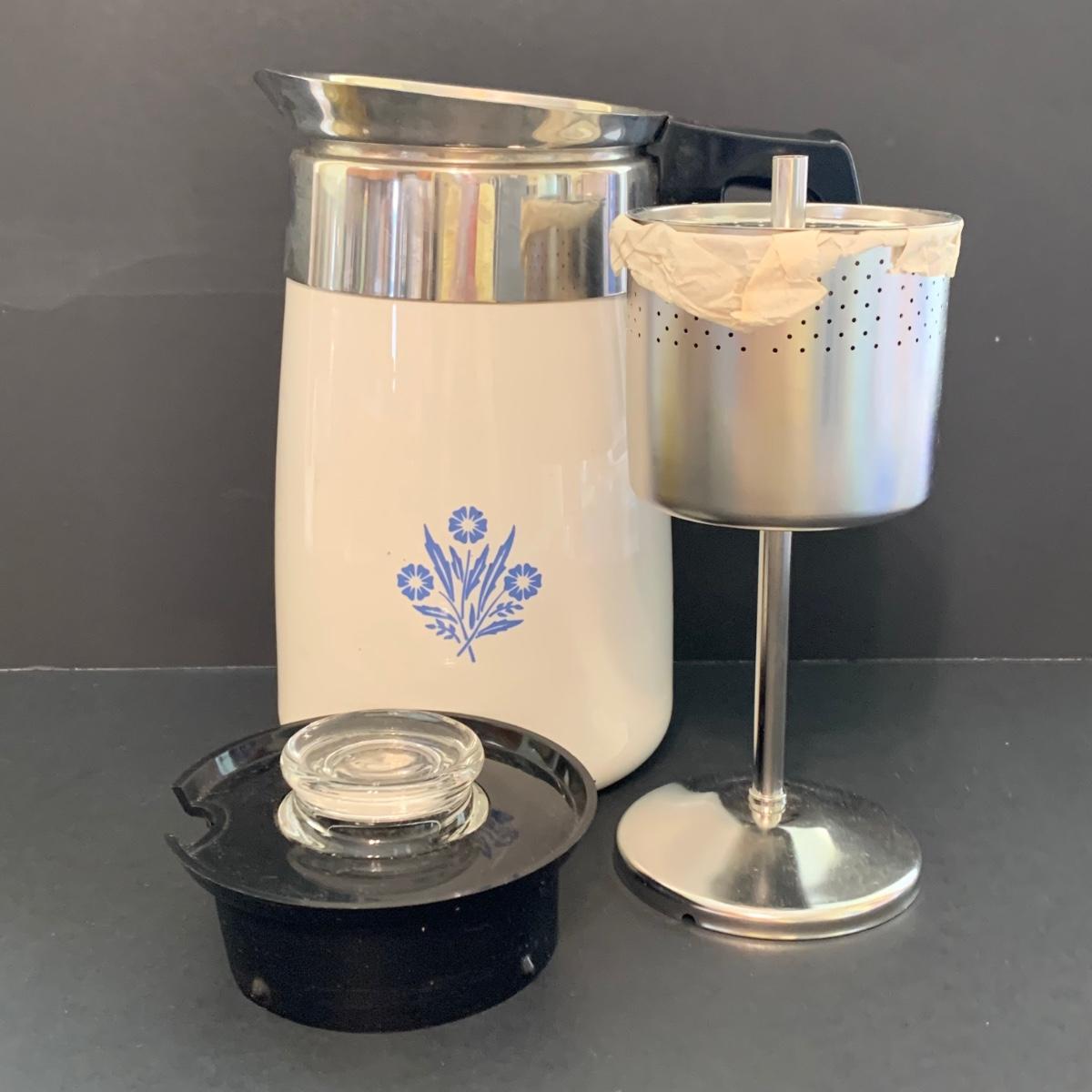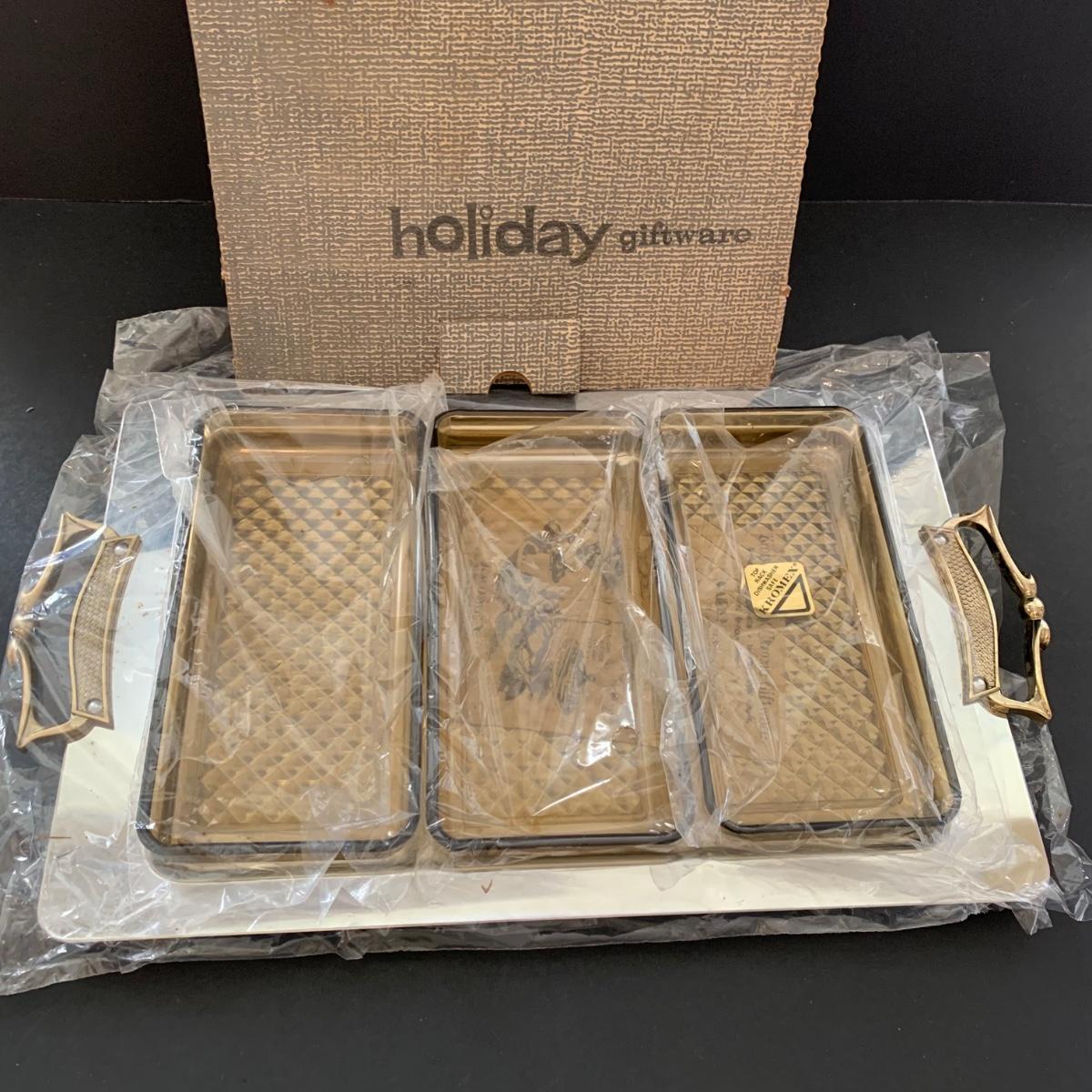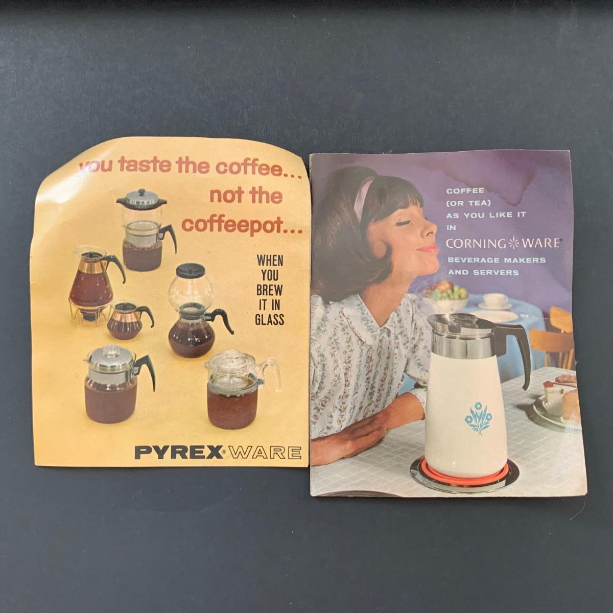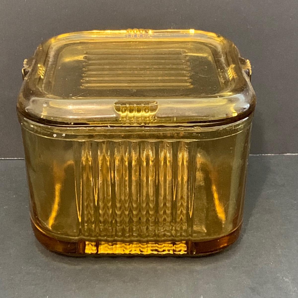 LOT 79: Kromex Holiday Giftware Set, Corning Ware Coffee Percolator Coffee Pot, Hocking Glass Ring Vase, Vintage Federal Glass Amber Square Refrigerator Dish with Lid Ribbed 4" & More