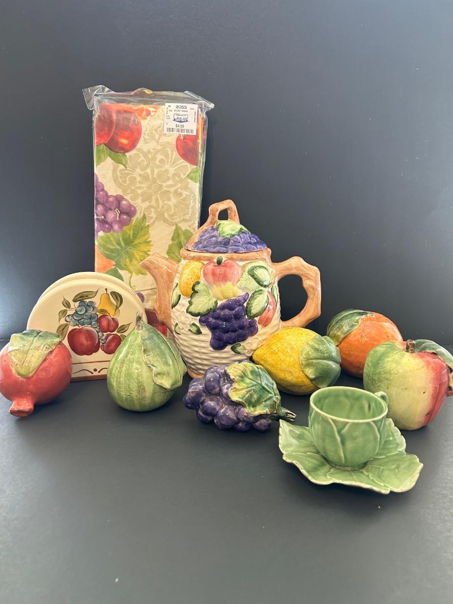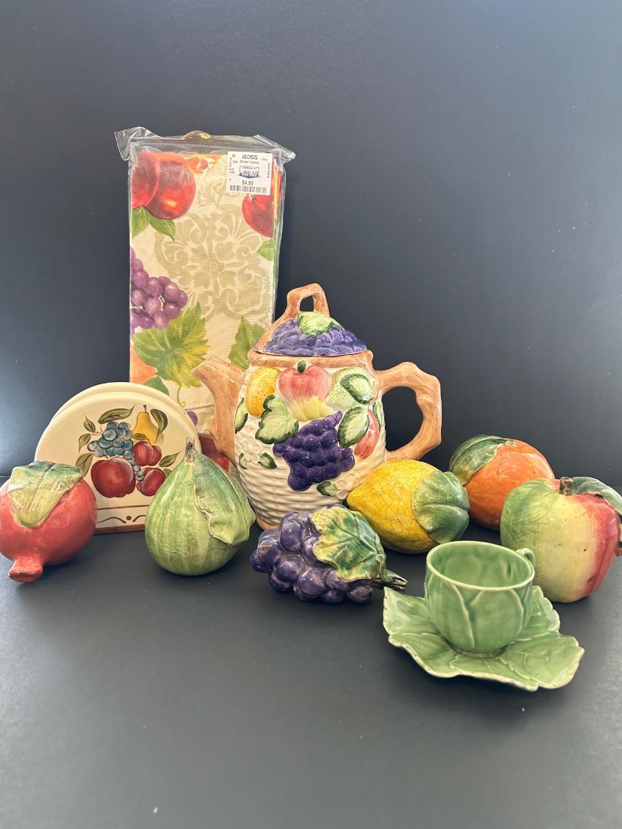 LOT 83: Fruit Kitchen Decor - Tablecloth, Napkin Holder, Tea Pot, Fruit and More
