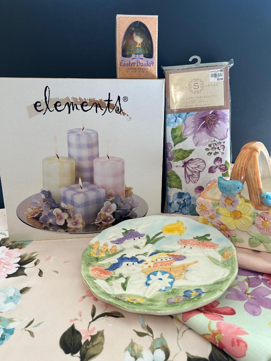 LOT 84: Easter Table and Home Decor - Tablecloth, Candle Set NIB, Easter Plate & Basket and More