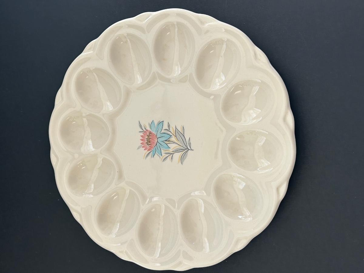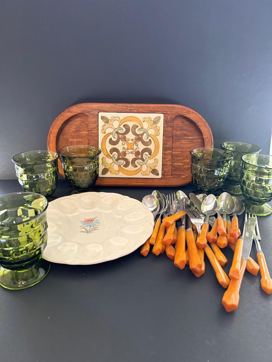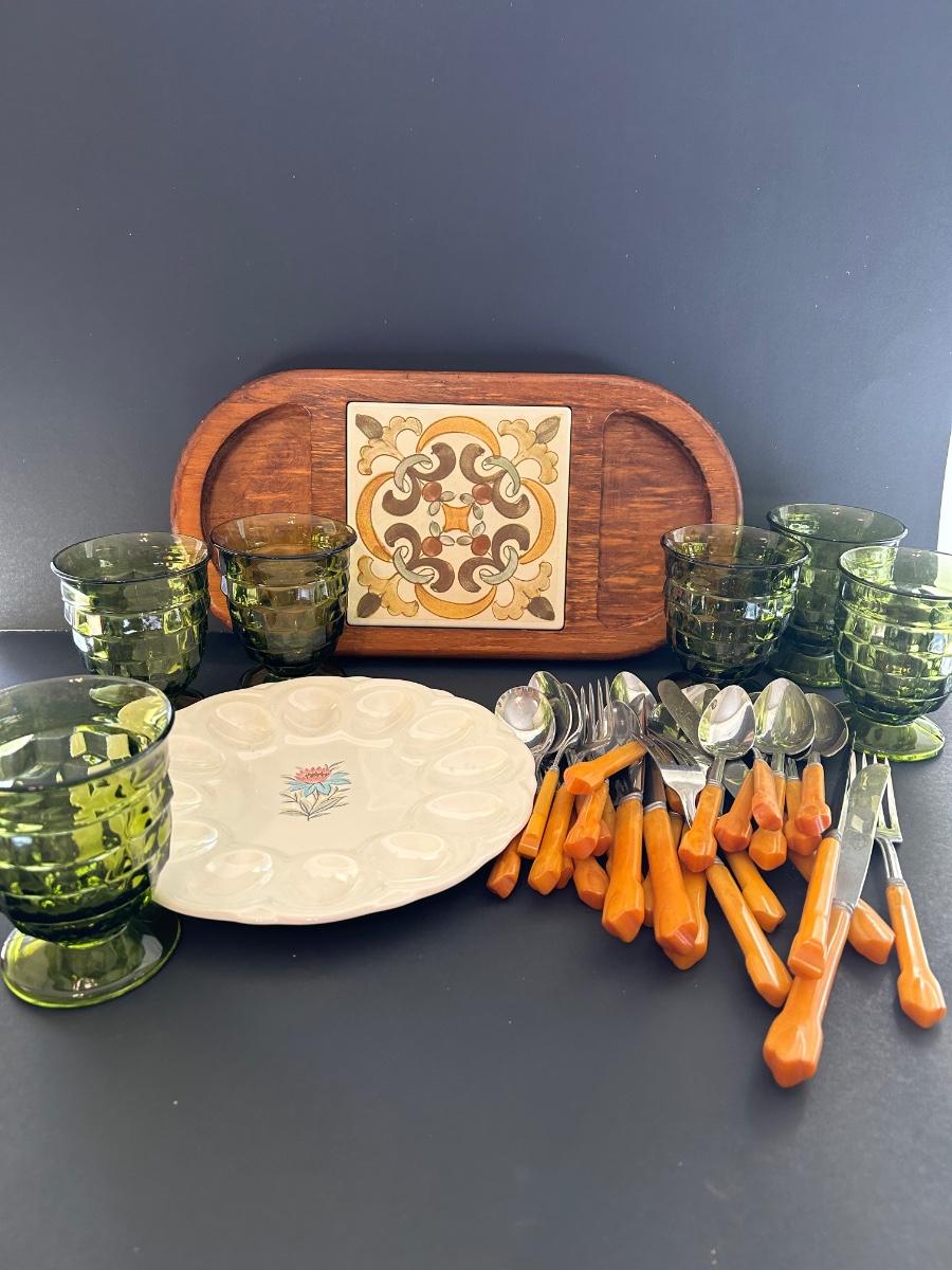 LOT 85: Vintage Kitchen Supplies - Egg Plate, Flatware, Glasses and Serving Plate