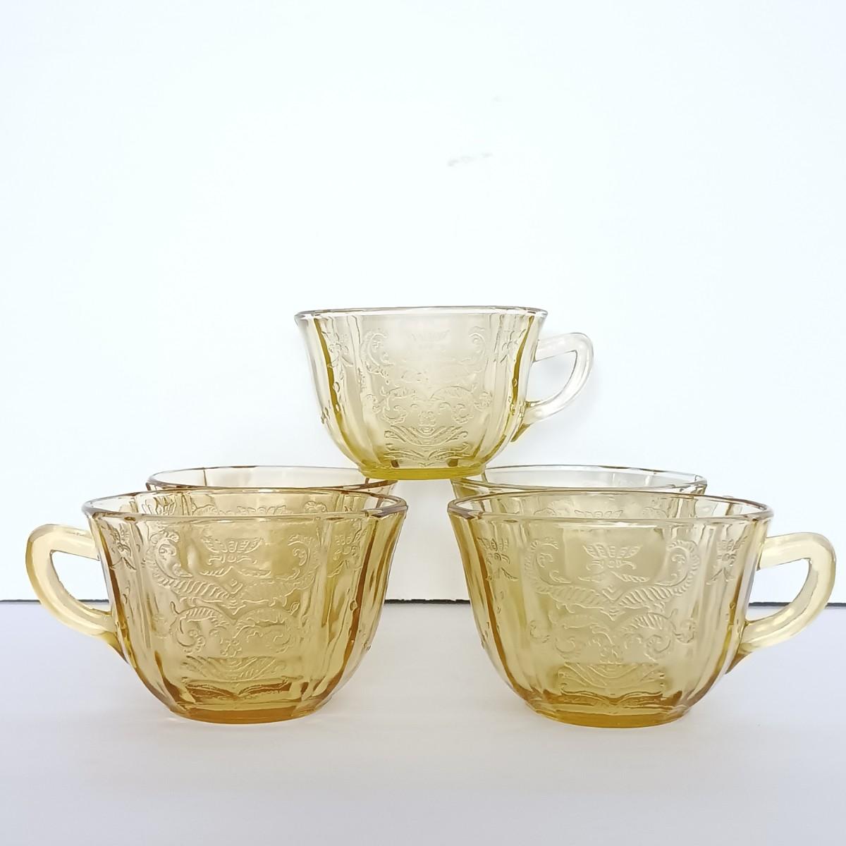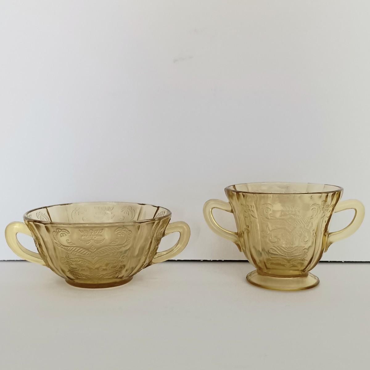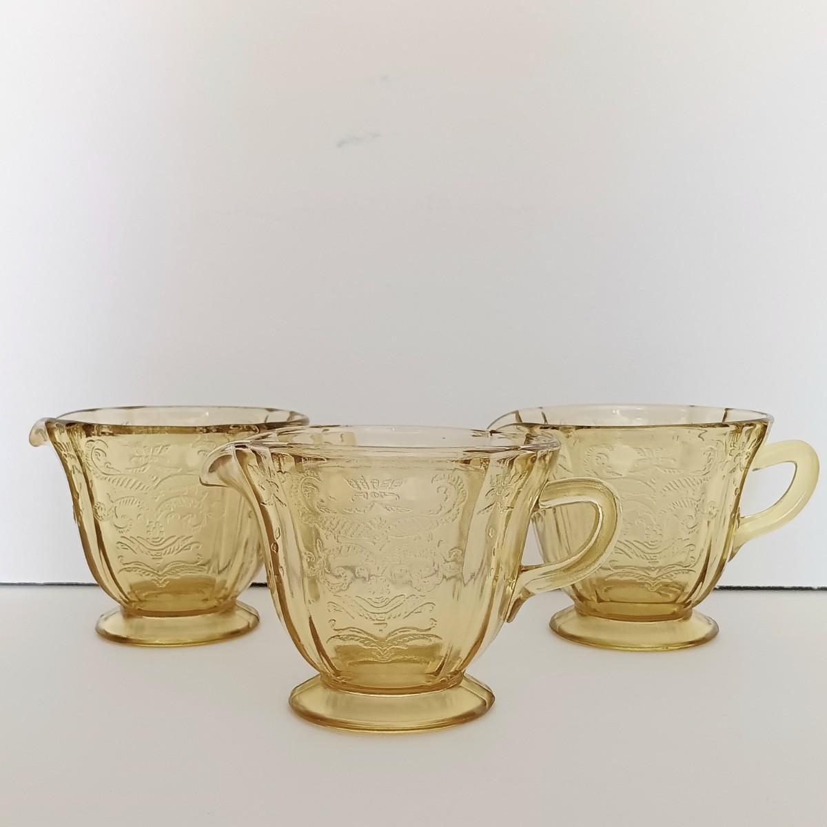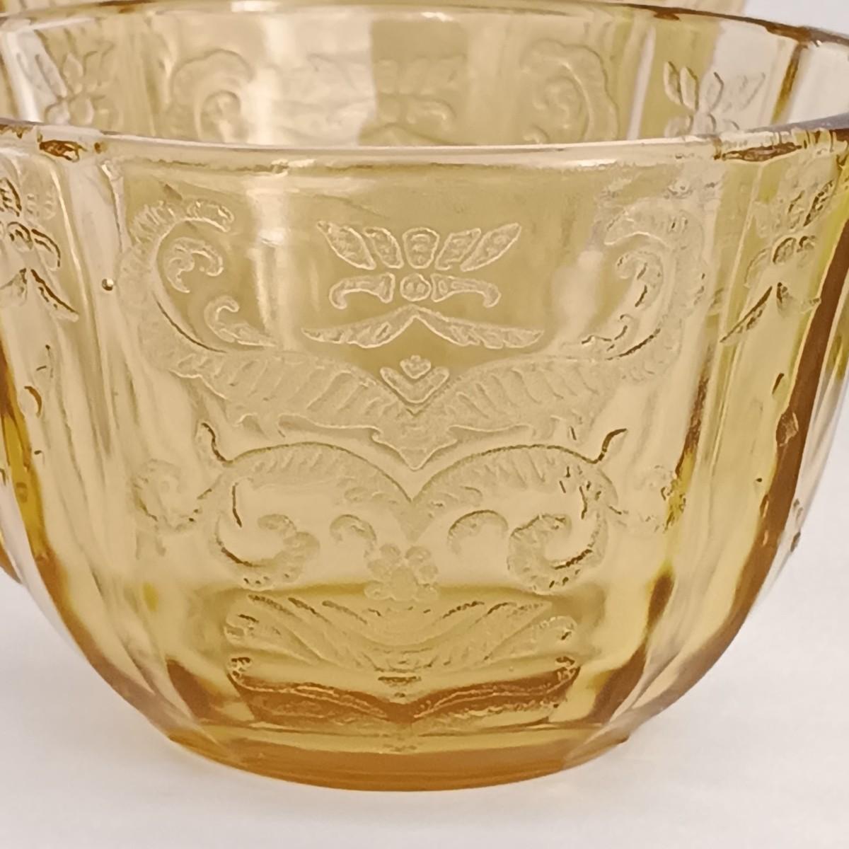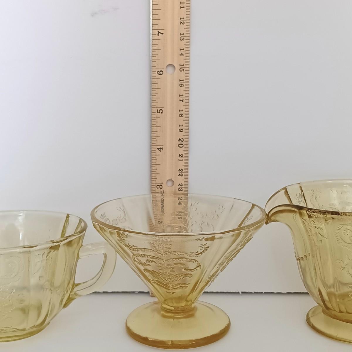 LOT 111: Yellow Depression Glass Madrid Pattern Cups, Cream & Sugar Bowls, Compote Glasses & More