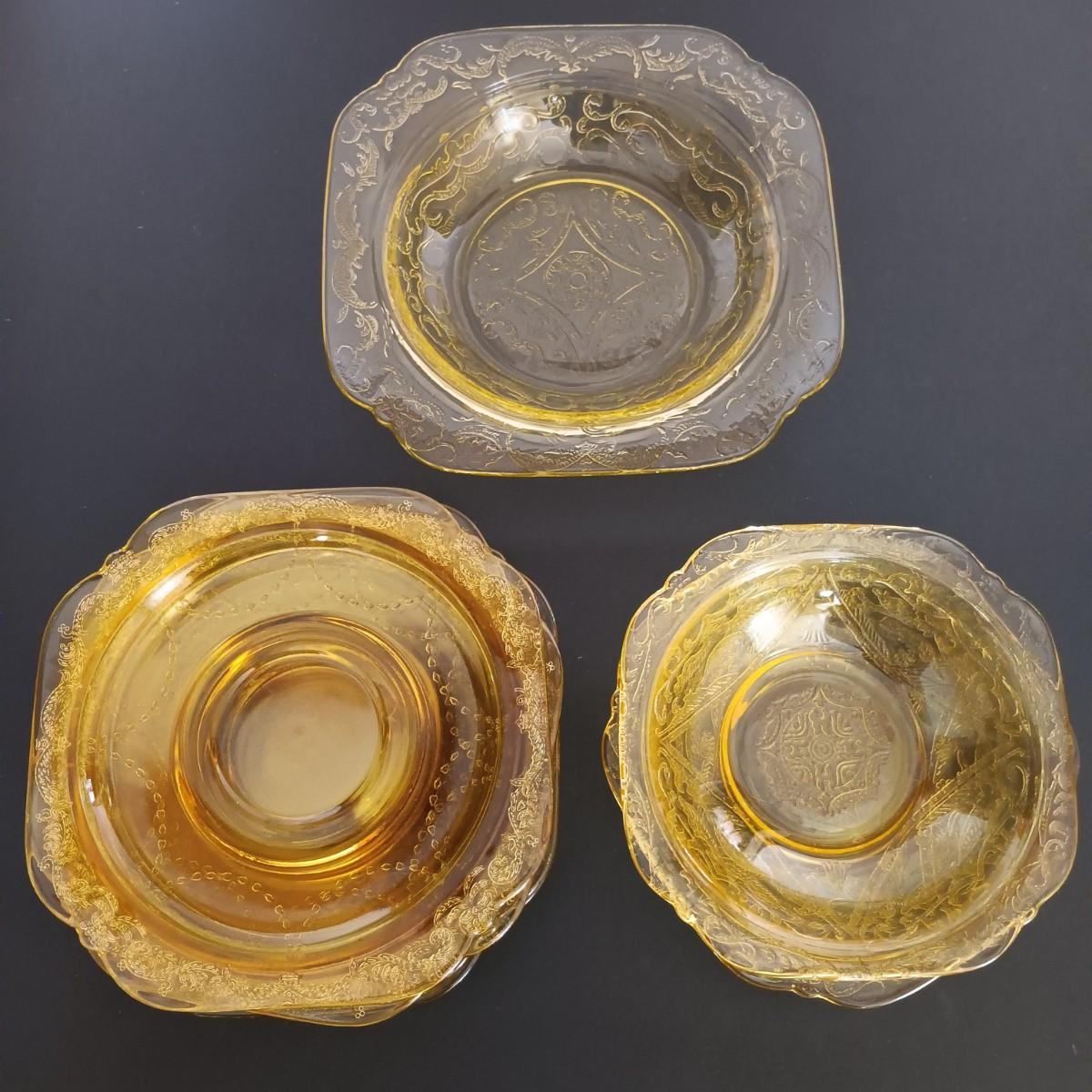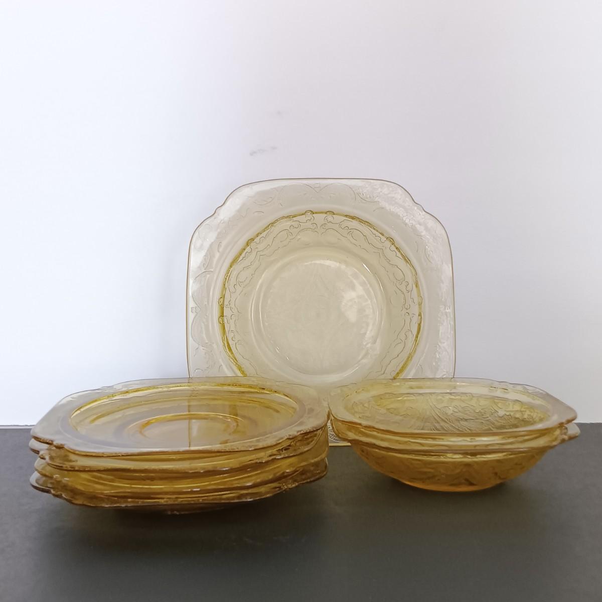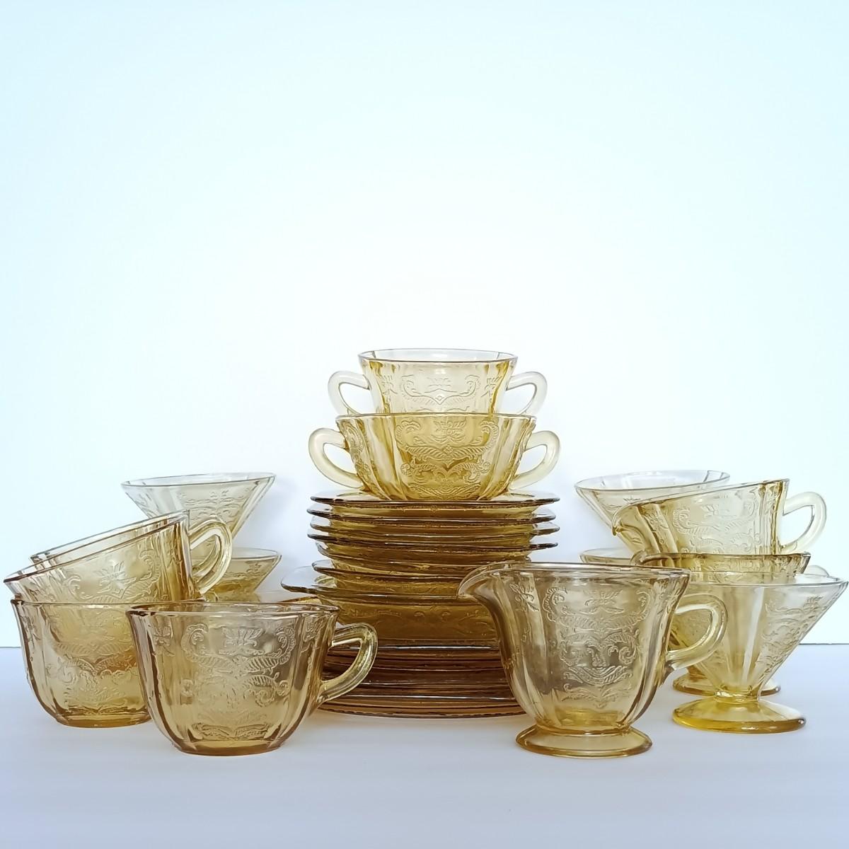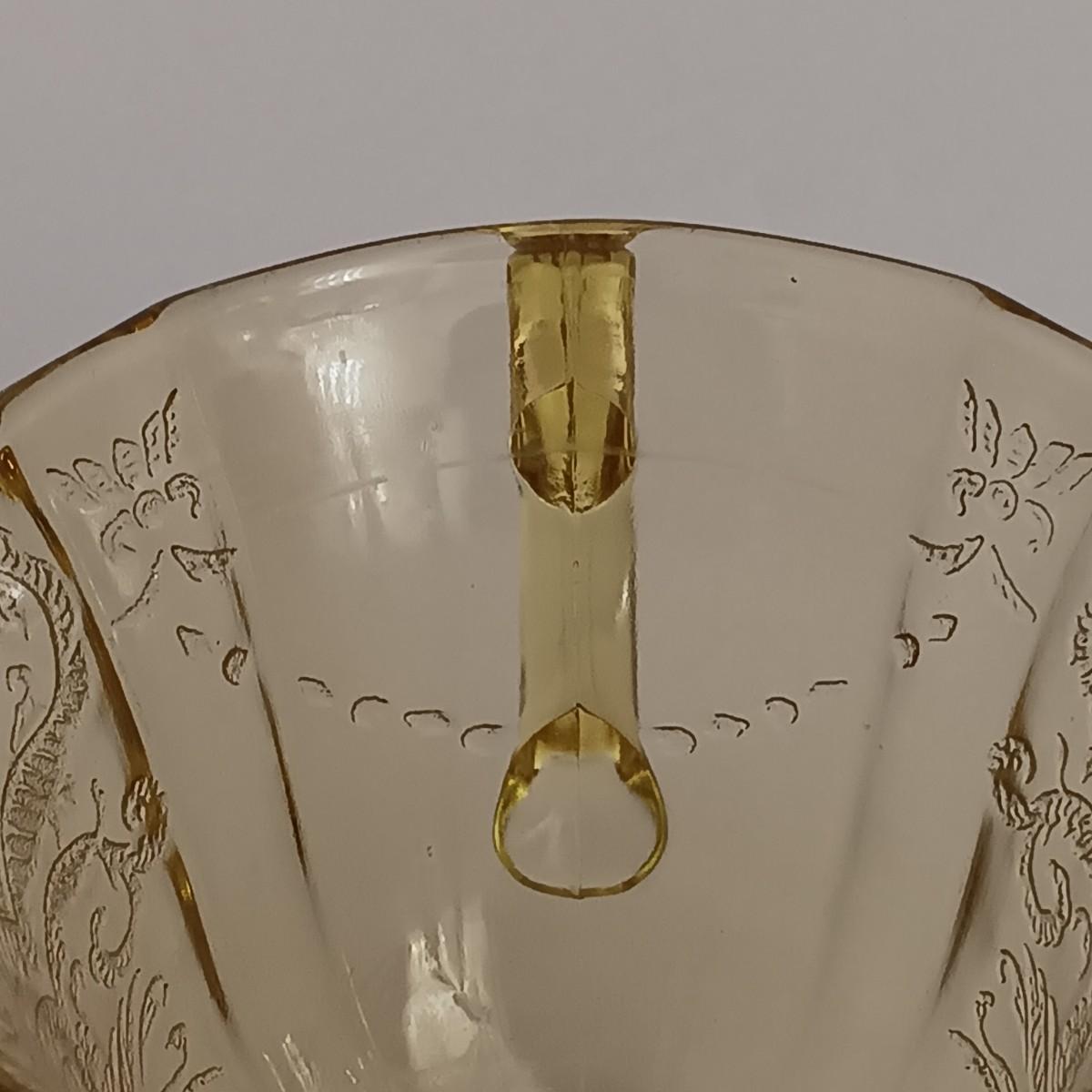 LOT 111: Yellow Depression Glass Madrid Pattern Cups, Cream & Sugar Bowls, Compote Glasses & More