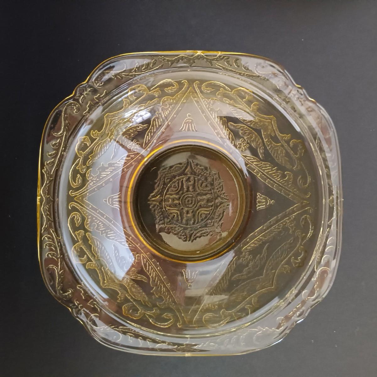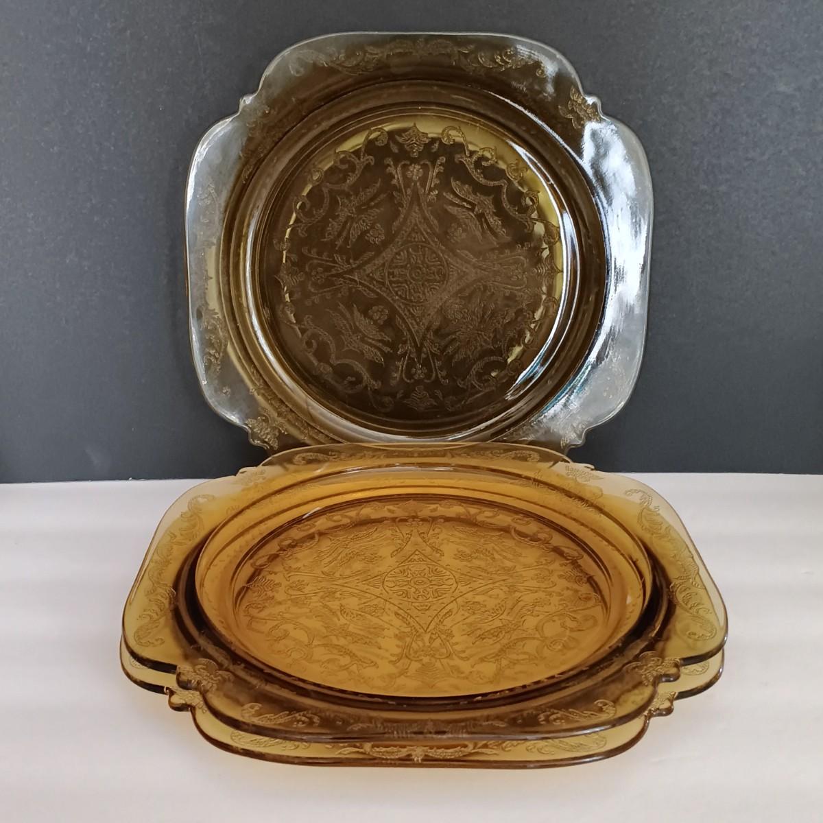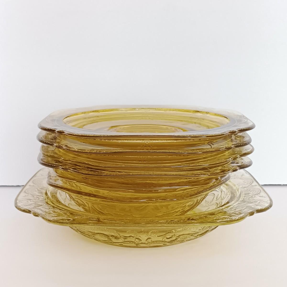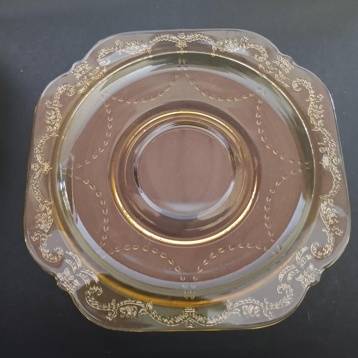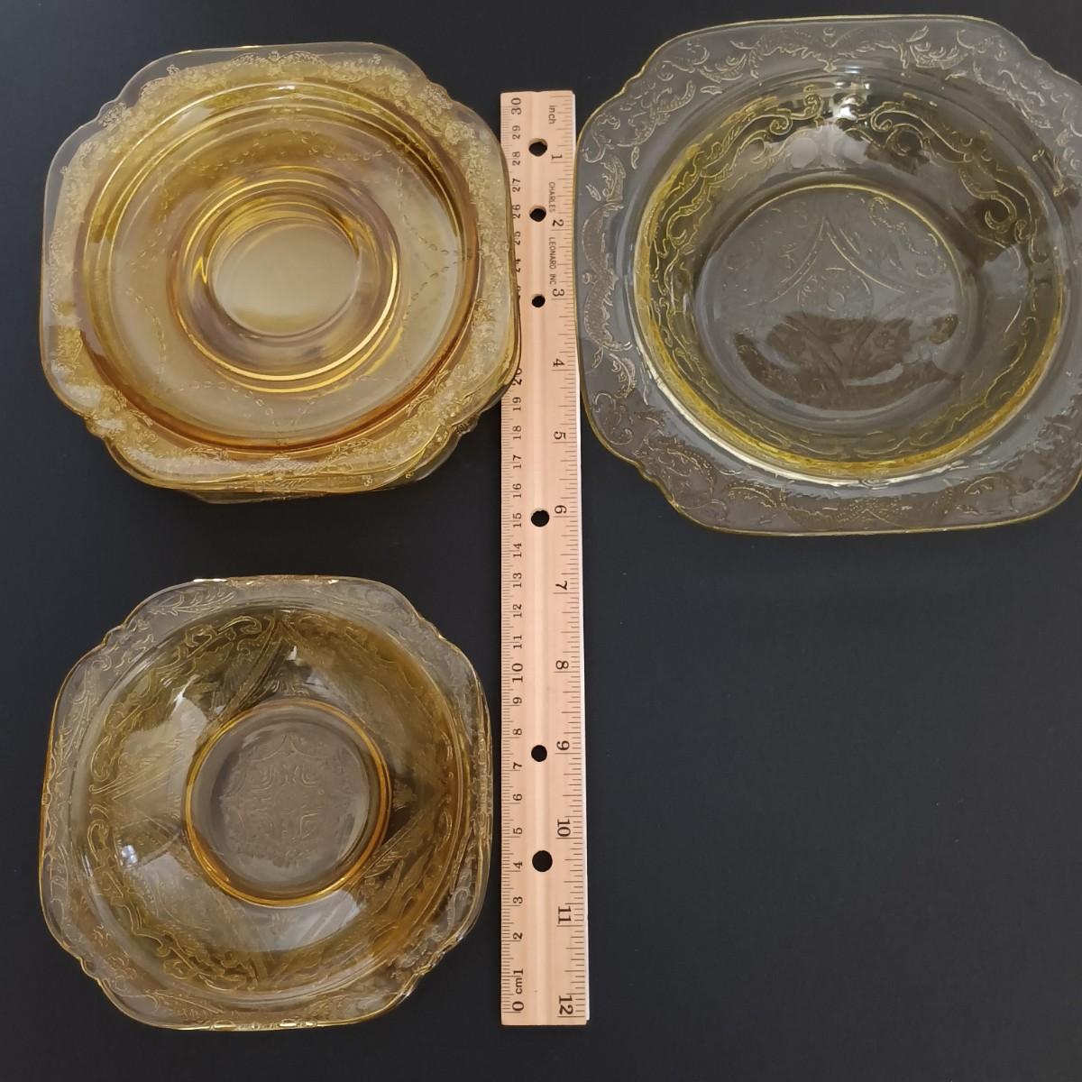 LOT 111: Yellow Depression Glass Madrid Pattern Cups, Cream & Sugar Bowls, Compote Glasses & More