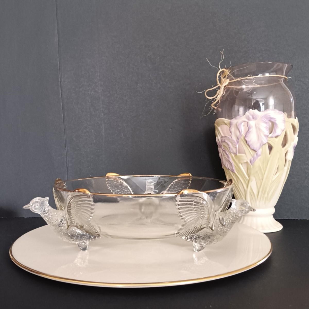 LOT 119: Lenox Iris Vase & Plate w/ Jeannette Glass Pheasant Bowl