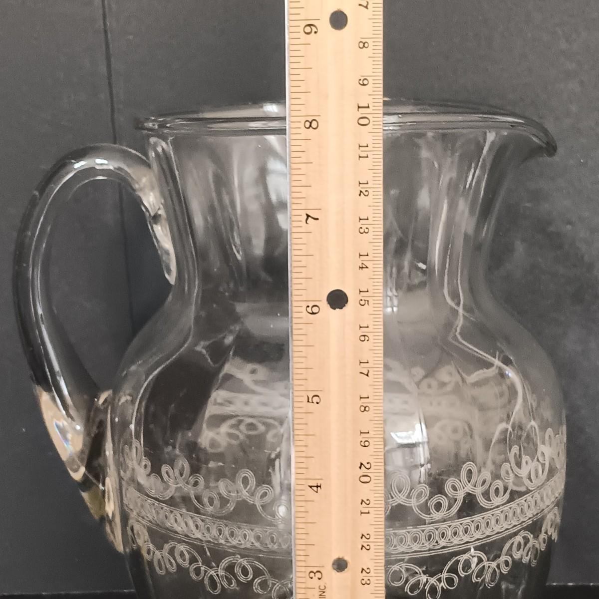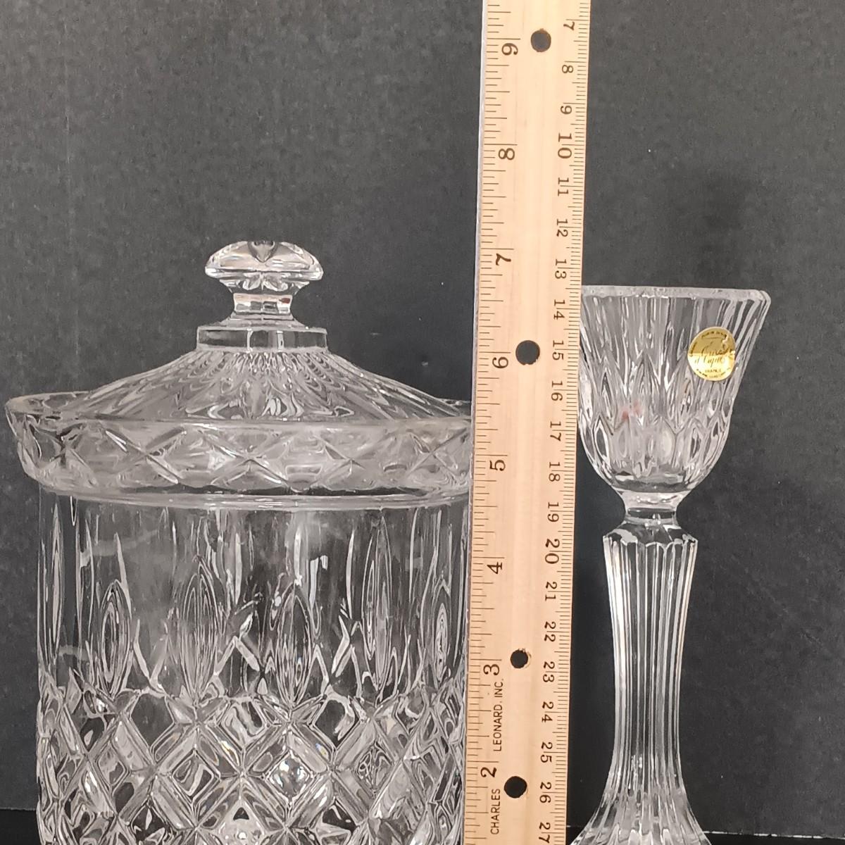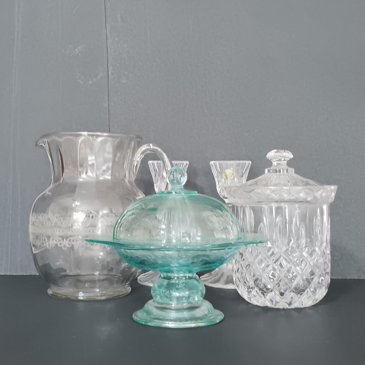 LOT 122: Aqua Blue Madrid Pattern Pedestal Dish with Cloverleaf Design Pitcher, Crystal Candlestick Holders & Biscuit Barrel