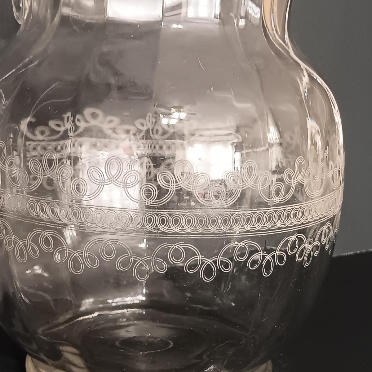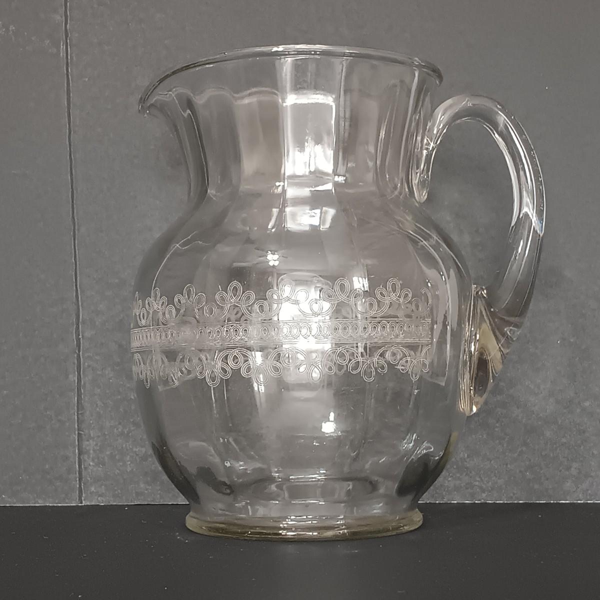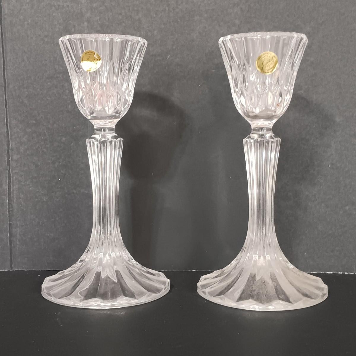LOT 122: Aqua Blue Madrid Pattern Pedestal Dish with Cloverleaf Design Pitcher, Crystal Candlestick Holders & Biscuit Barrel