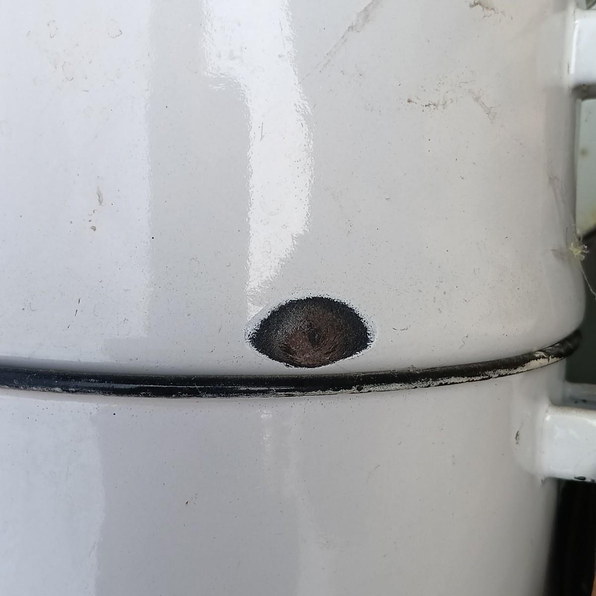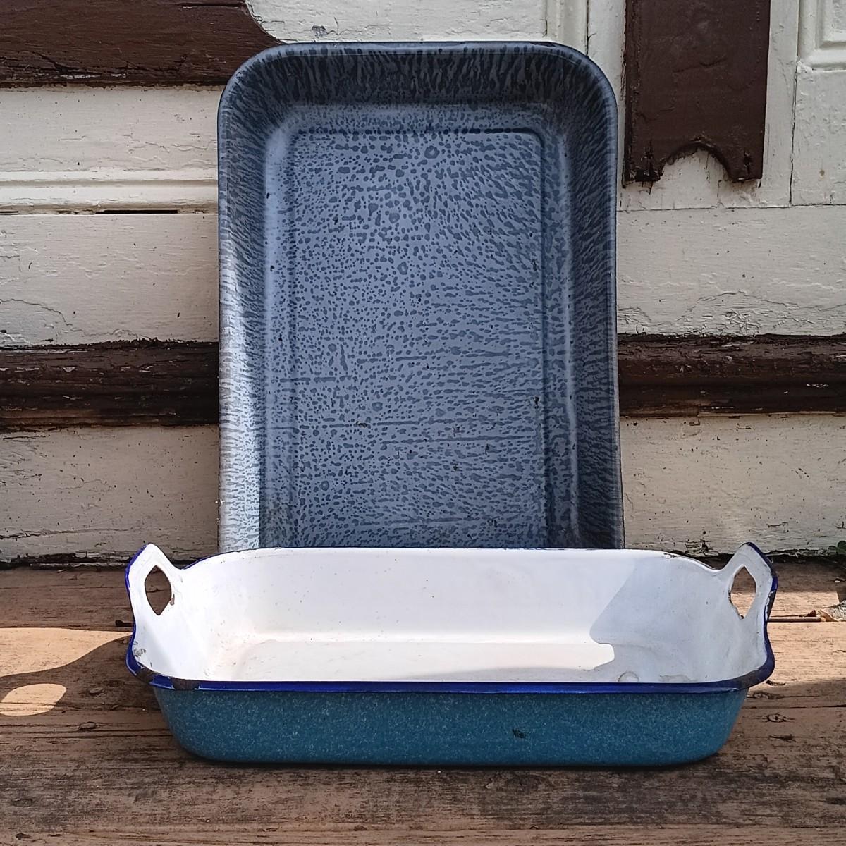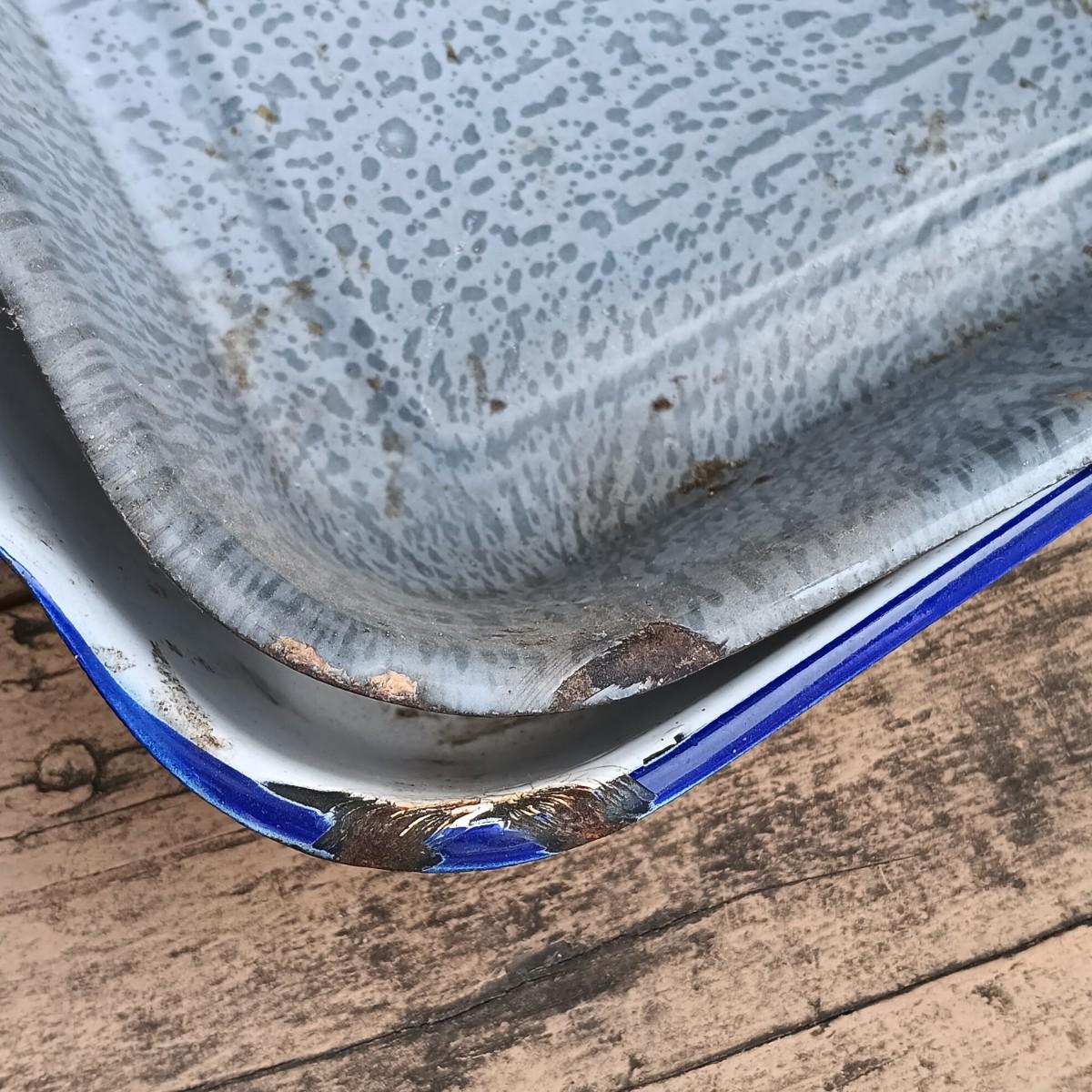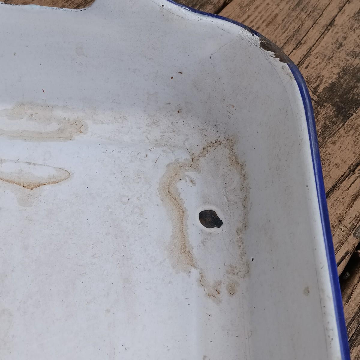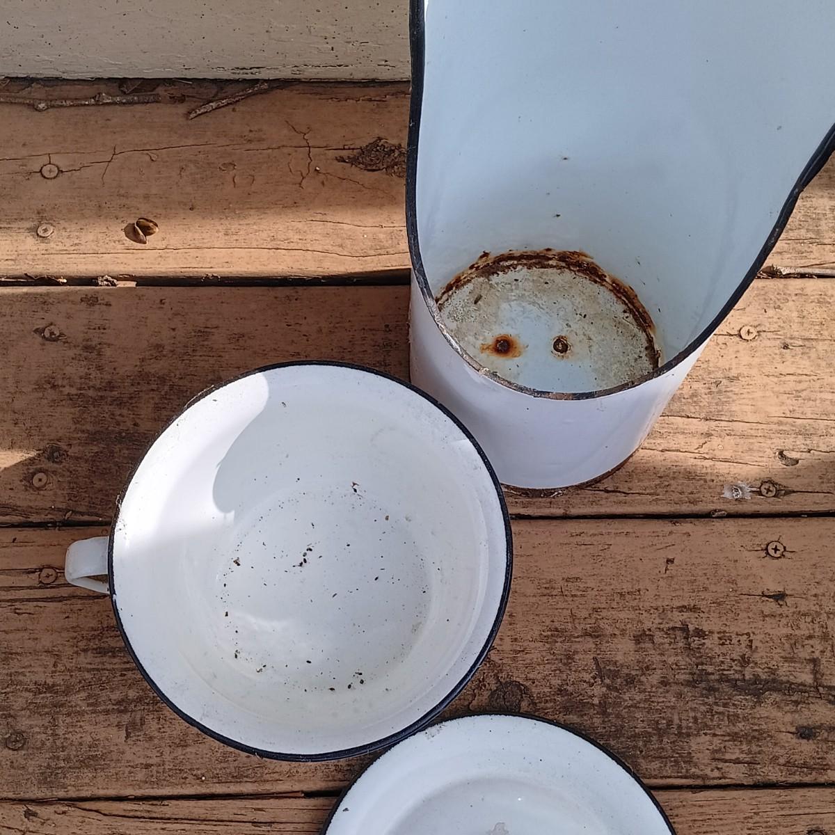 Enamelware and Ceramic has large chips and scratches from age and previous use.