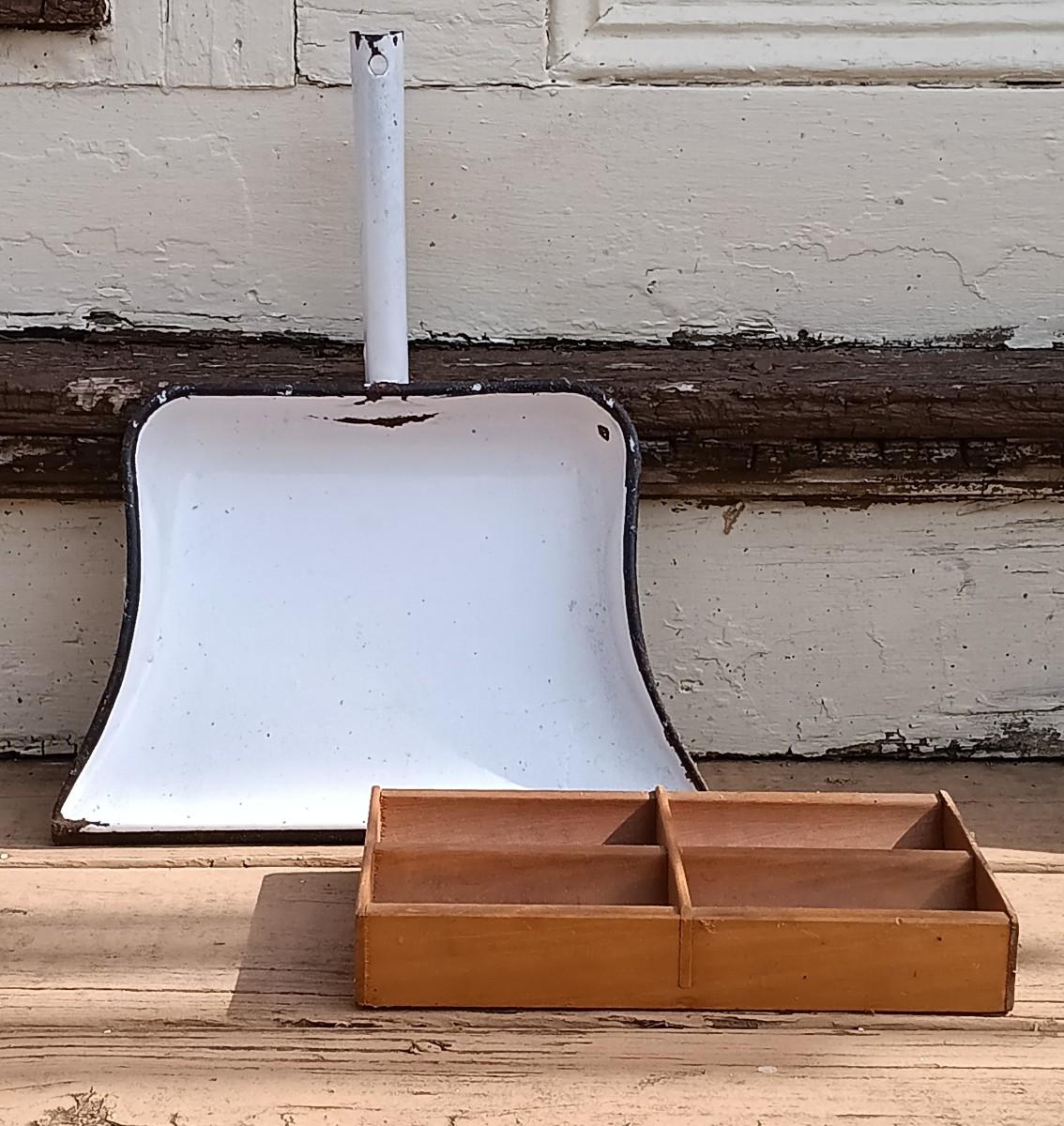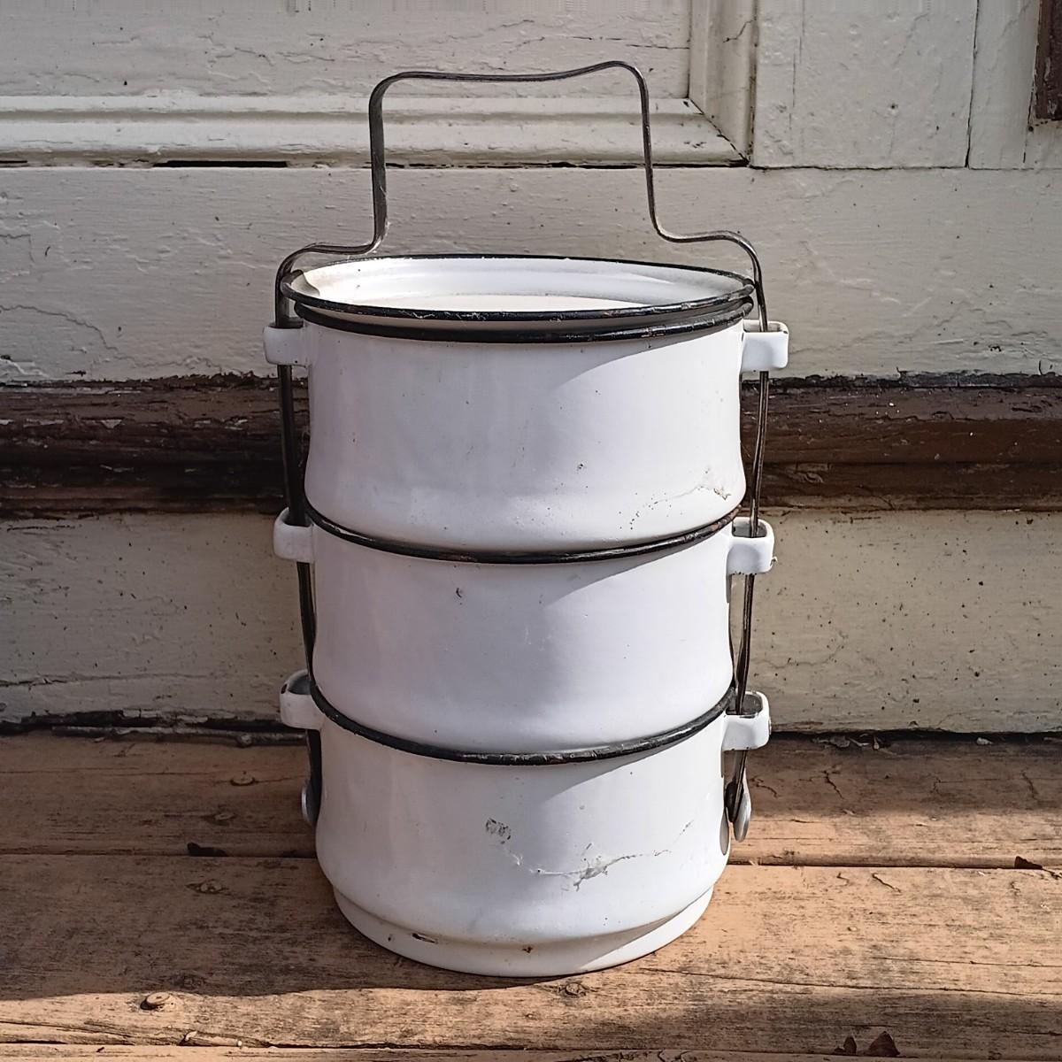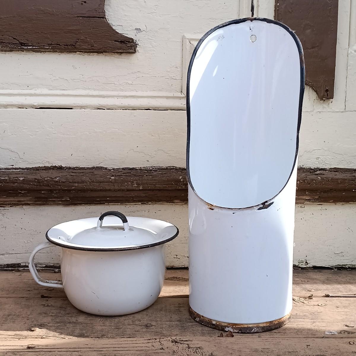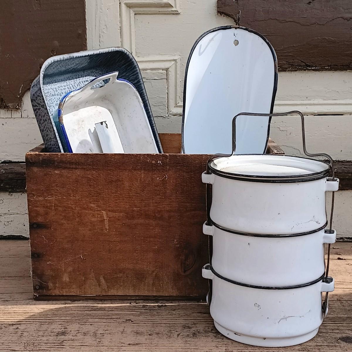 LOT 125: Vintage Orchard Crate w/ Enamel Tiffin Lunchbox, Chamberpot, Planter & More