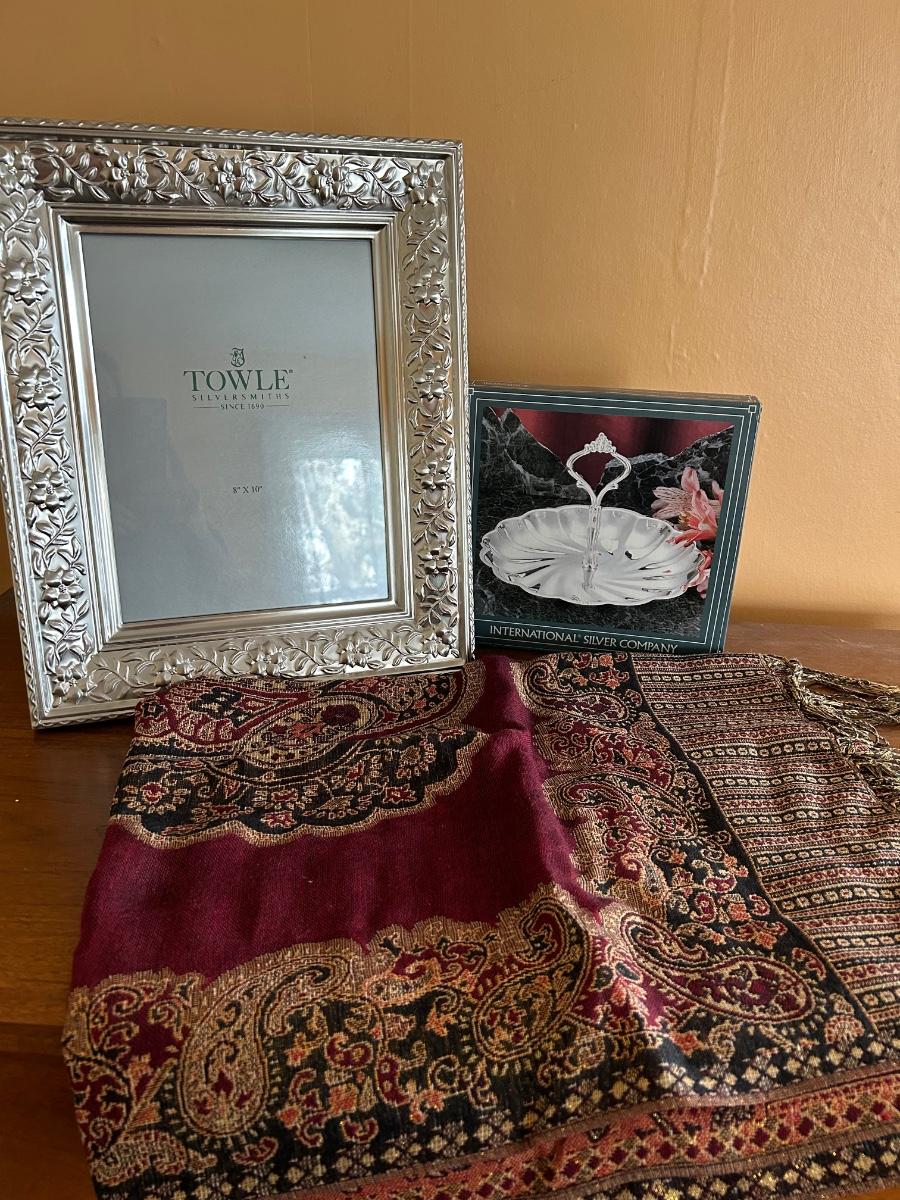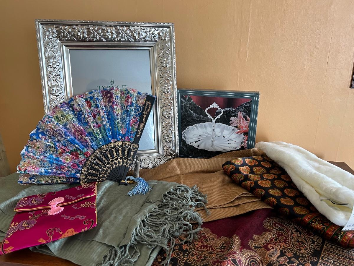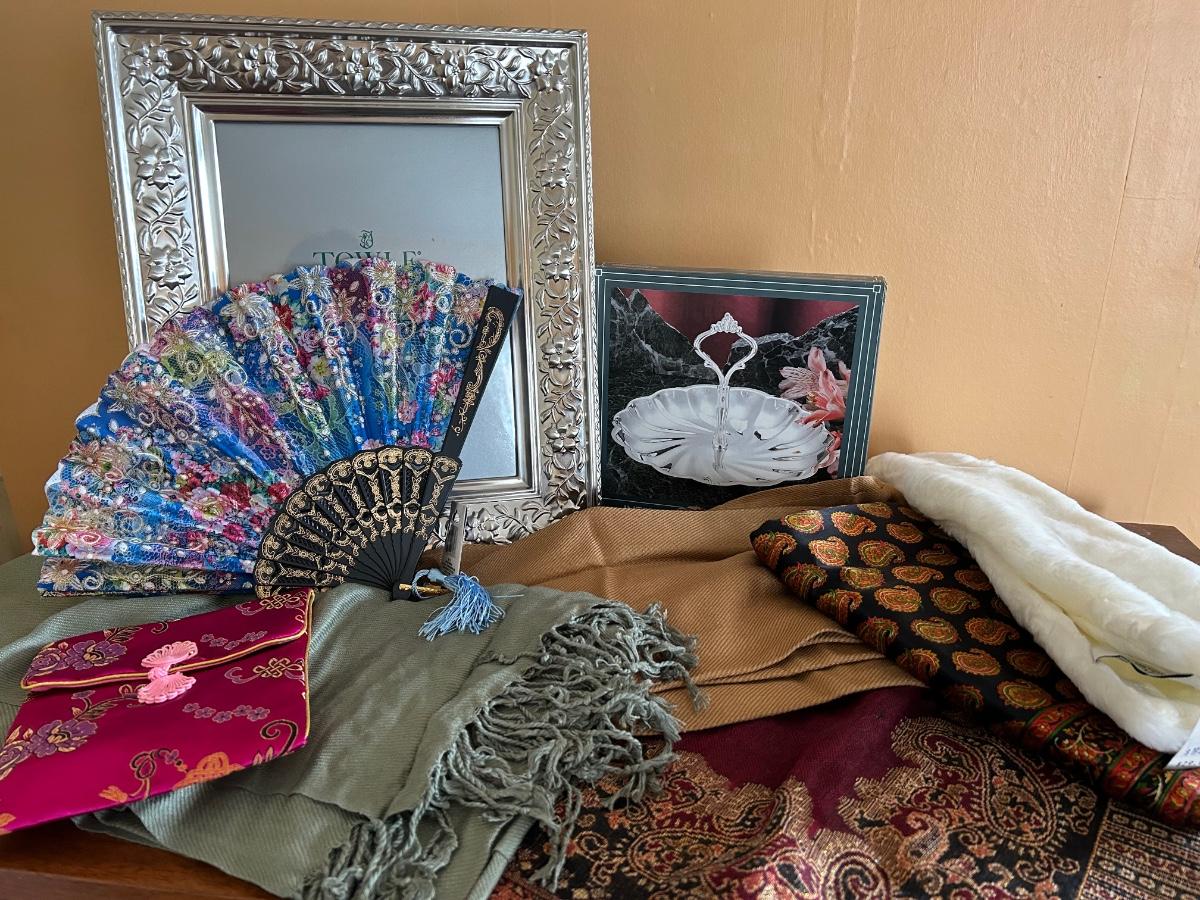 LOT 140: Women's Scarves, Picture Frame, Jewlry Tray and More