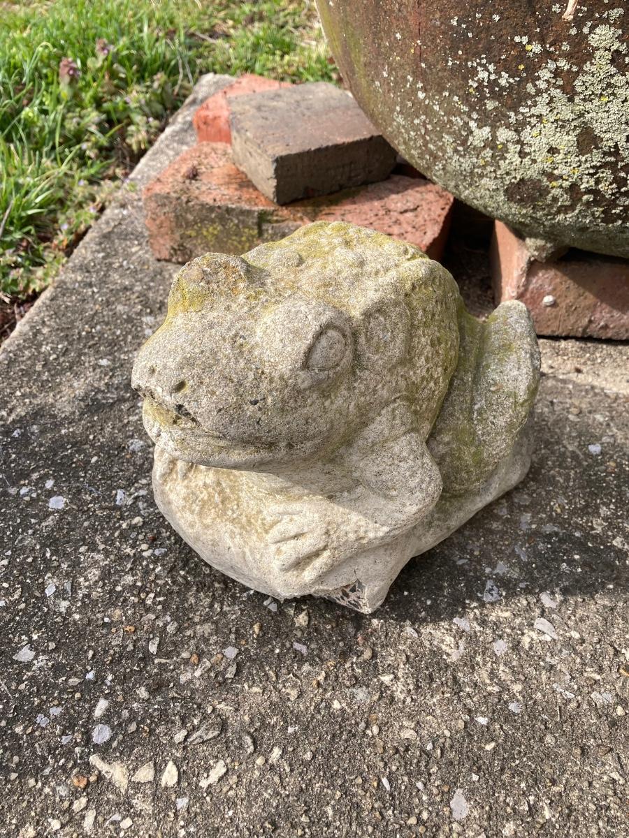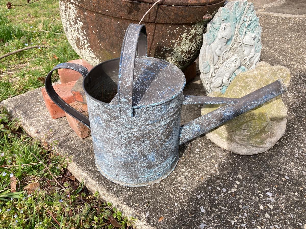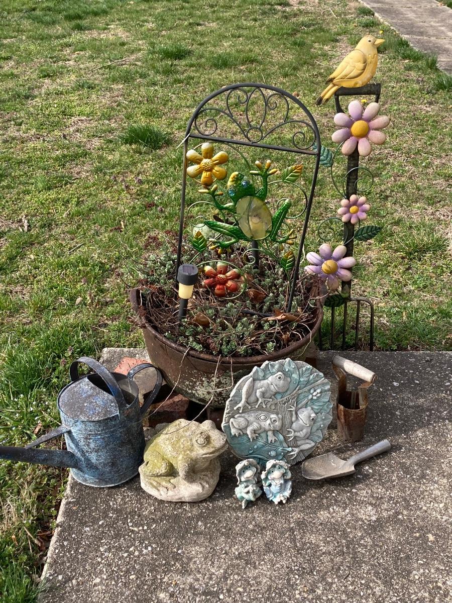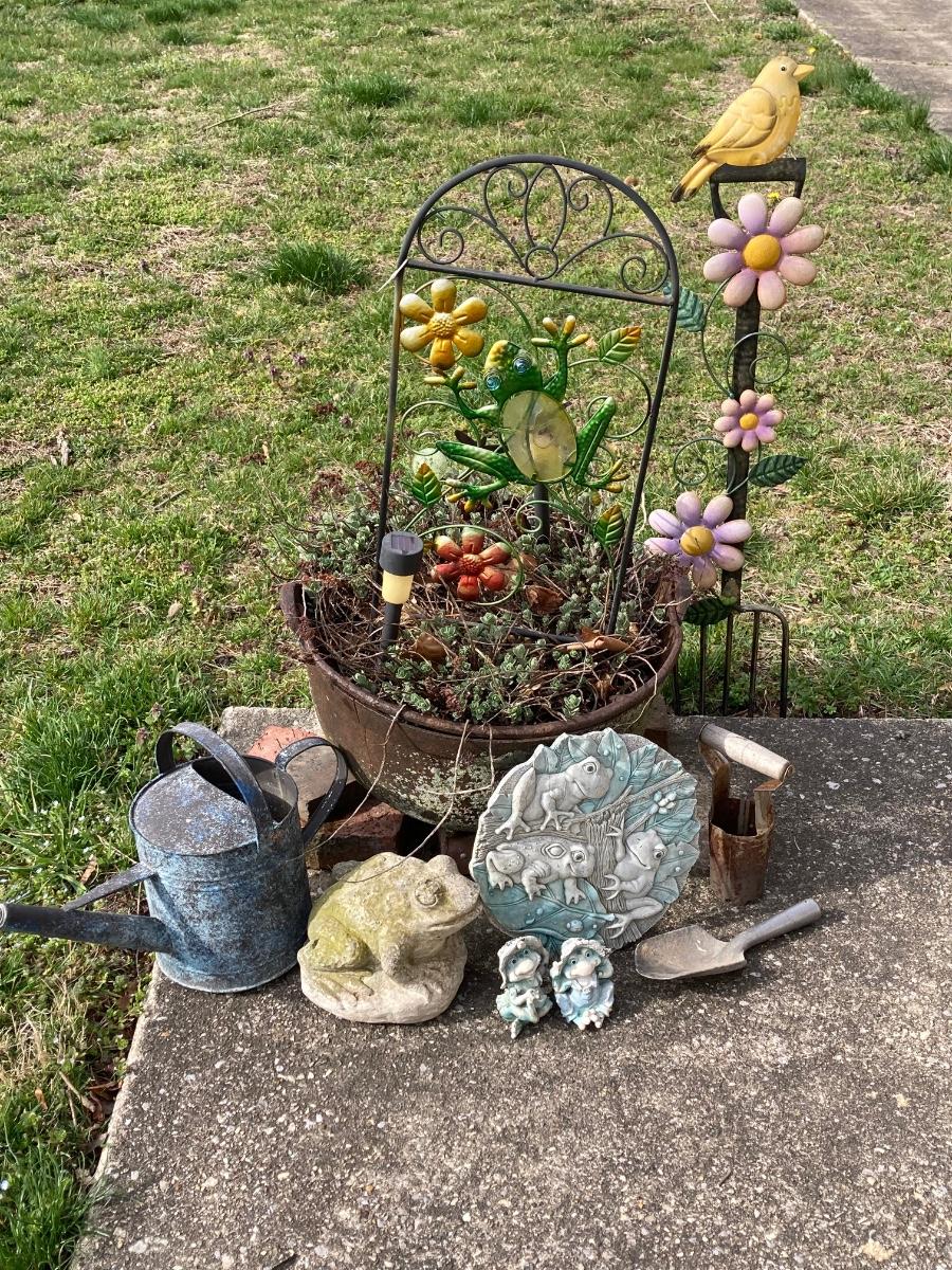 LOT 163: Vintage Outdoor Garden Decor - Concrete Frog, Cast Iron Cauldron with Handle, Tools, Watering Can and More
