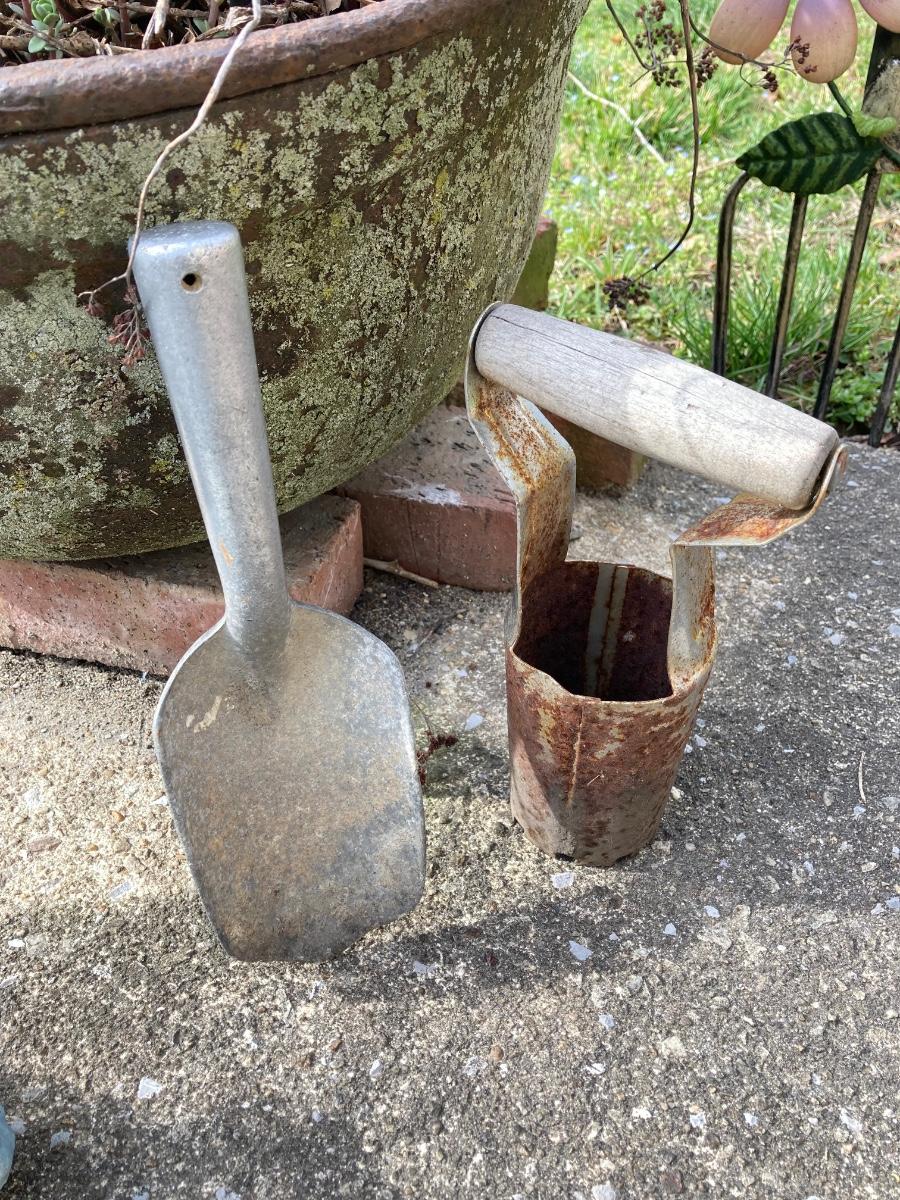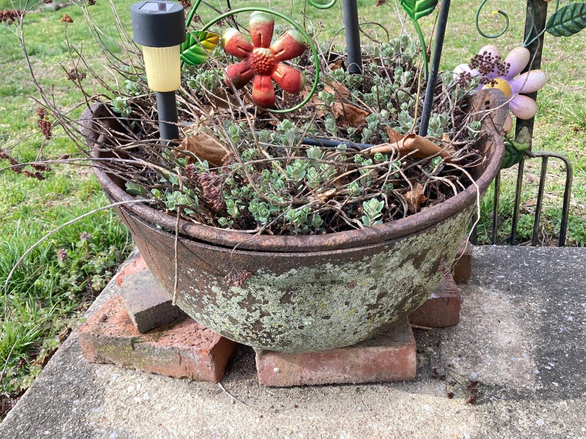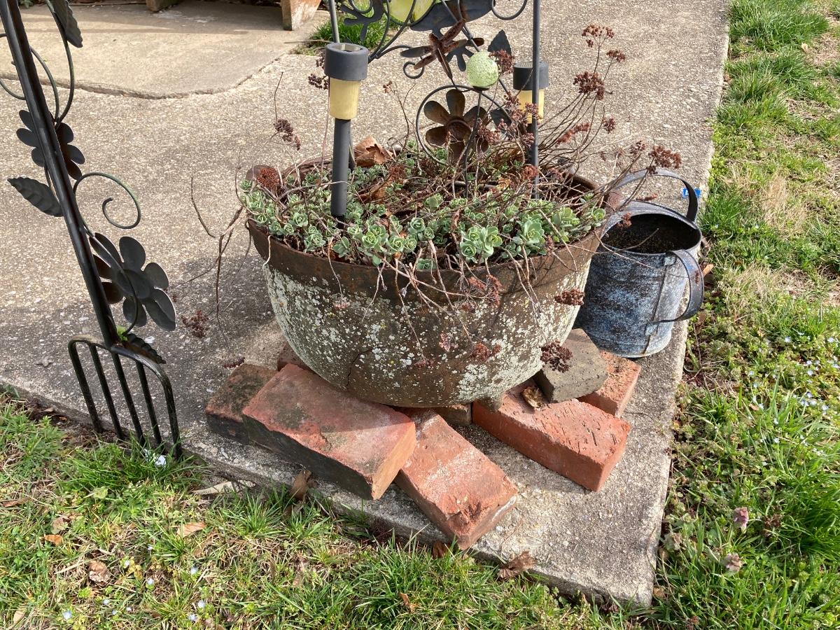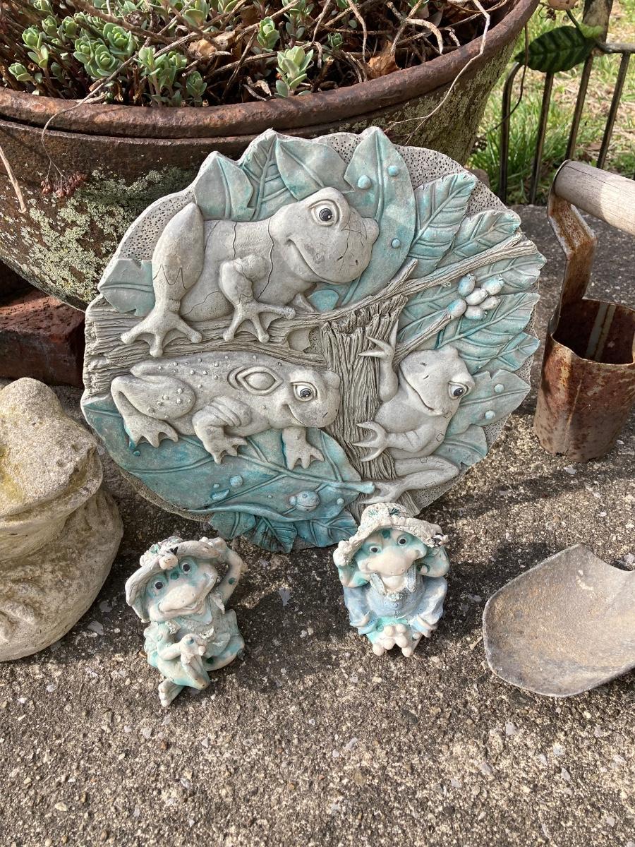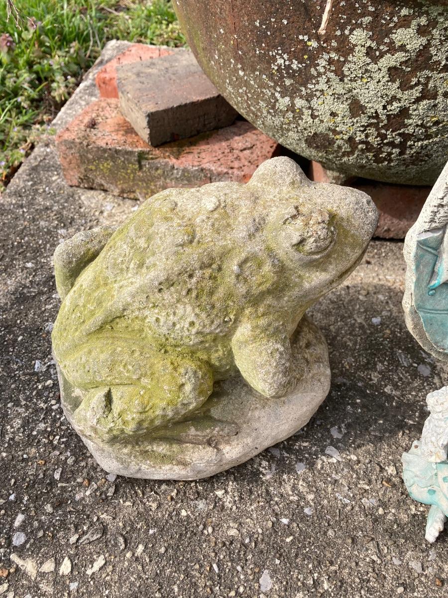 LOT 163: Vintage Outdoor Garden Decor - Concrete Frog, Cast Iron Cauldron with Handle, Tools, Watering Can and More