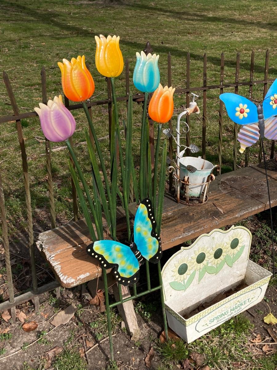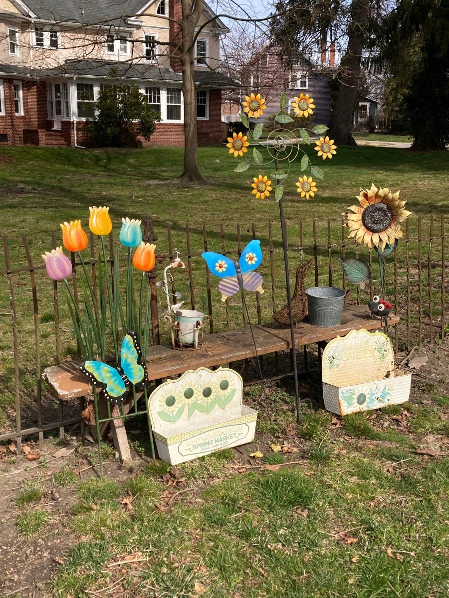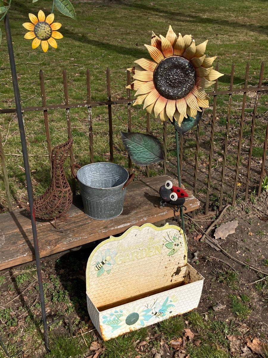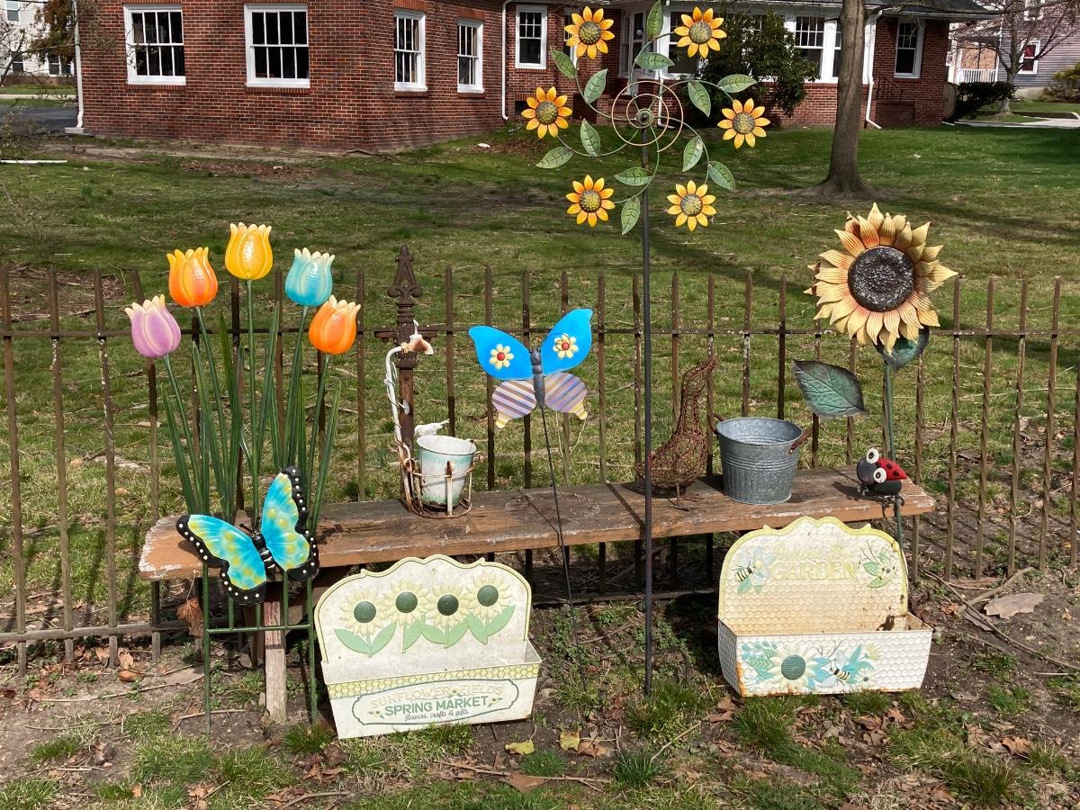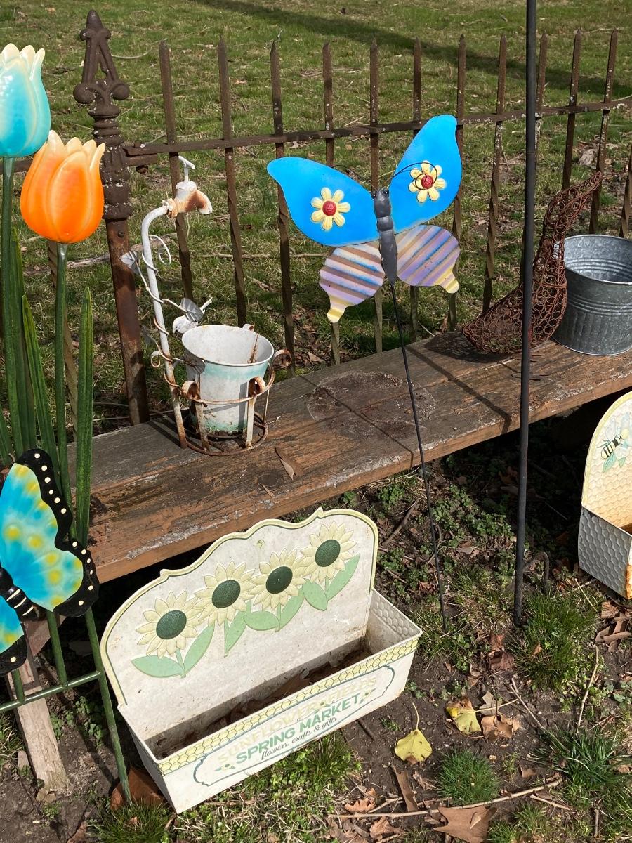 LOT 167: Wooden Bench with Collection of Outdoor Lawn / Garden Decor