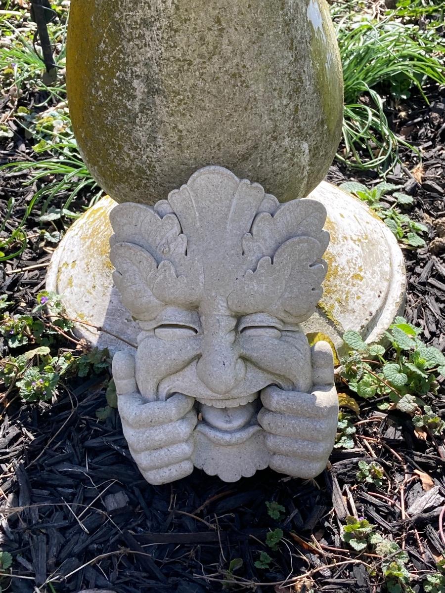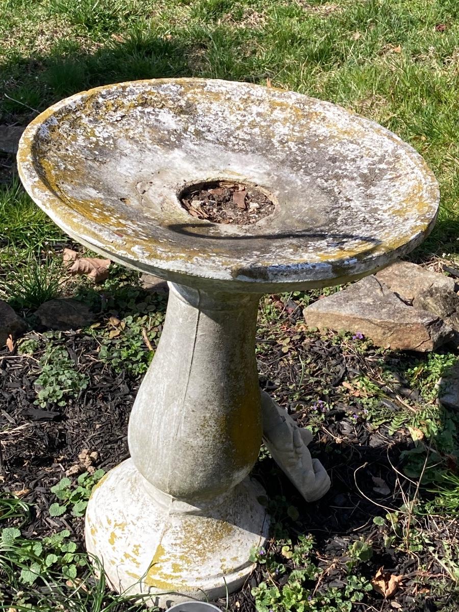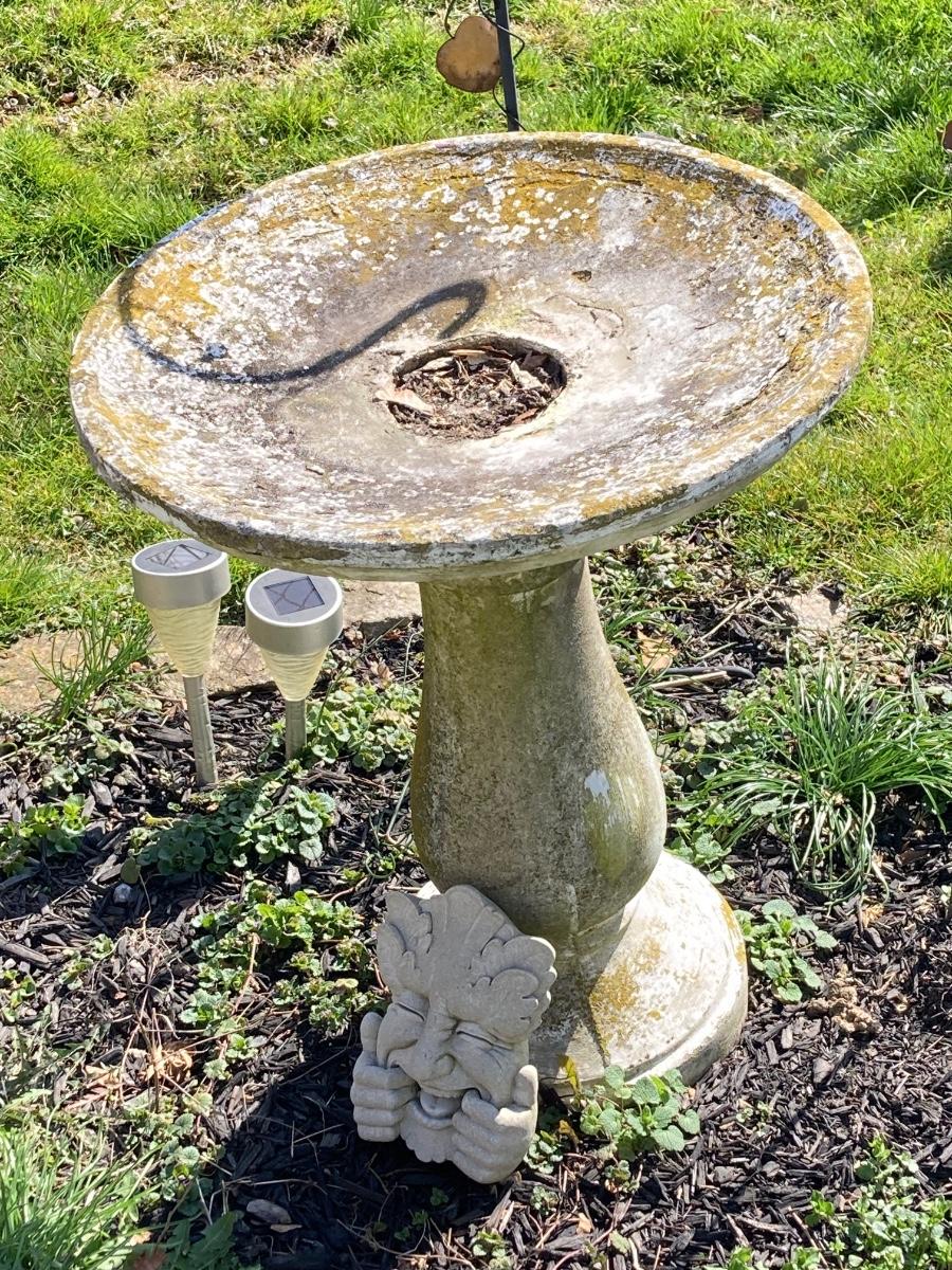 LOT 185: Vintage Concrete Bird Bath, Too Much Fun Garden Wall Art and More