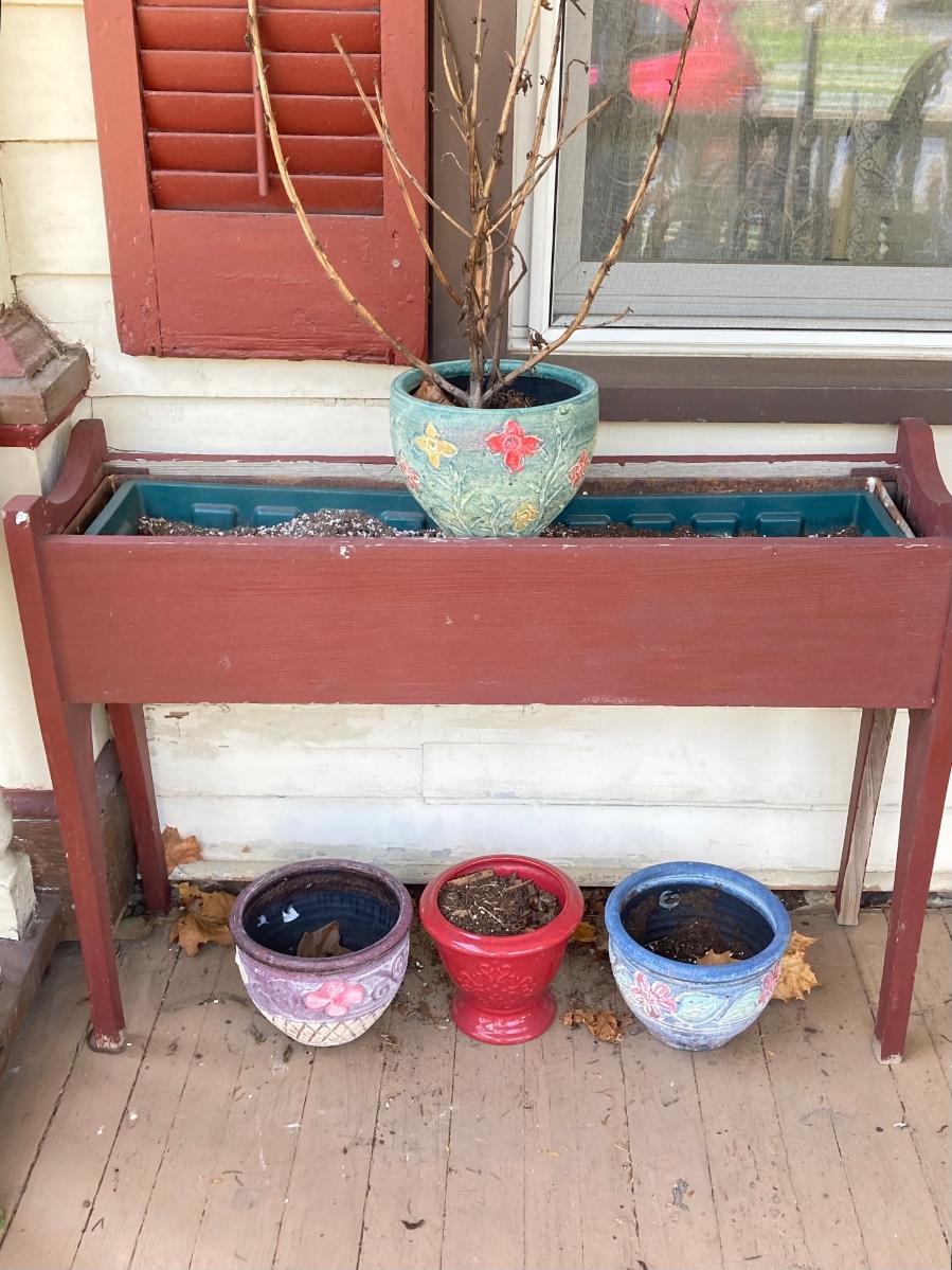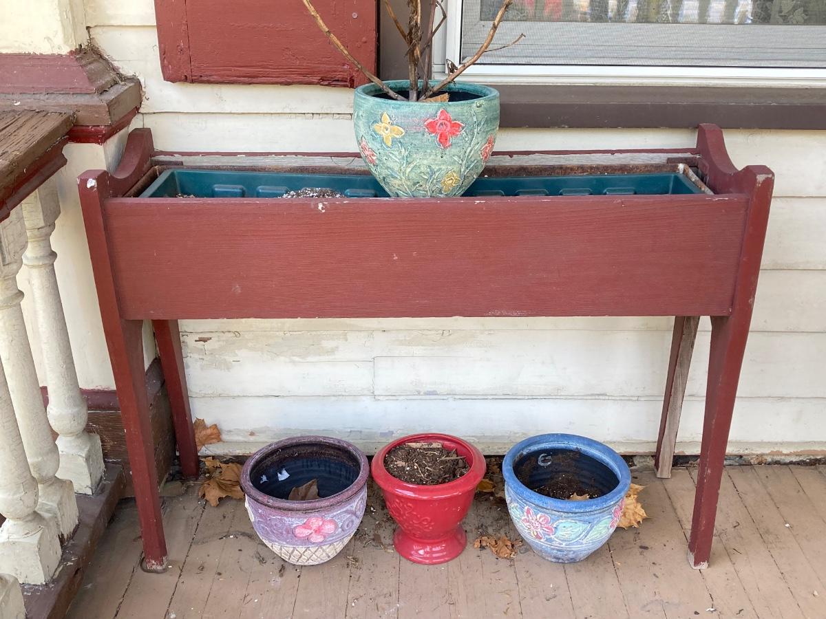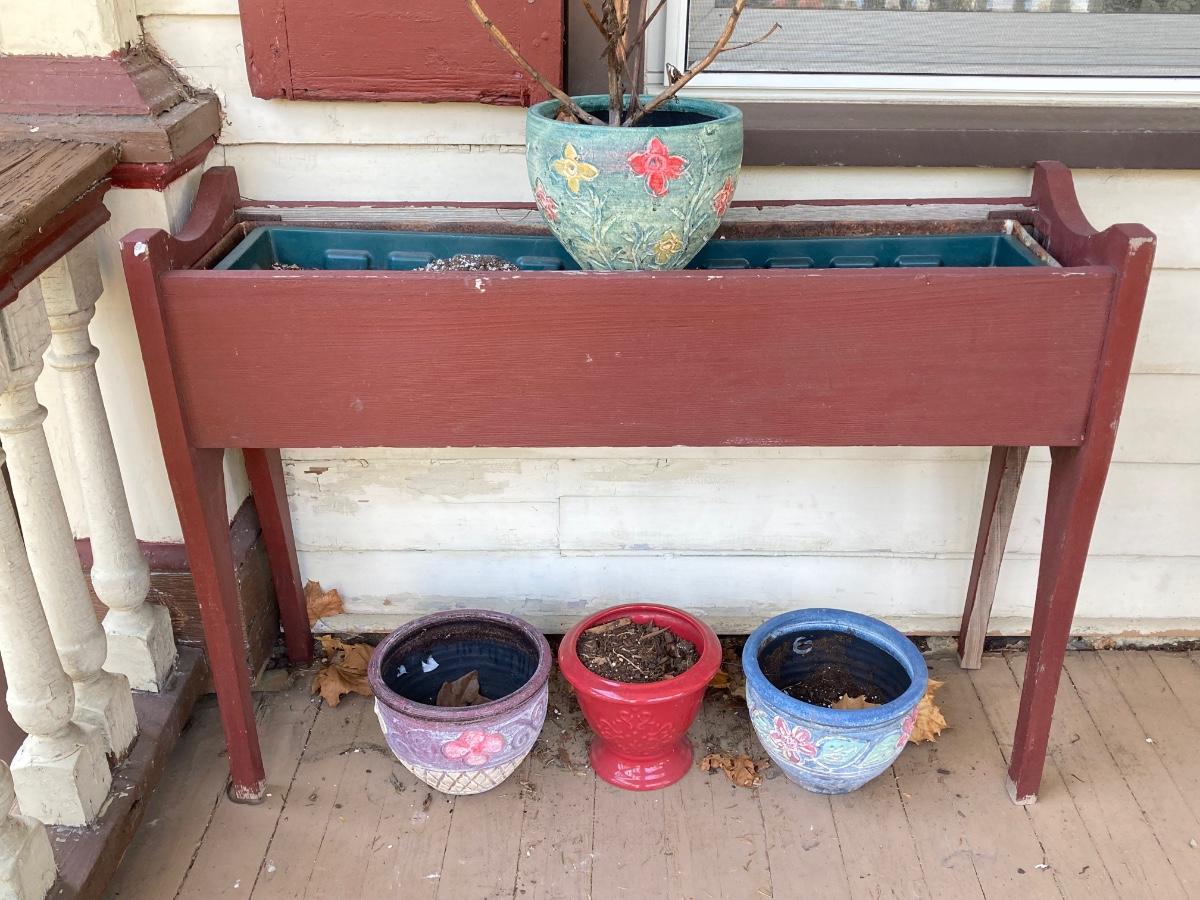 LOT 188: Wooden Patio Planter with Collection of Decorative Pots