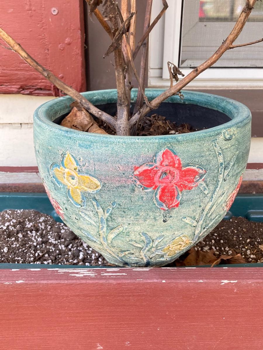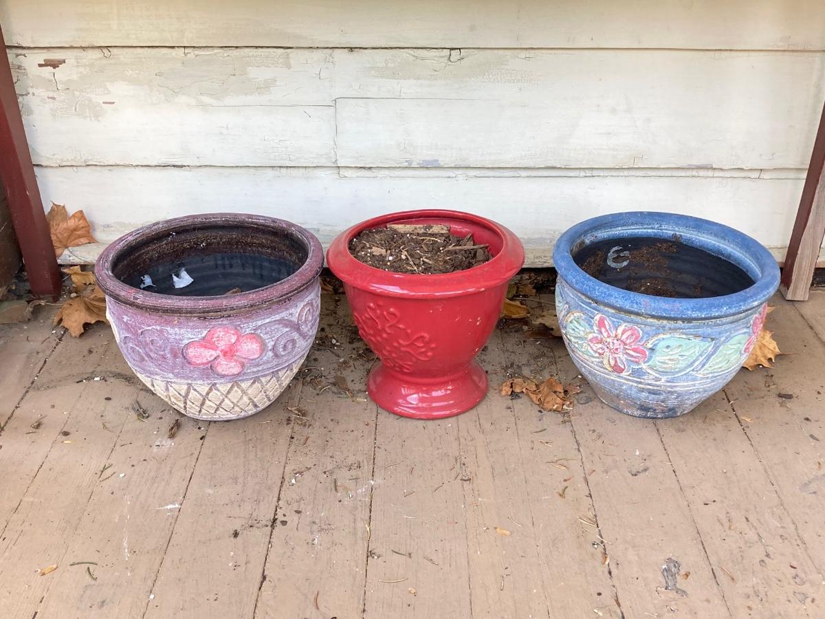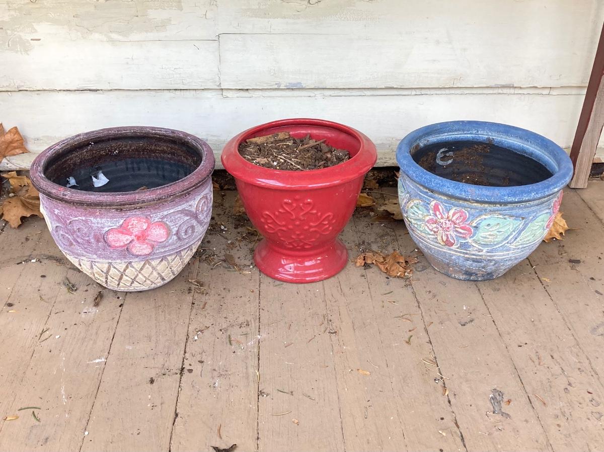 LOT 188: Wooden Patio Planter with Collection of Decorative Pots
