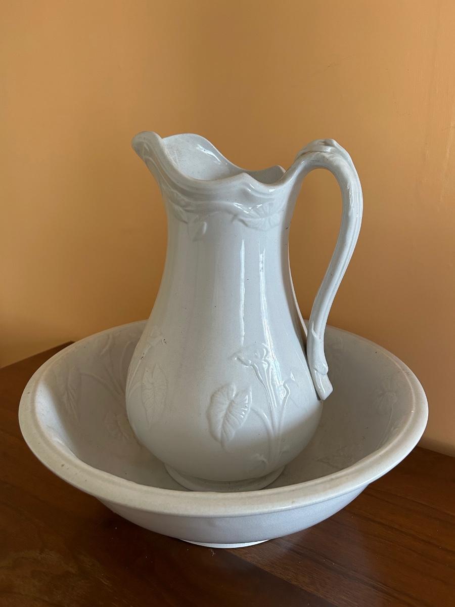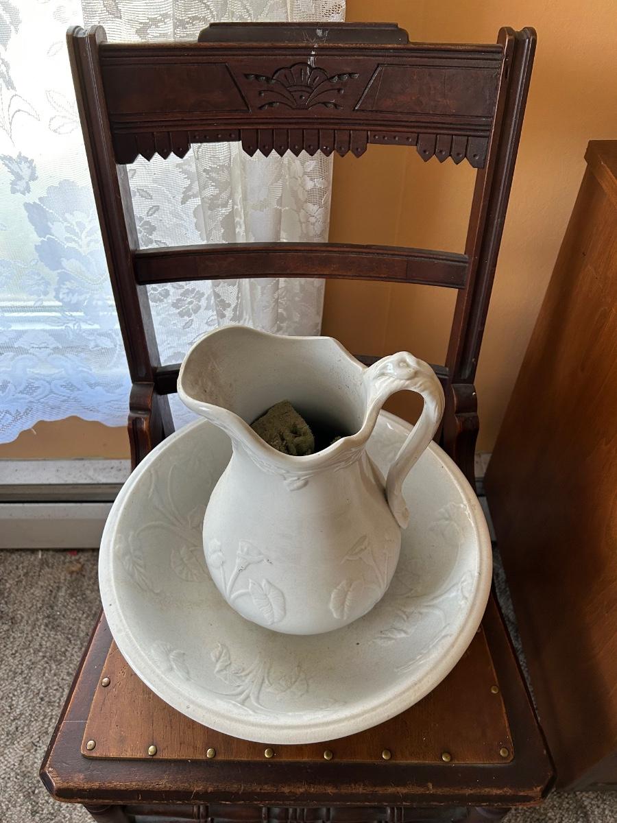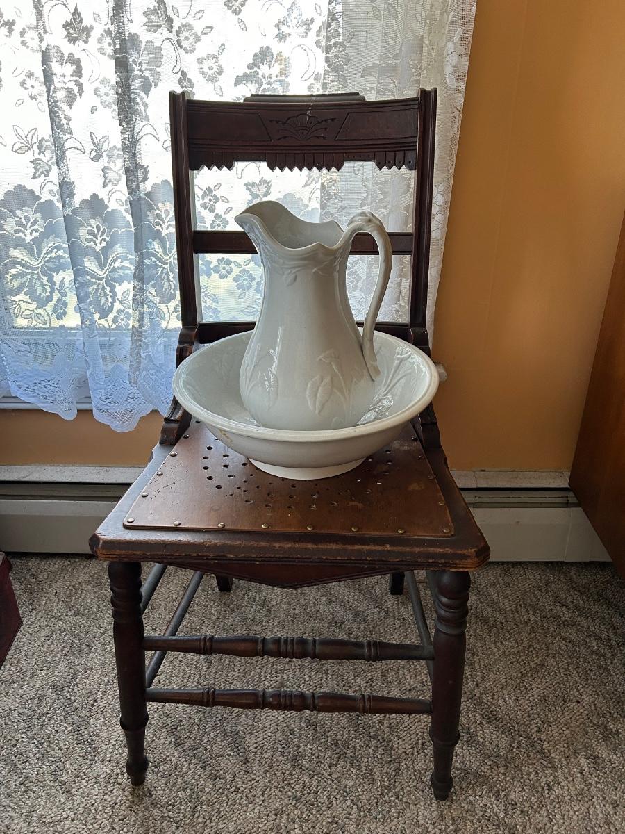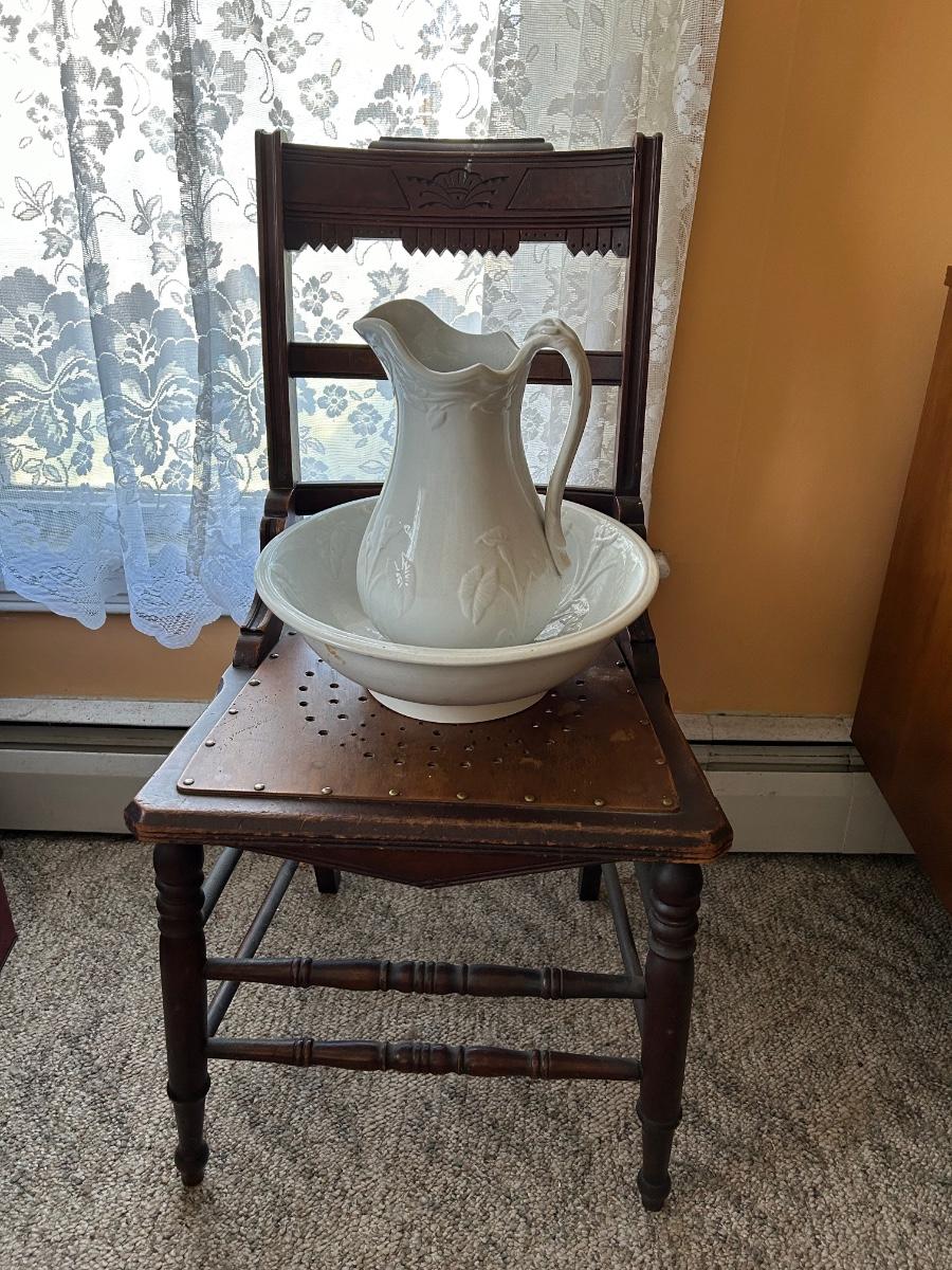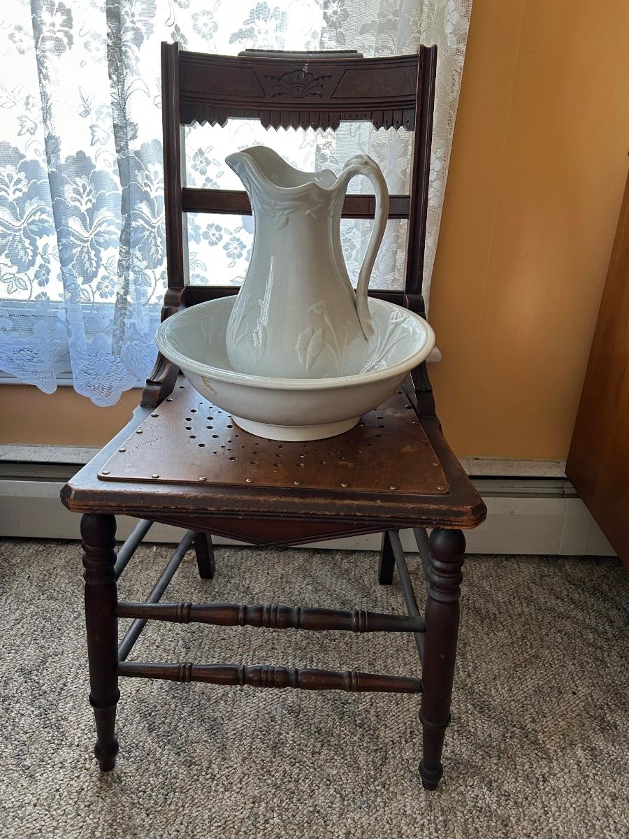 LOT 201: Vintage Chair and Bowl & Pitcher Set