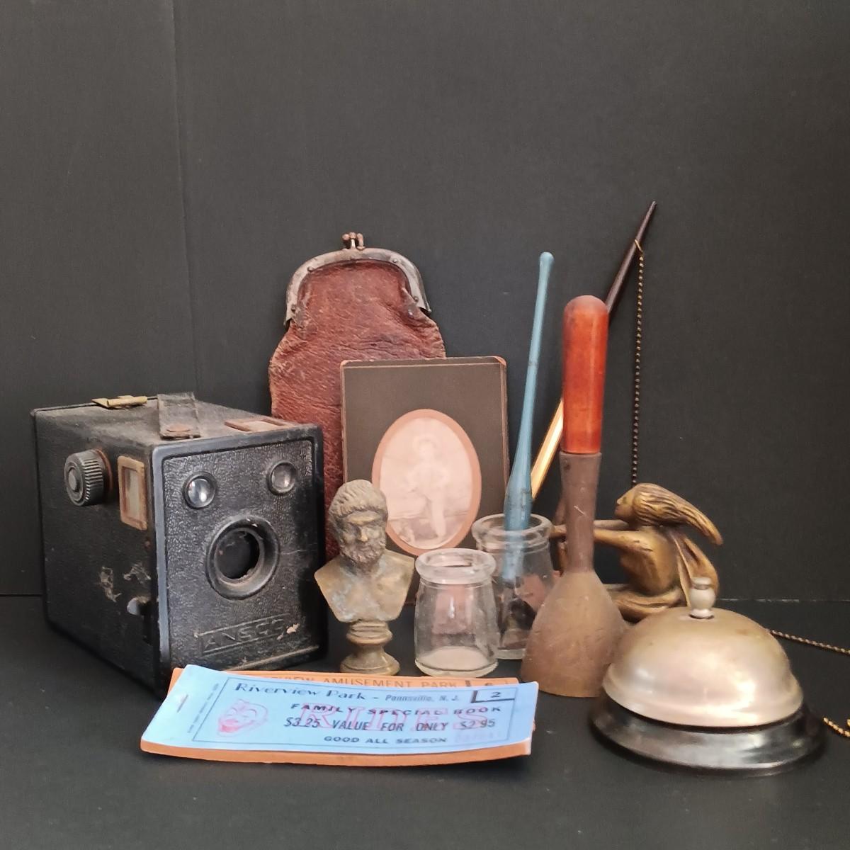 LOT 223: Ansco B2 Film Box Camera, Etched Brass Handbell, Mini Statues & More