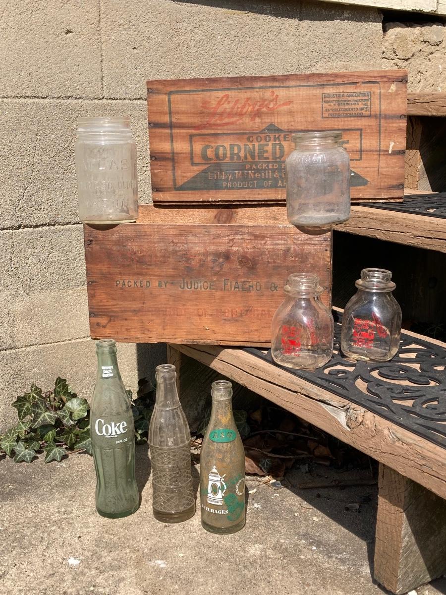LOT 247: Vintage Wooden Boxes, Glass Bottles and Jars