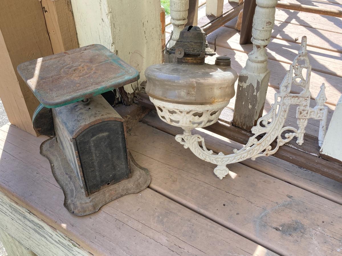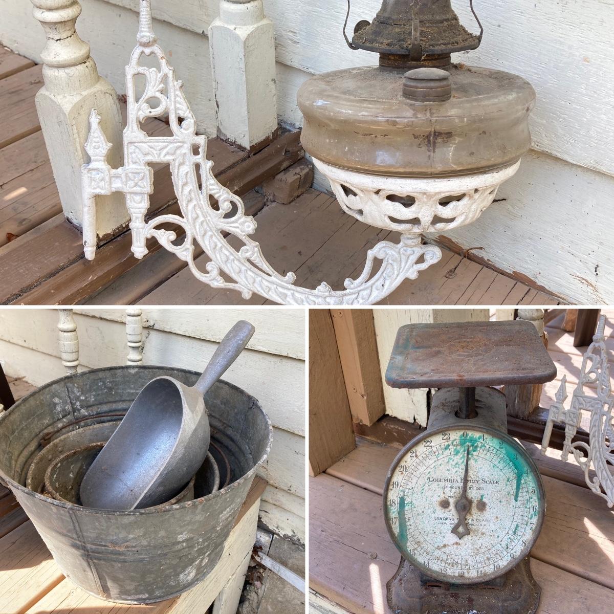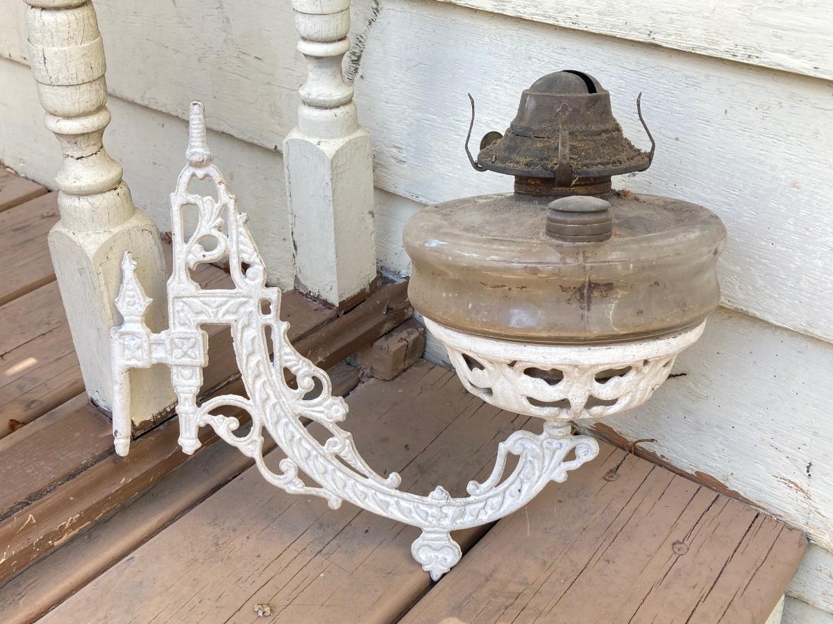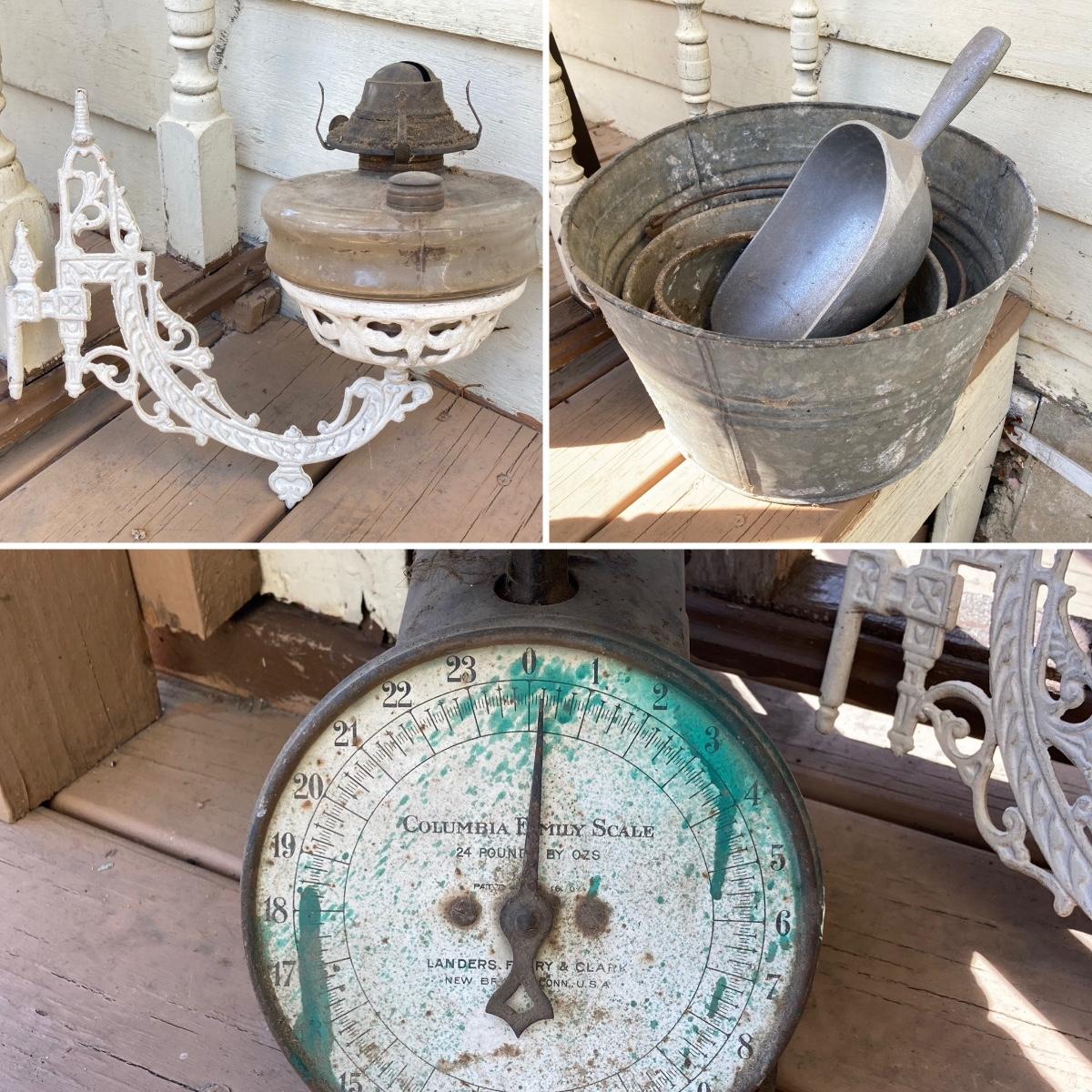 LOT 248: Antique Cast Iron Ornate Swing Arm Wall Lamp, Vintage Columbia Scale, Metal / Aluminum Buckets and Scoop