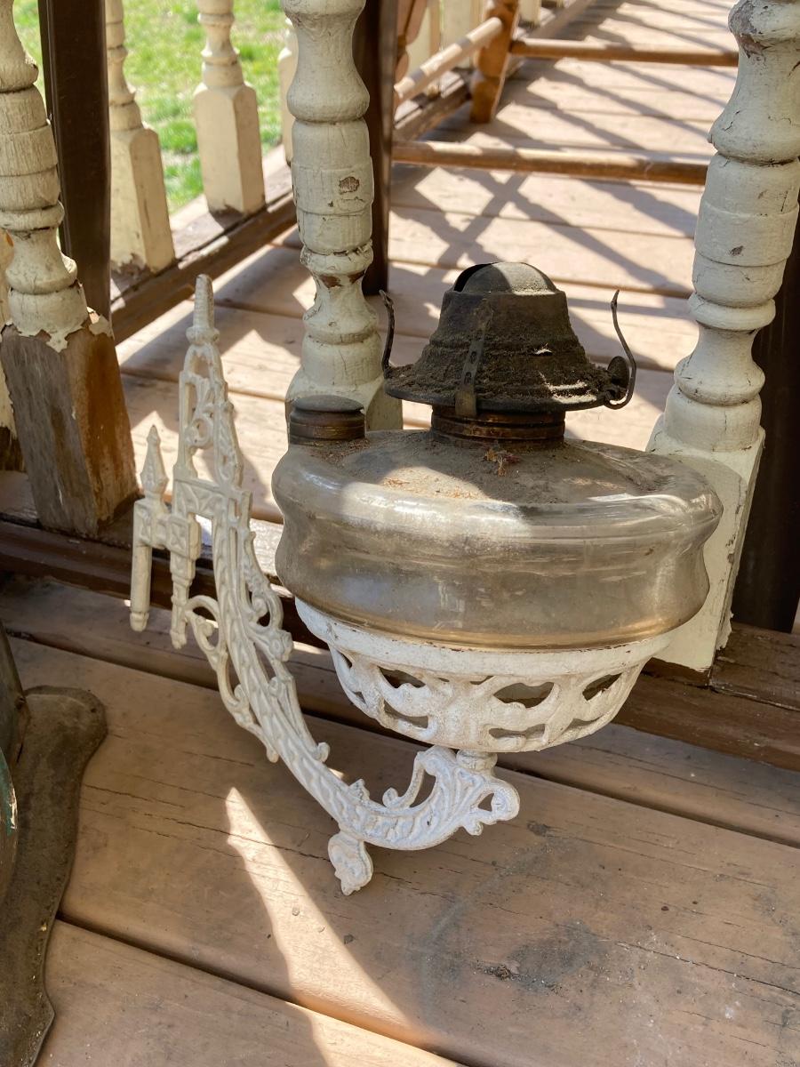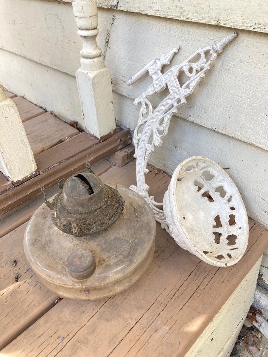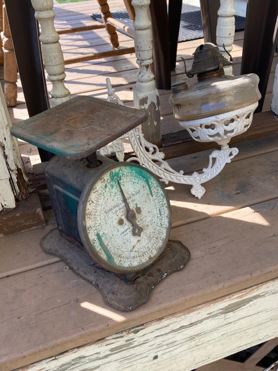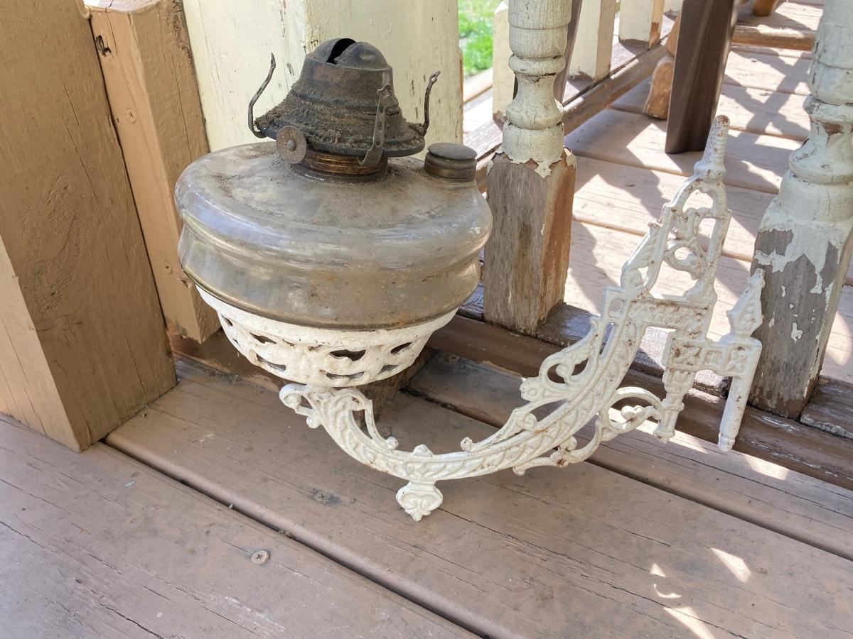 LOT 248: Antique Cast Iron Ornate Swing Arm Wall Lamp, Vintage Columbia Scale, Metal / Aluminum Buckets and Scoop