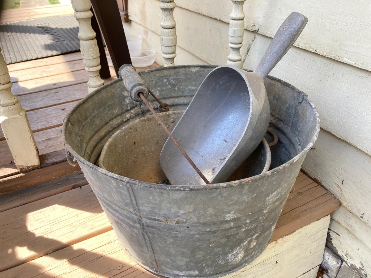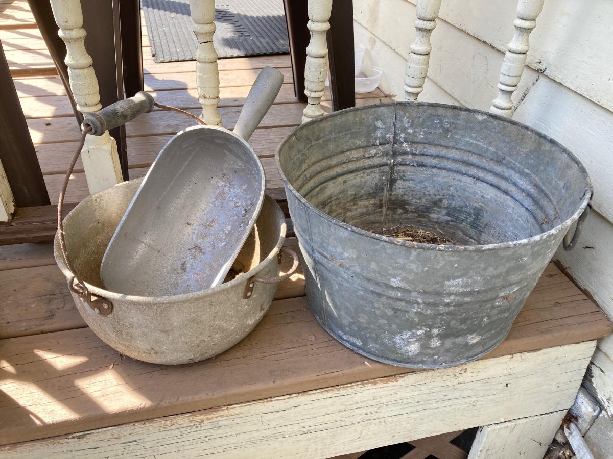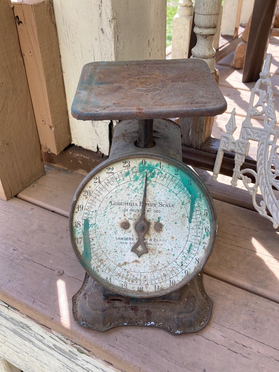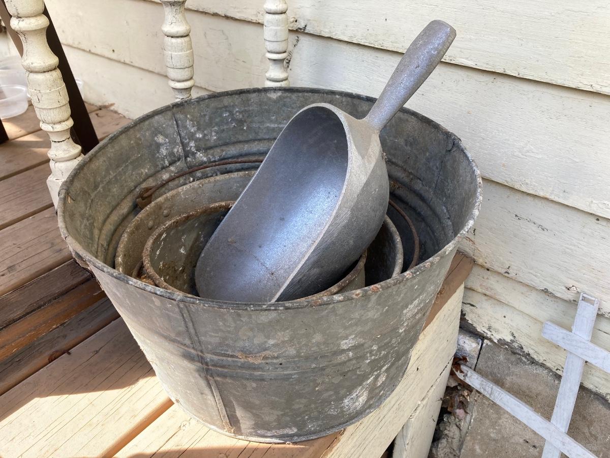 LOT 248: Antique Cast Iron Ornate Swing Arm Wall Lamp, Vintage Columbia Scale, Metal / Aluminum Buckets and Scoop