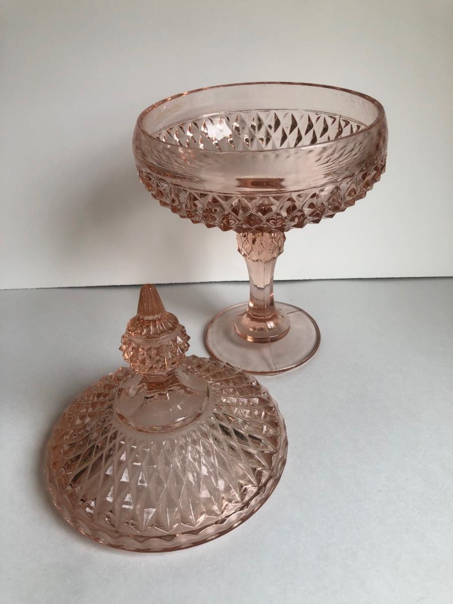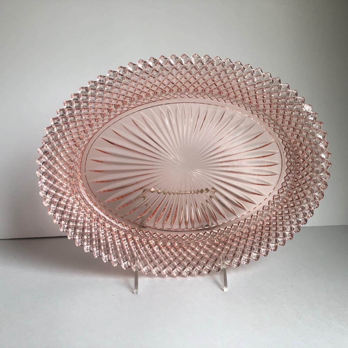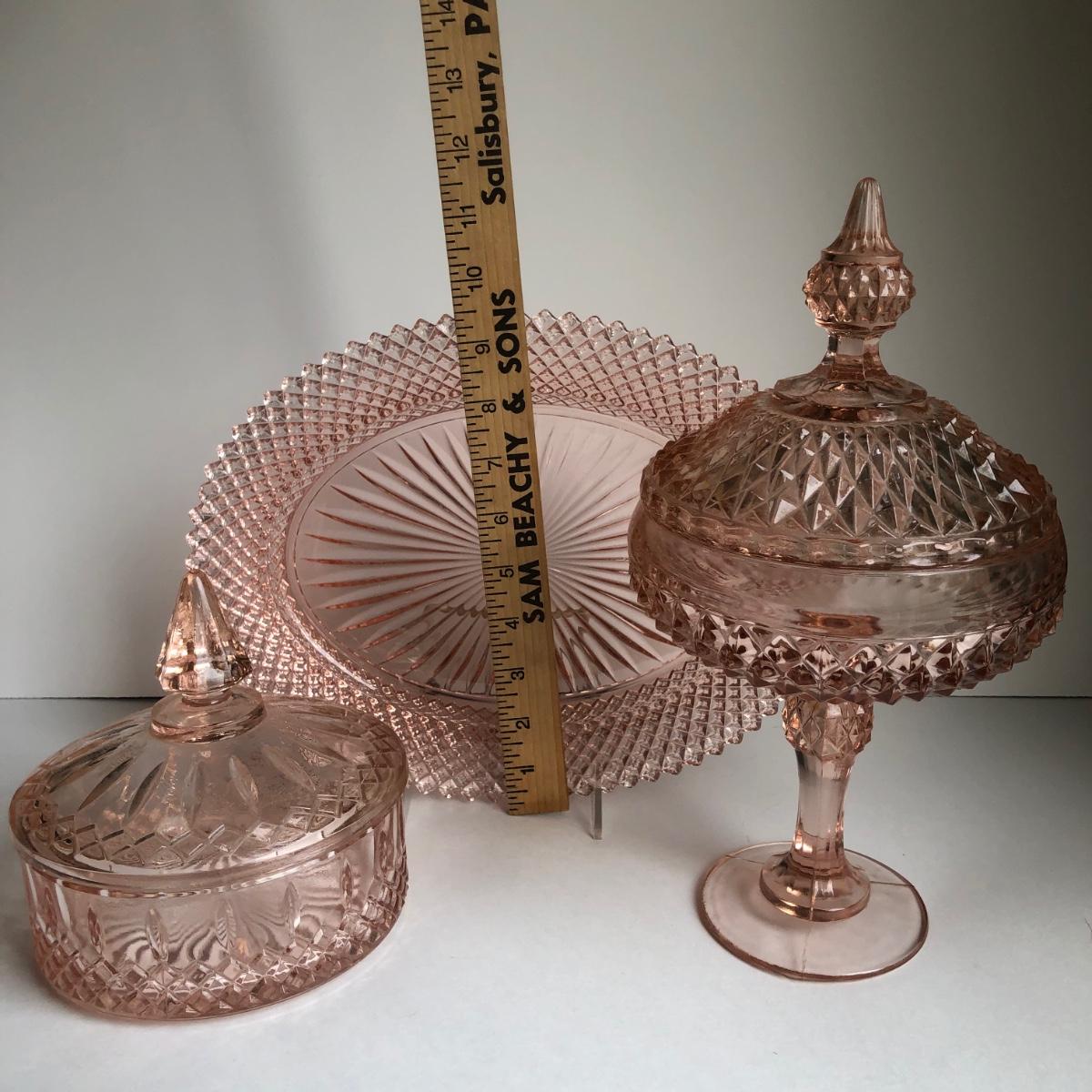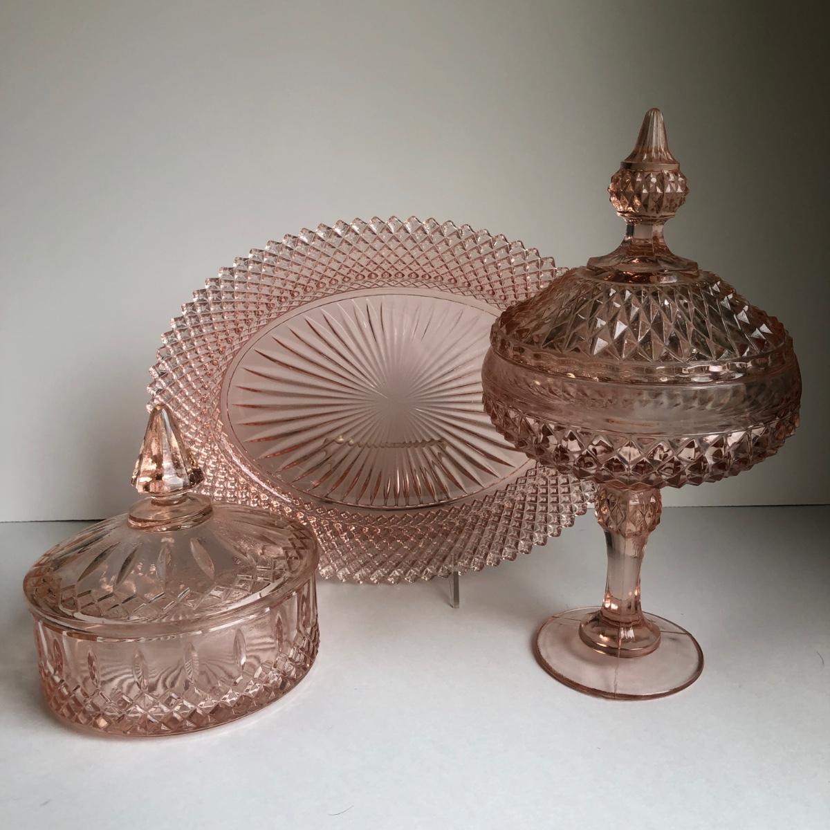 LOT 16K: Vintage Diamond Cut Pink Glass - Anchor Hocking Miss America Platter, Pedestal Jewelry Dish & Indiana Depression Candy Dish