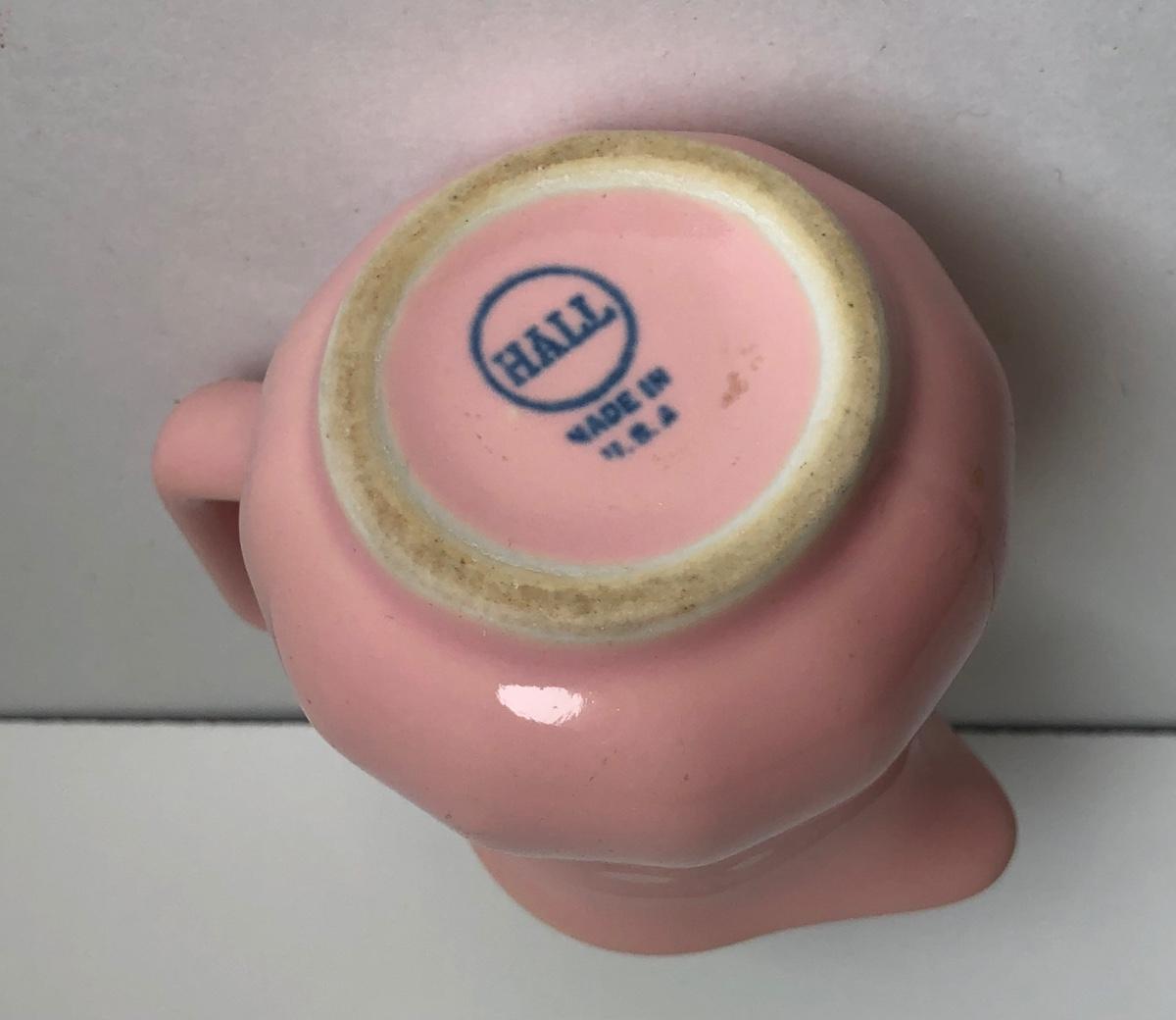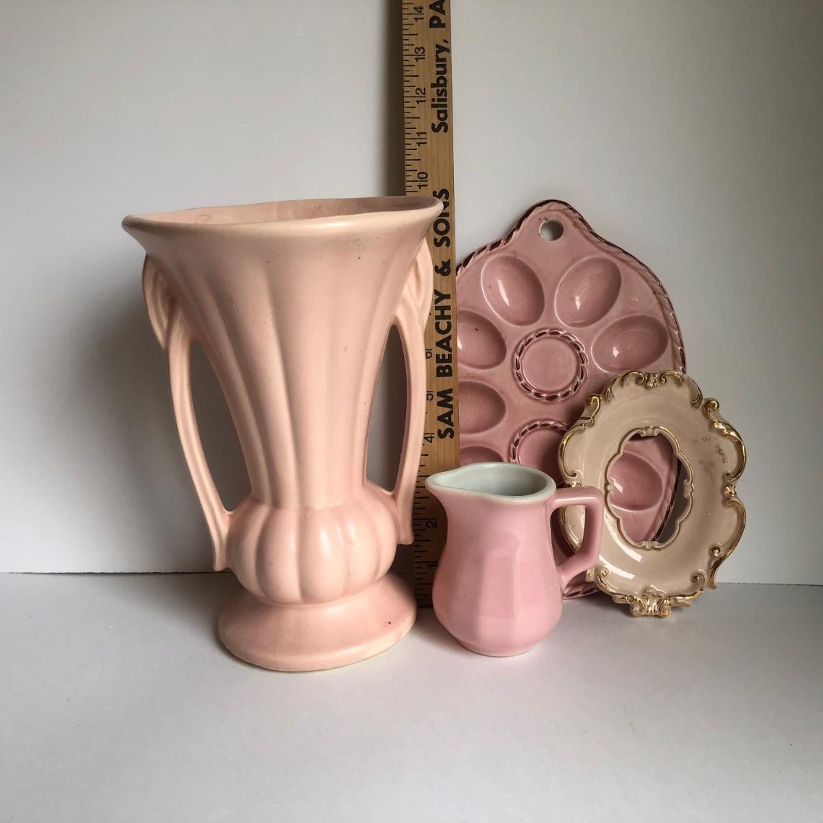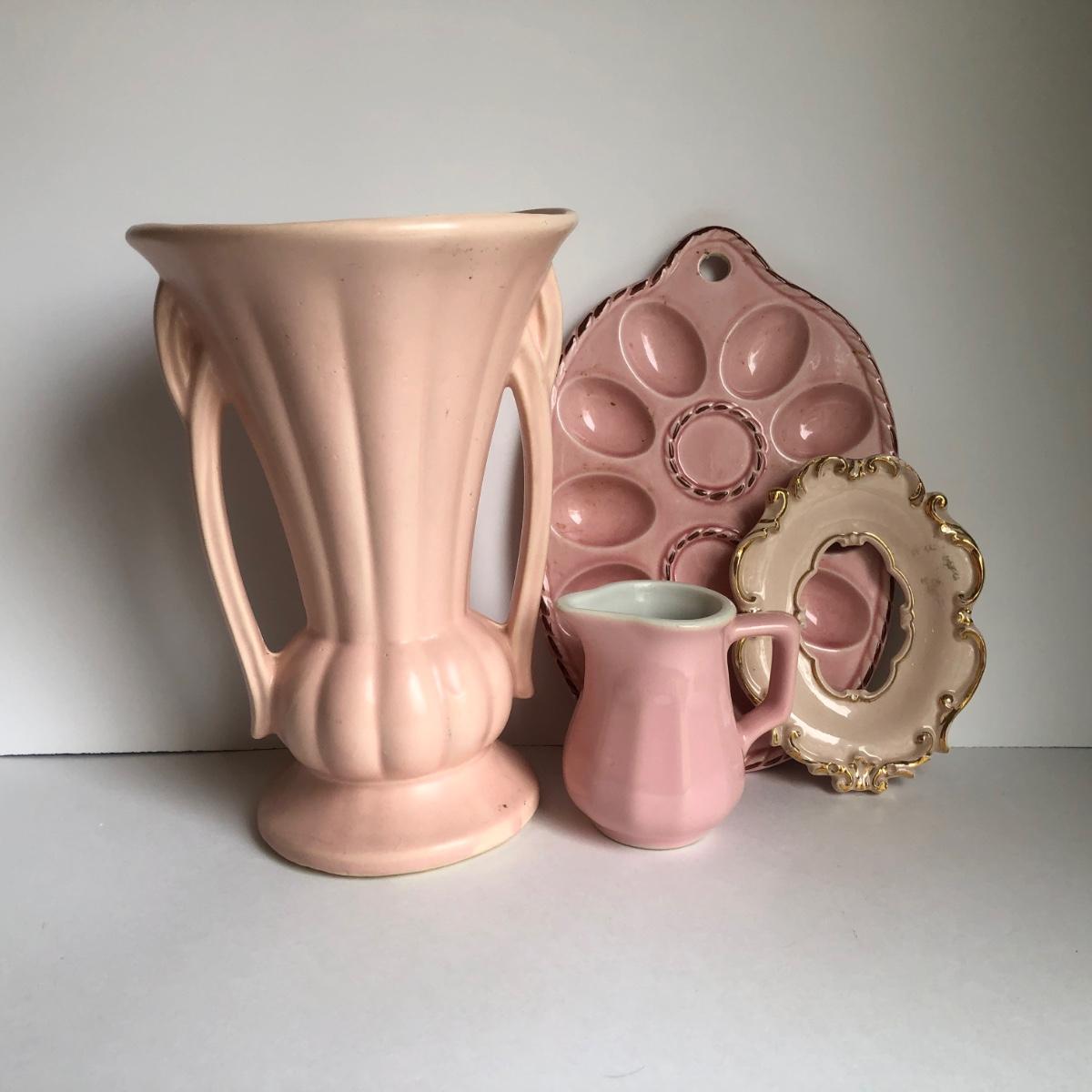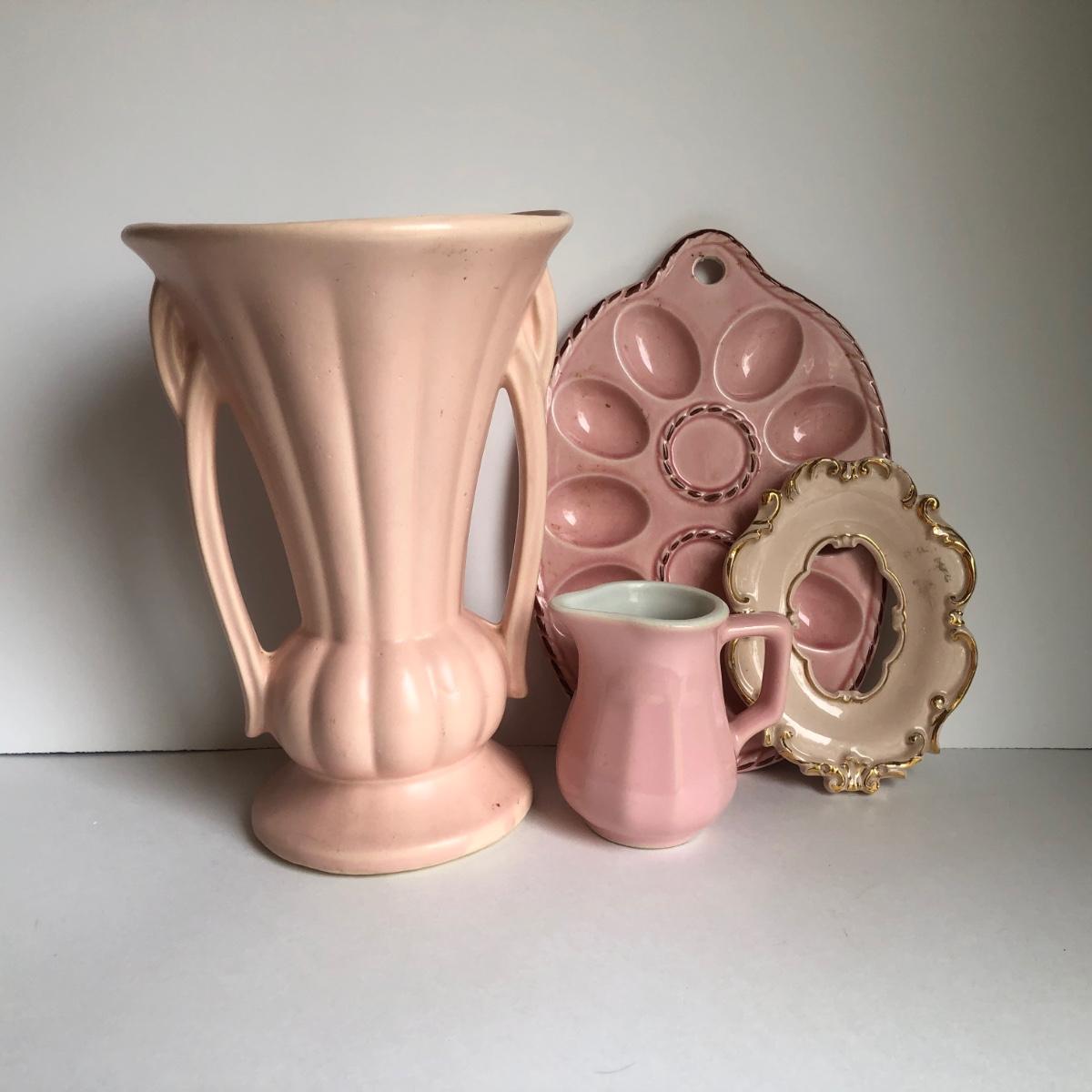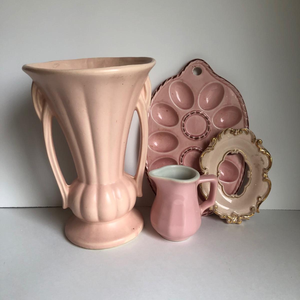 LOT 18K: Vintage Pink Pottery - McCoy Double Handled Art Deco Vase, Hall Cream Pitcher, Egg Dish made in Japan & Light Switch Cover
