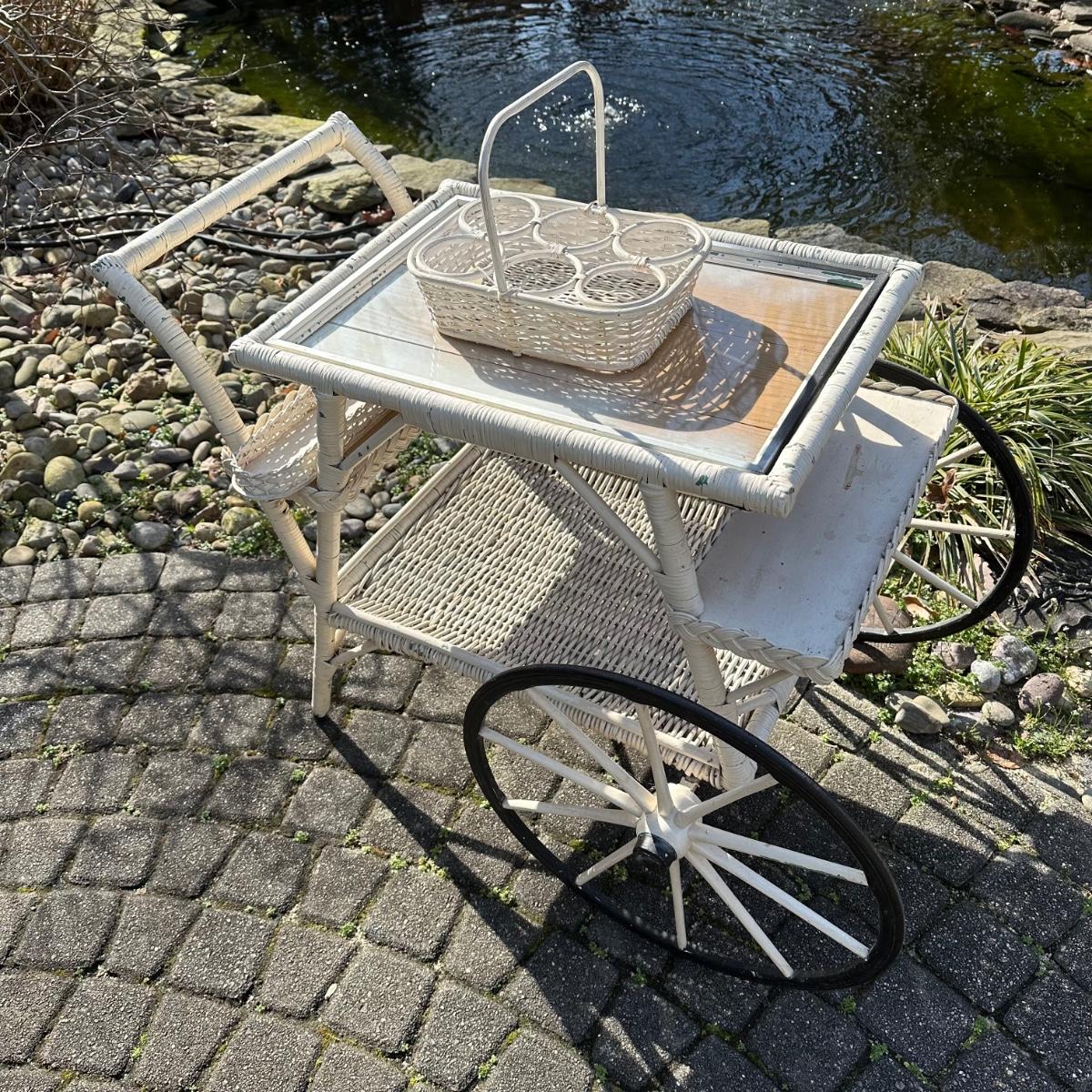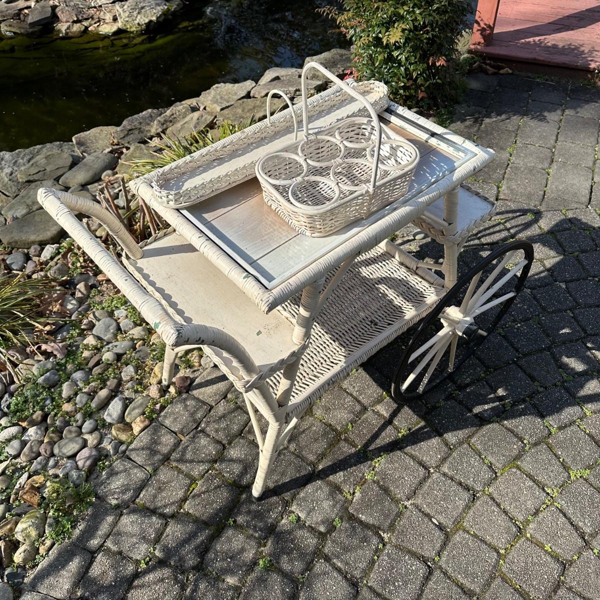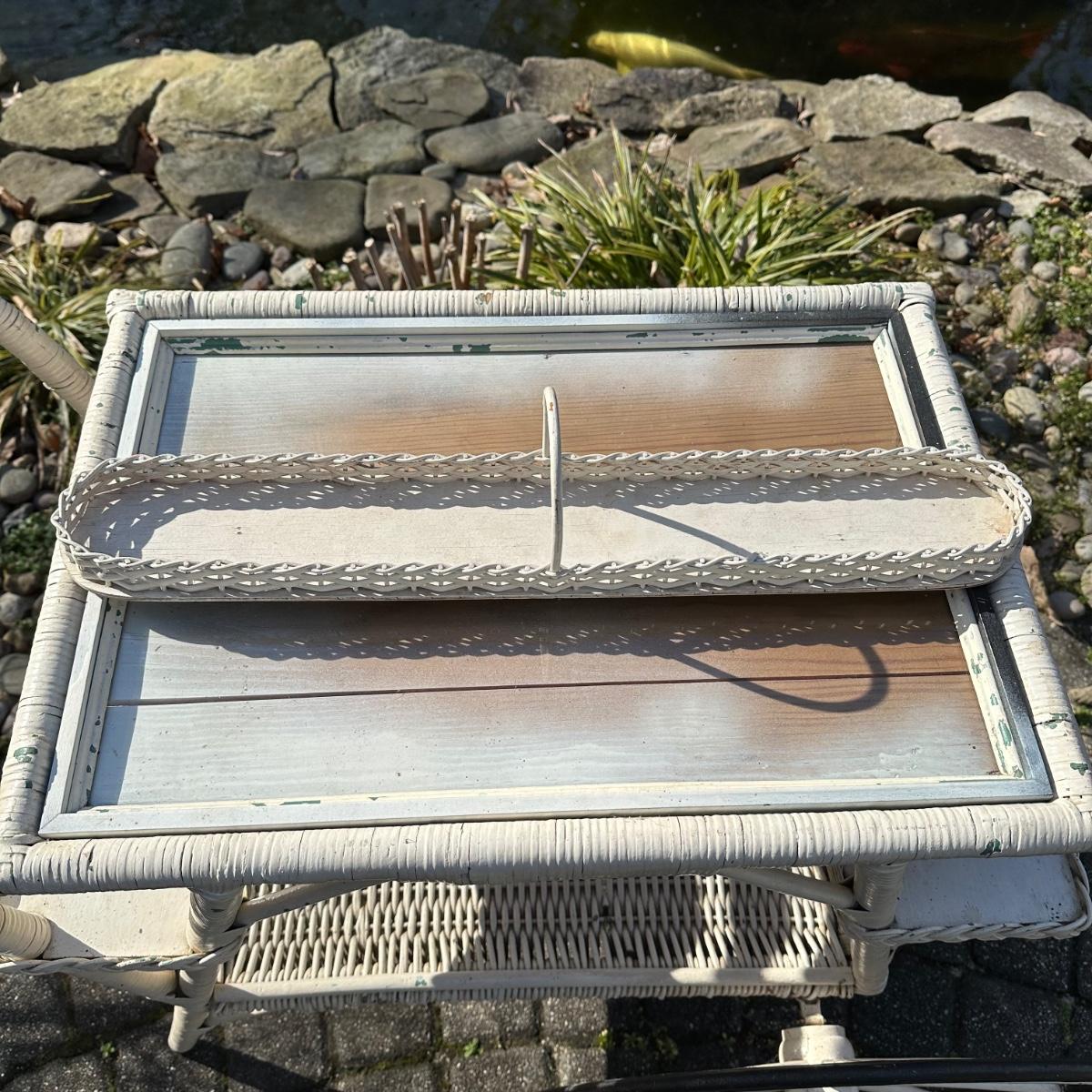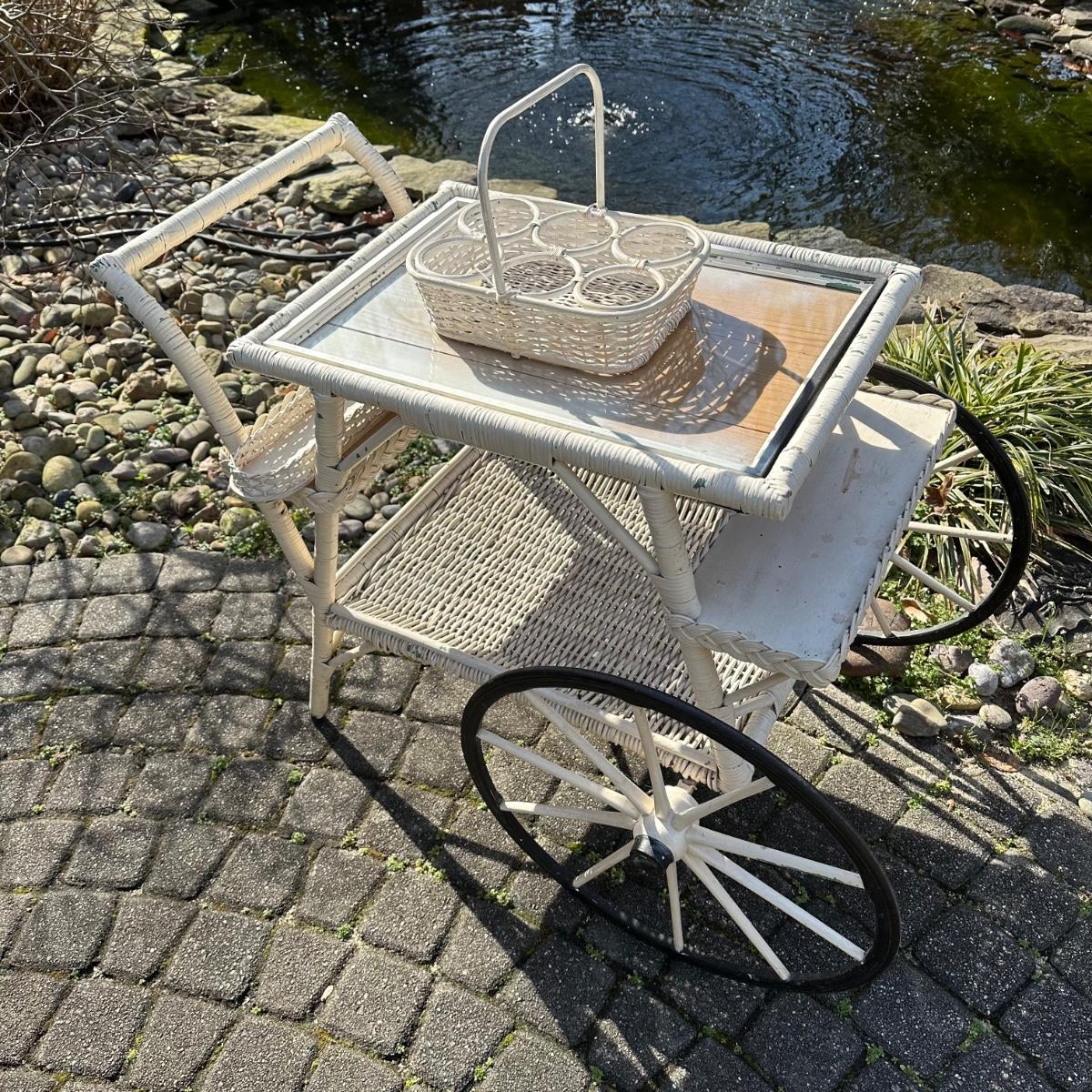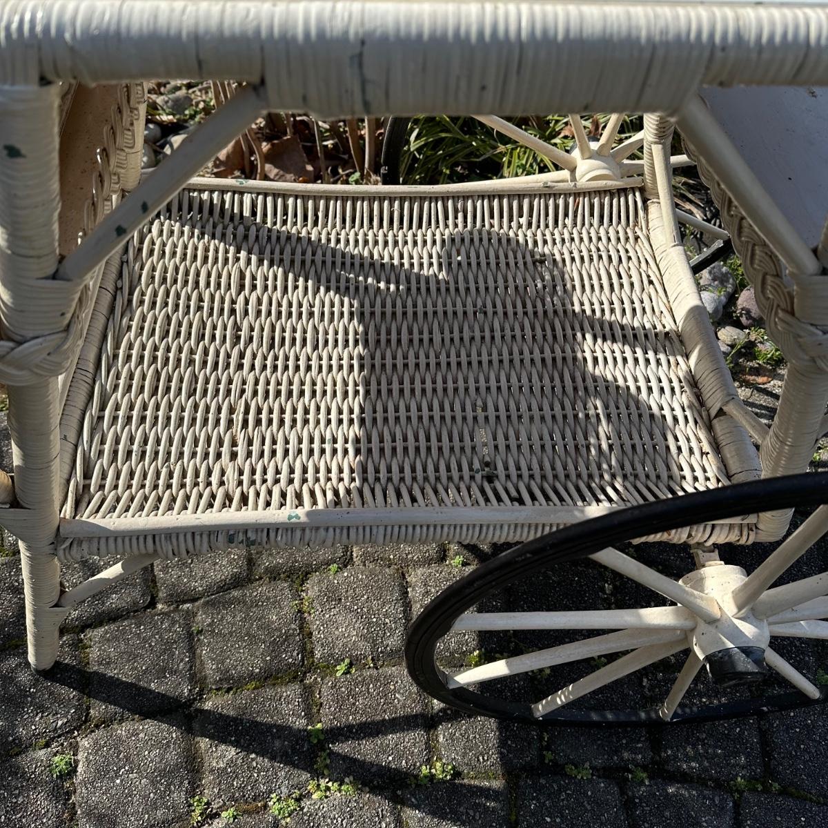 LOT 43L: Vintage White Wicker Glass Top Tea Cart w/ Wicker Serving Baskets