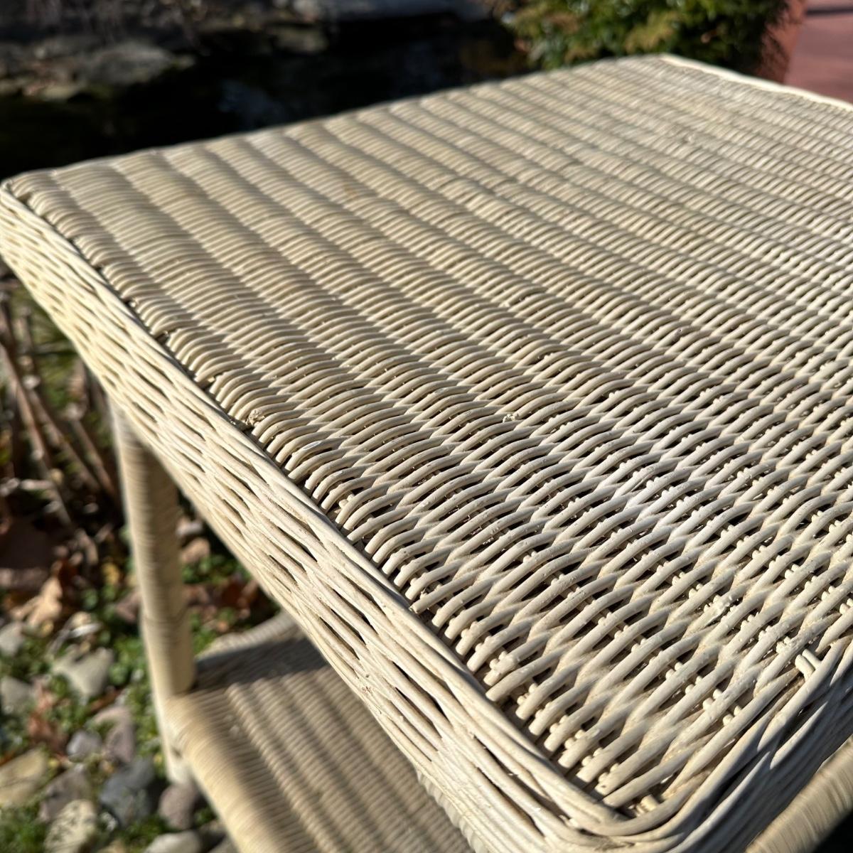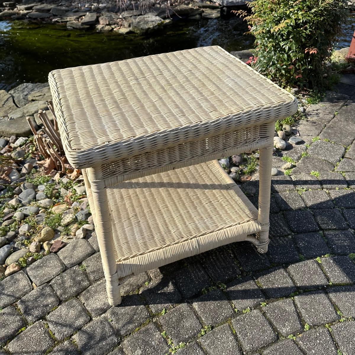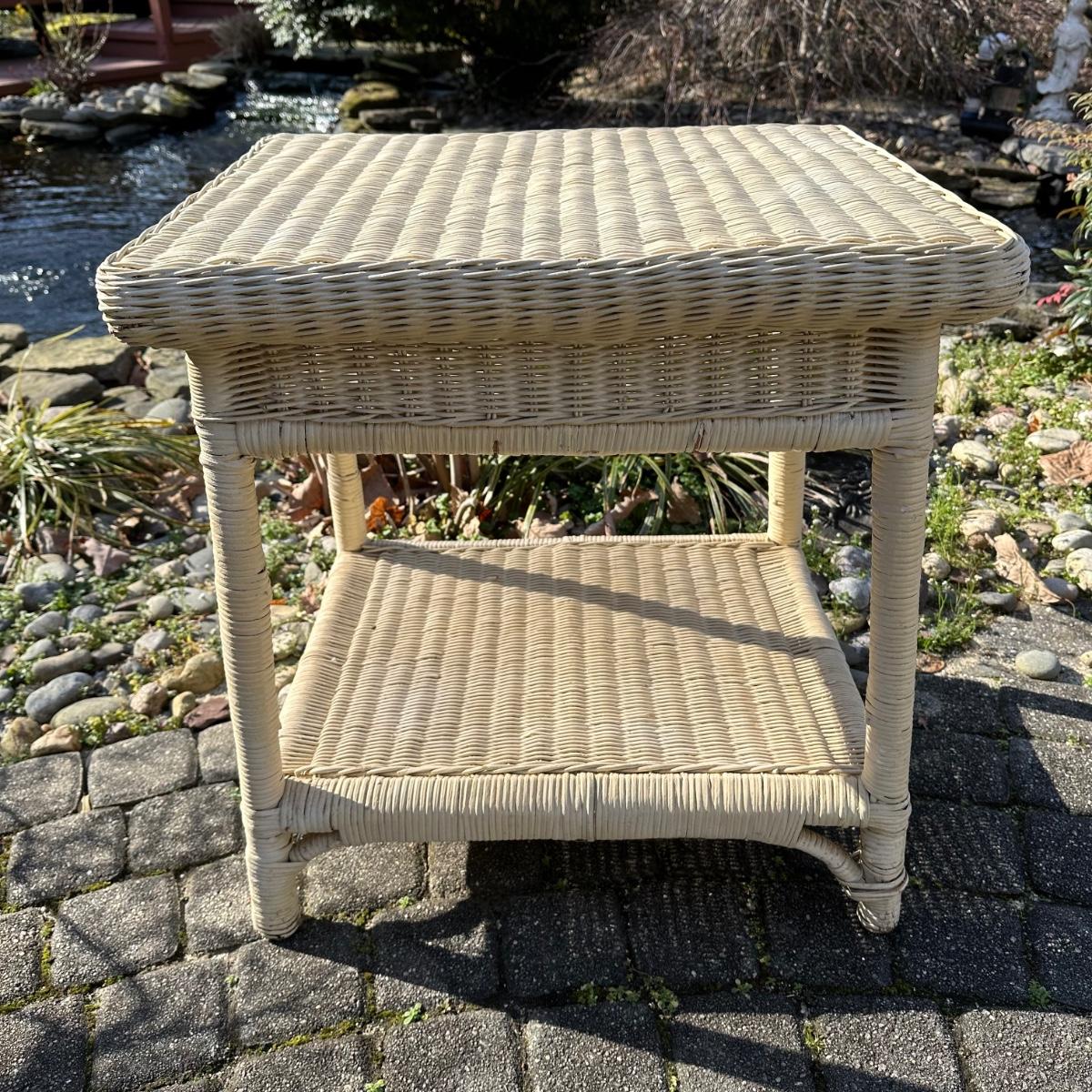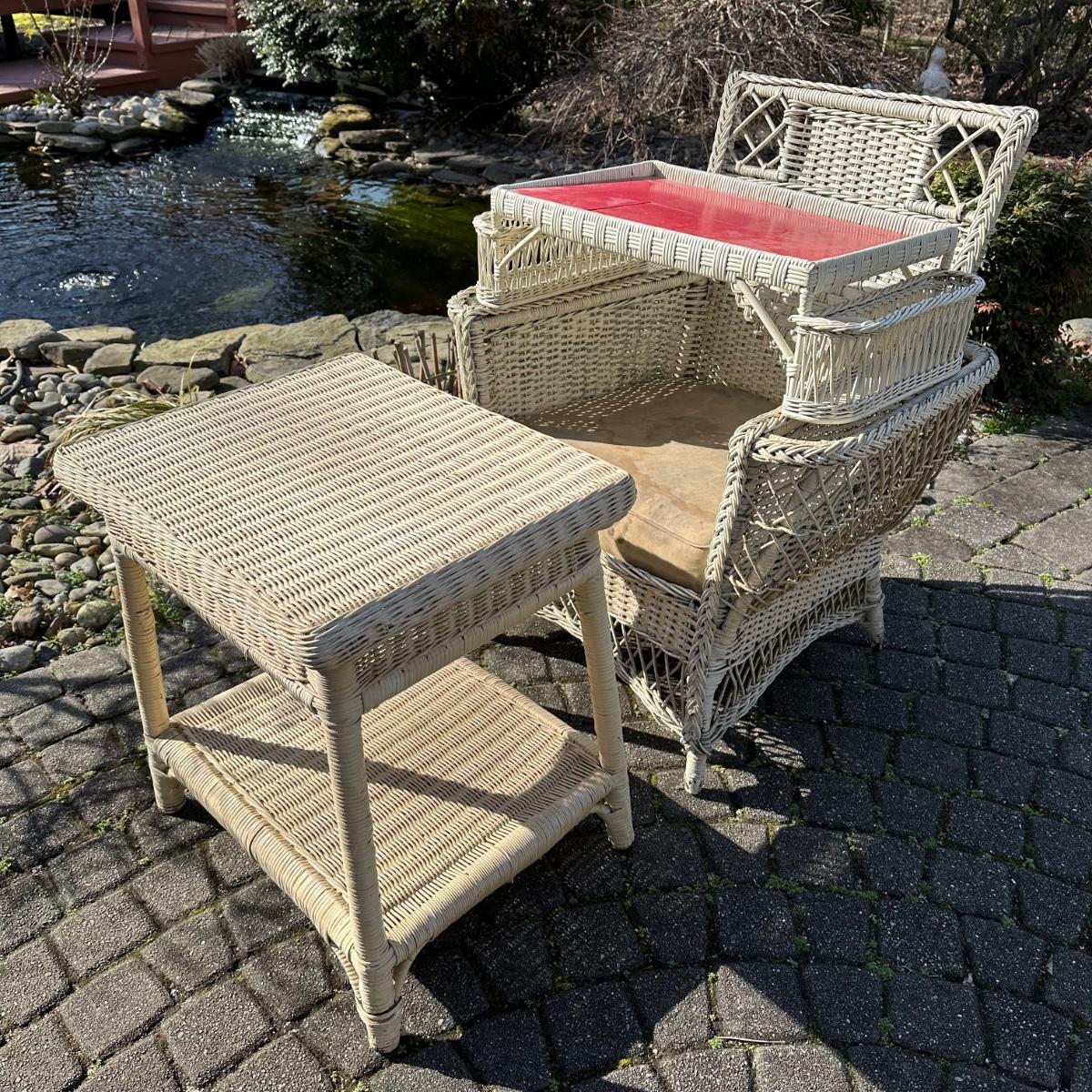 LOT 44L: Vintage White Wicker Bed Lap Tray w/ White Wicker Chair & End Table