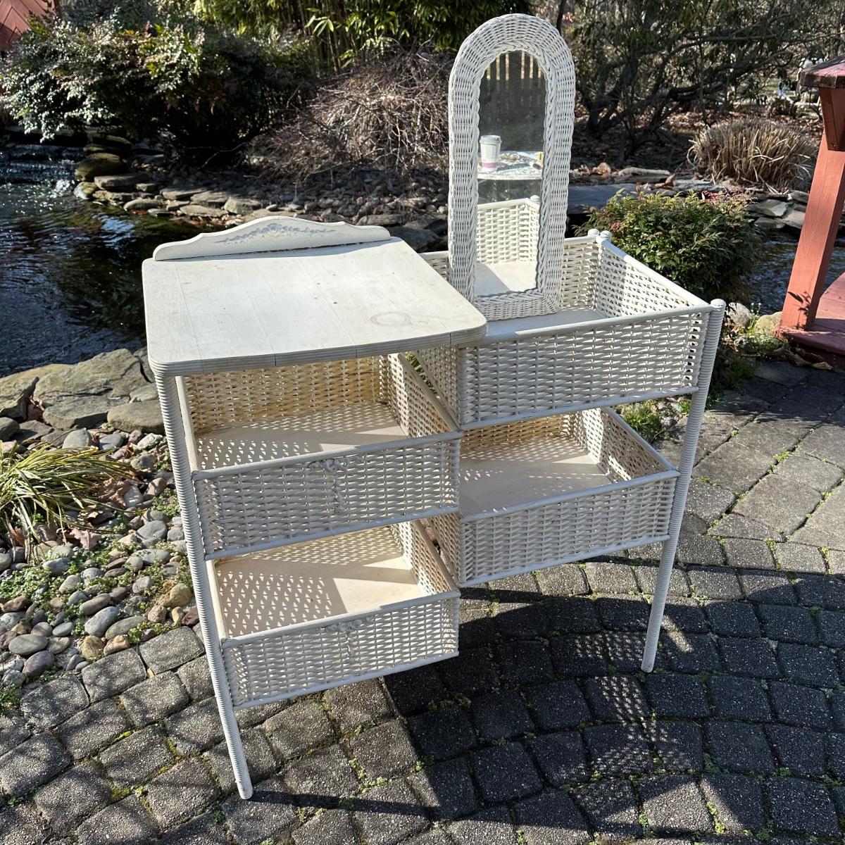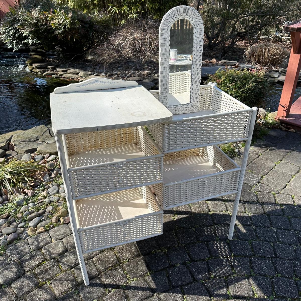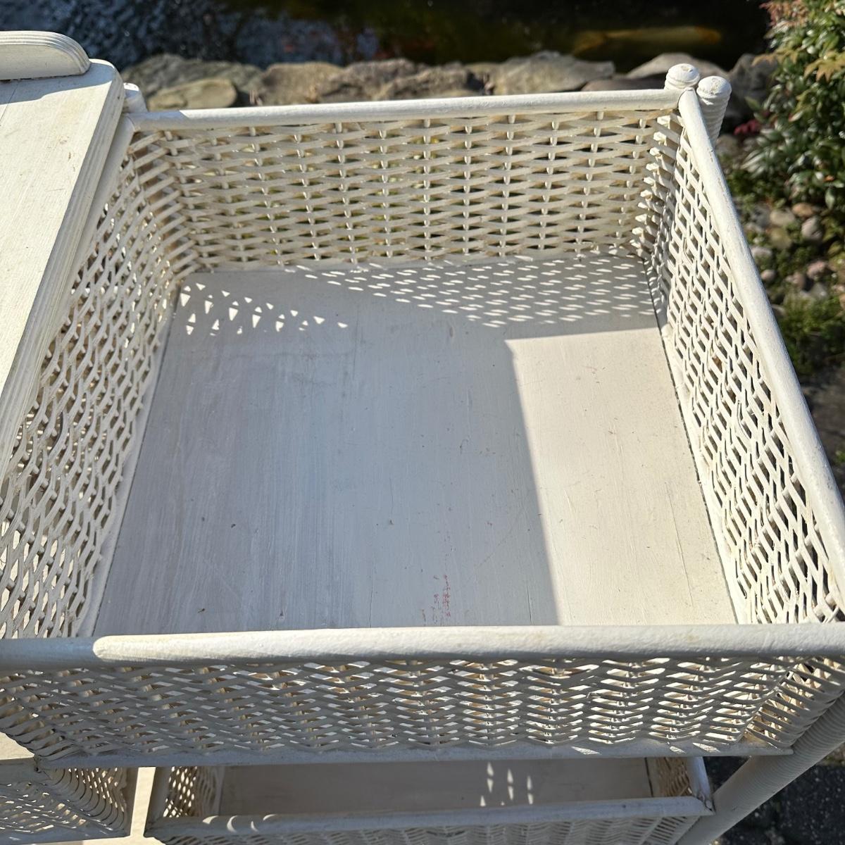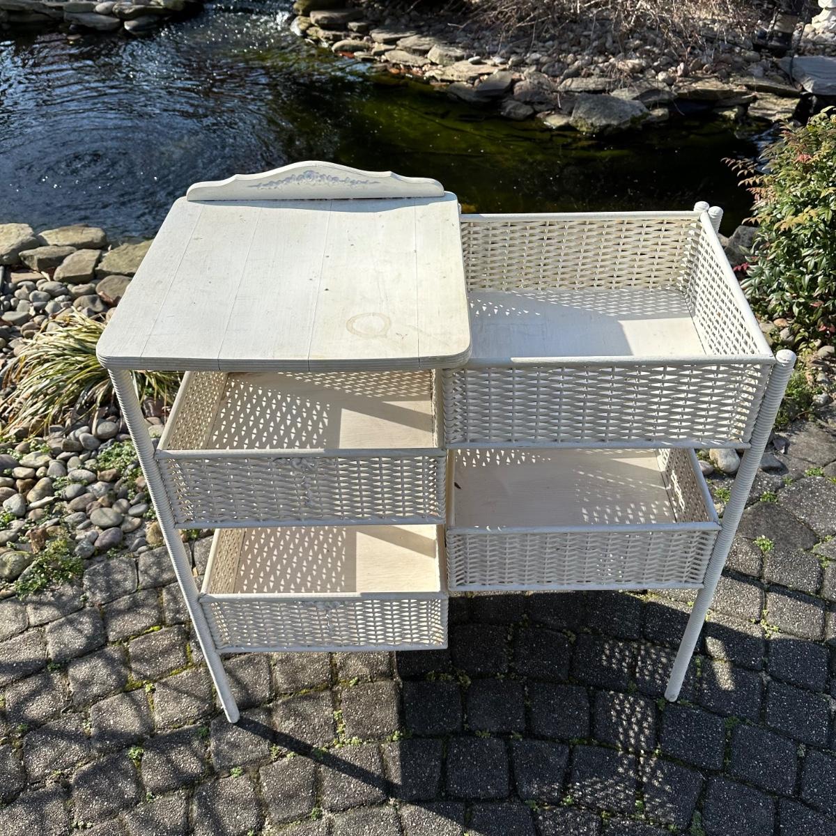 LOT 45L: Vintage White Wicker Folding Baby Storage Dresser w/ Mirror