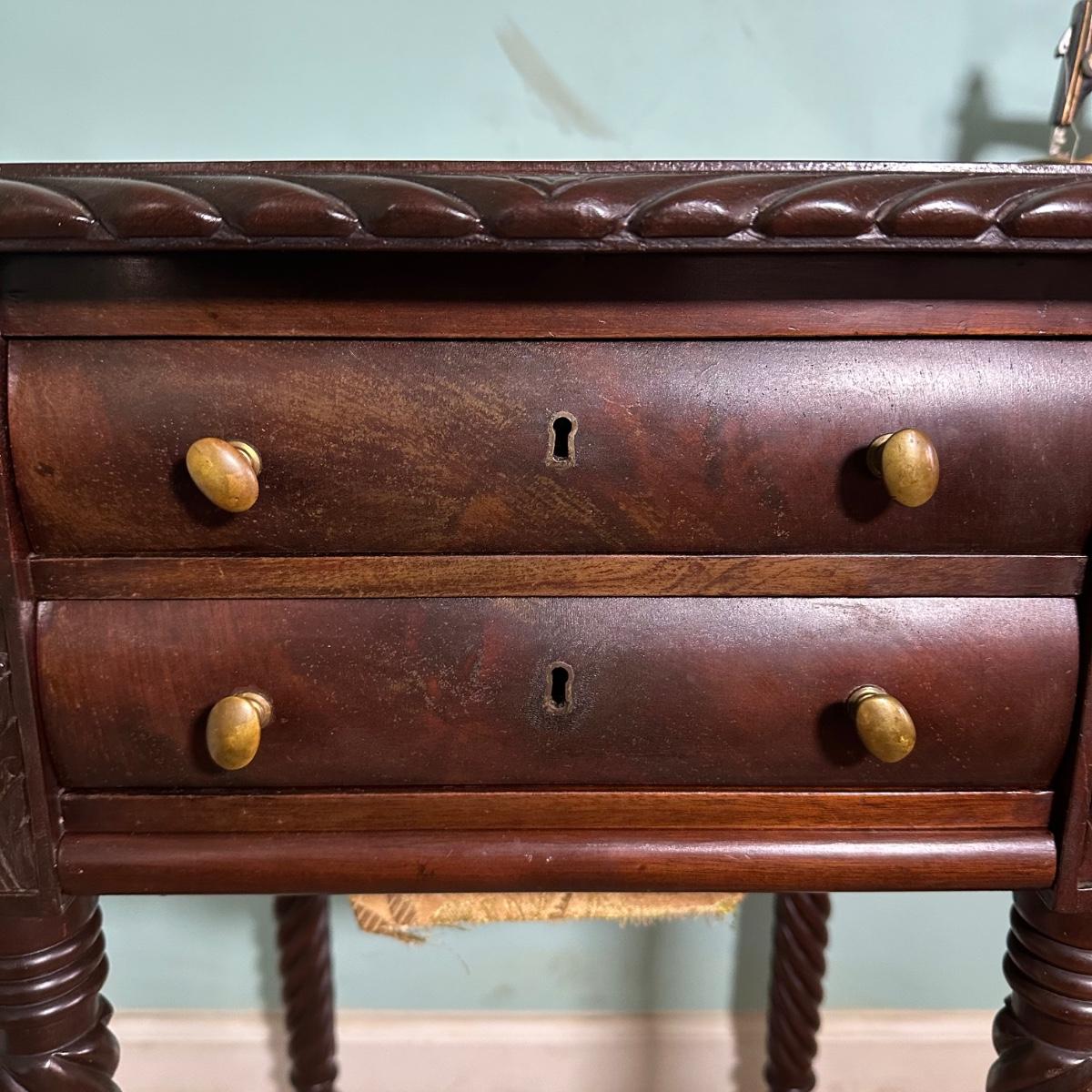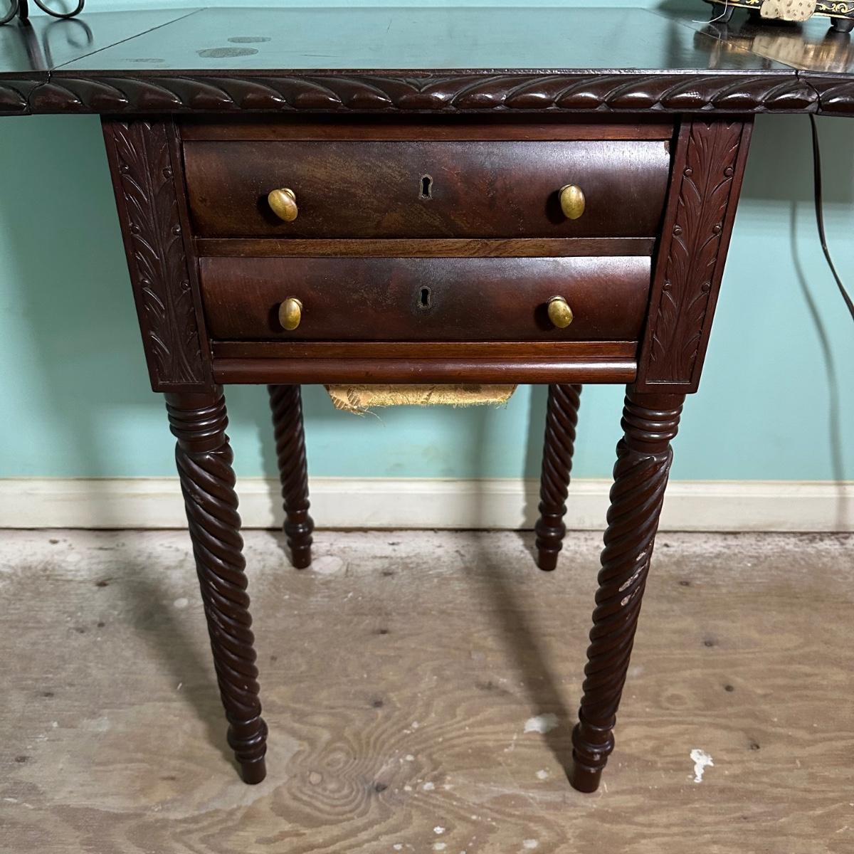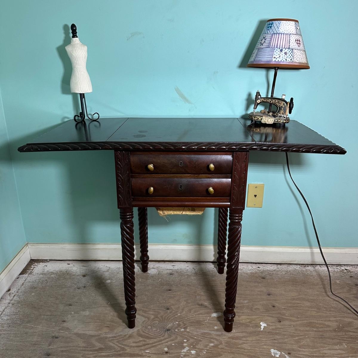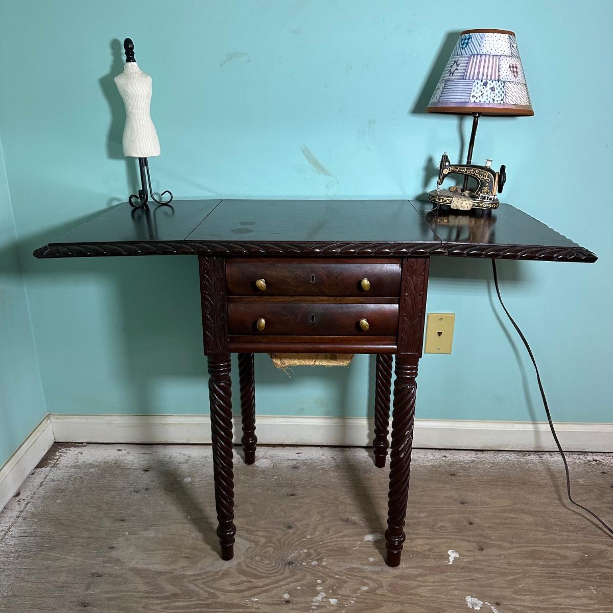 LOT 48L: Antique American Empire Mahogany Sewing Table w/ Sewing Machine Desk Lamp & Table Top Dress Mannequin