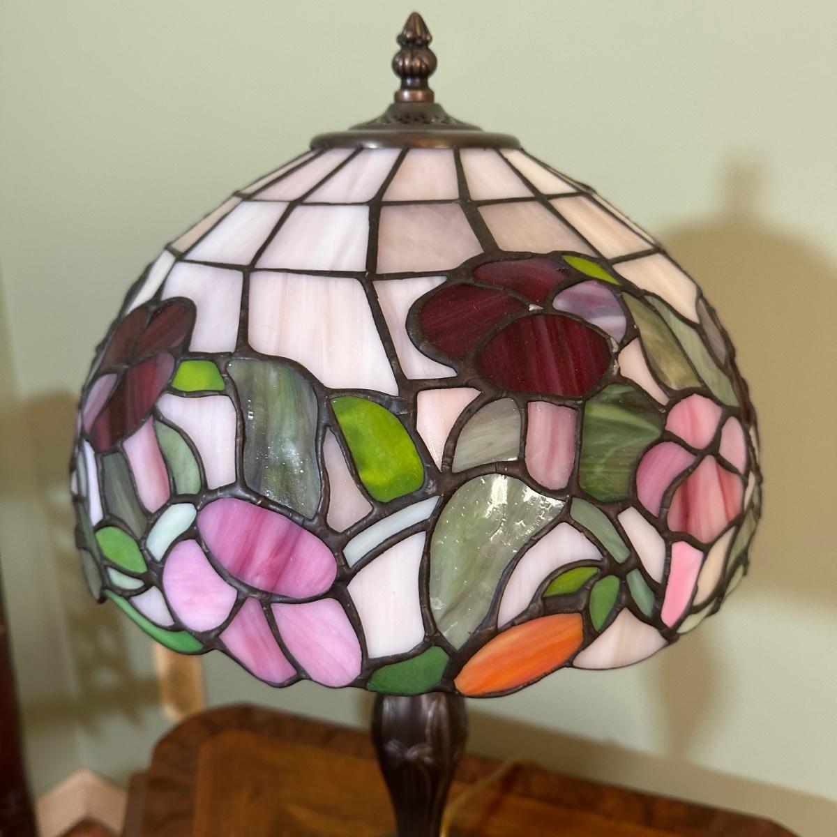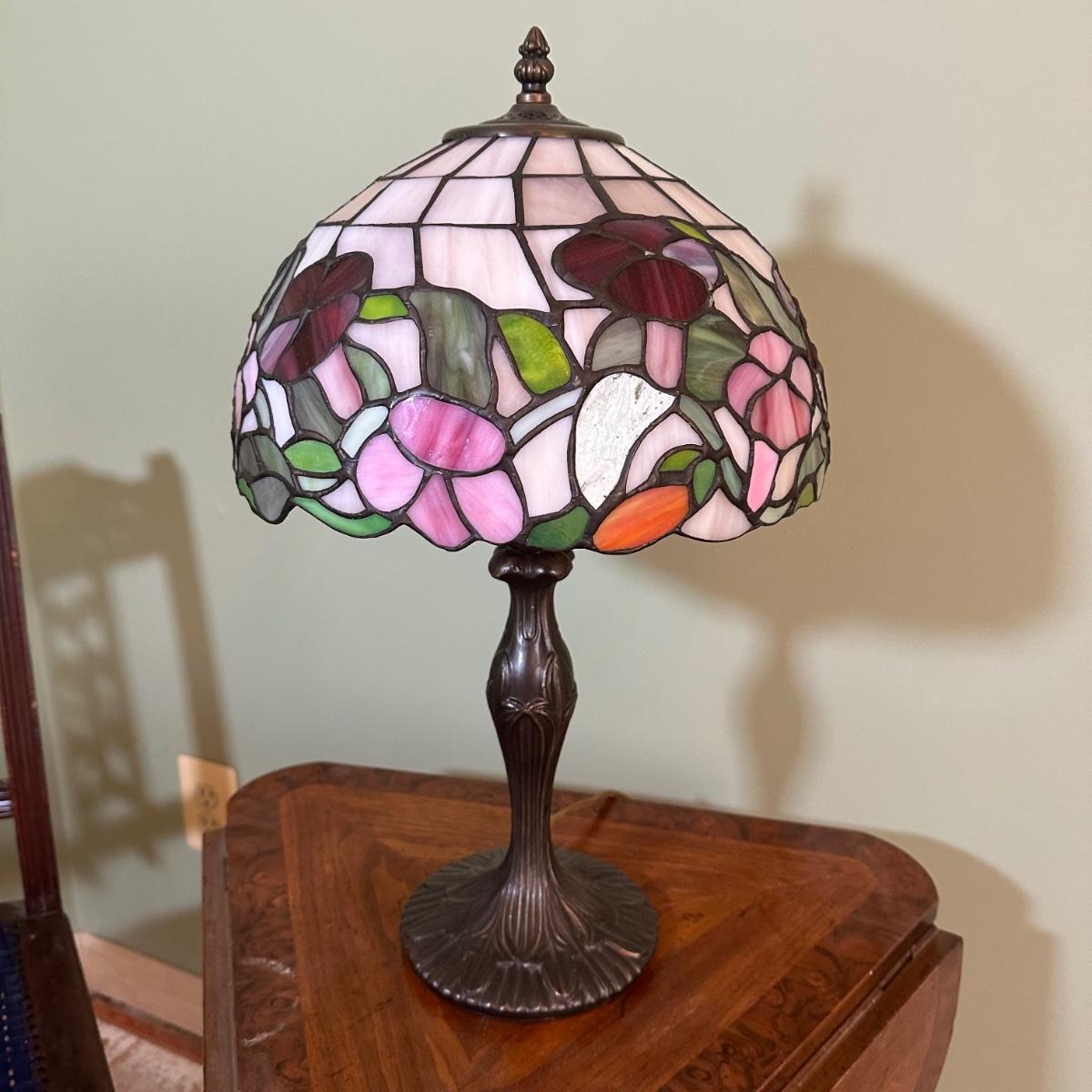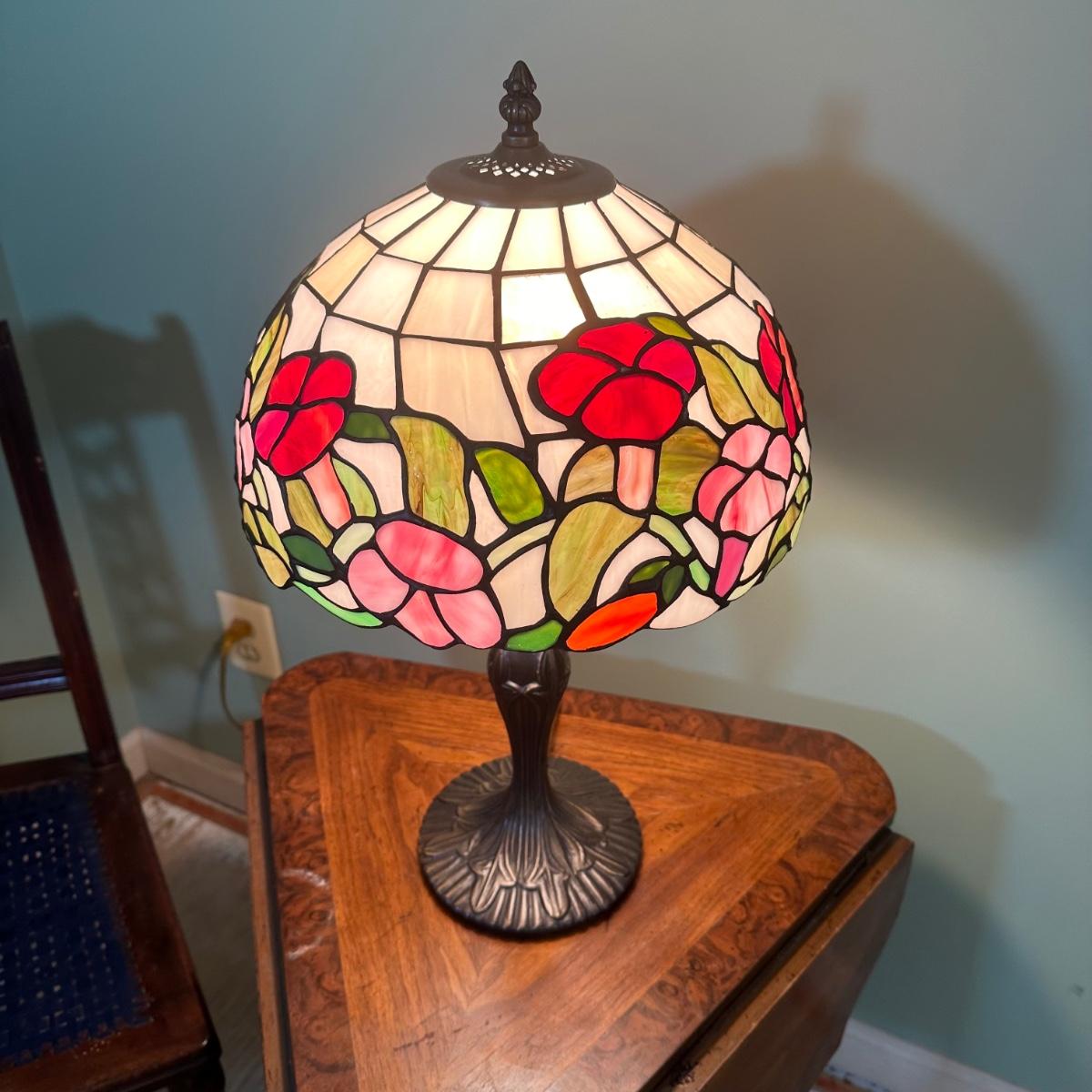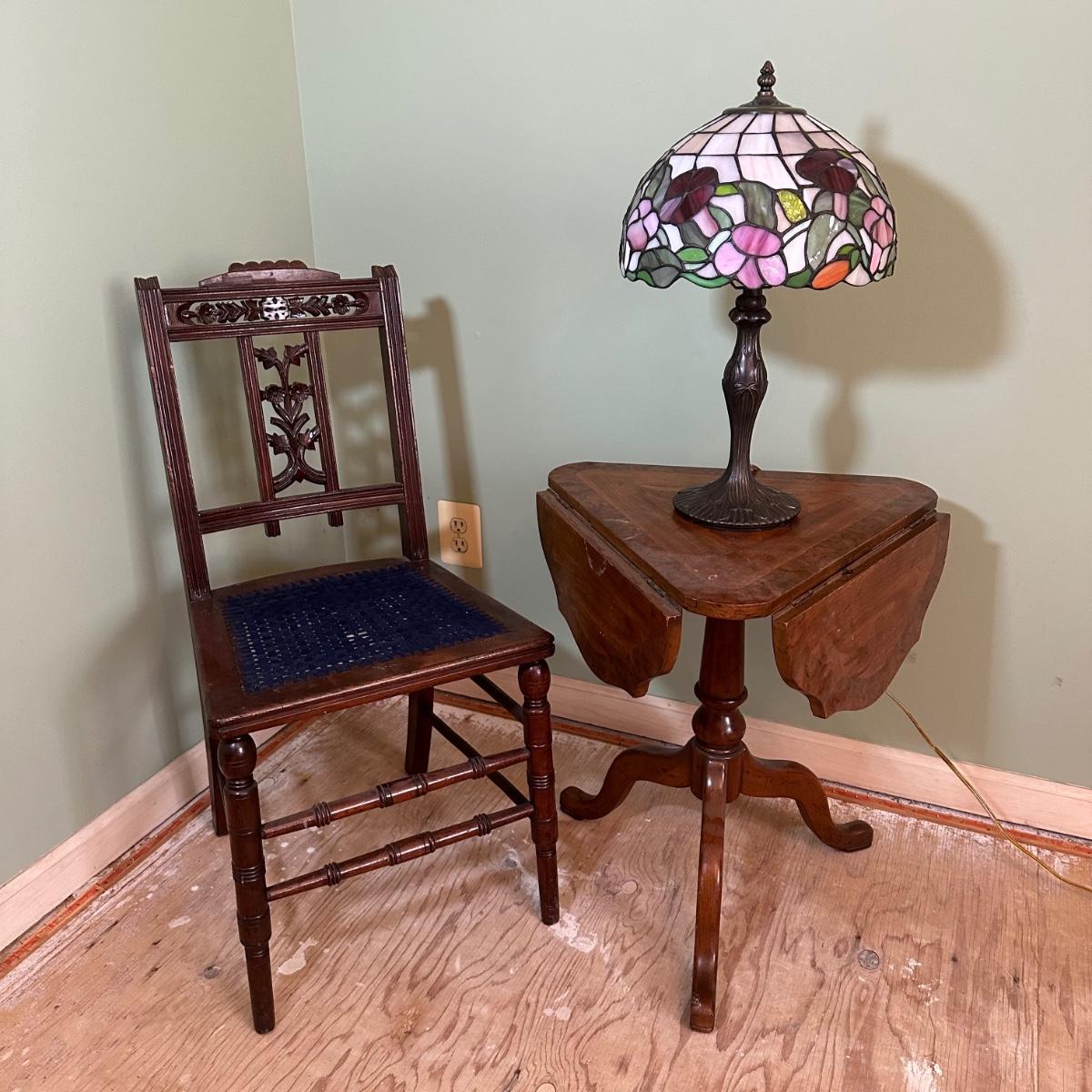 LOT 54D: Vintage Tiffany Style Stained Glass Floral Lamp w/ Antique Chair & Triangle Drop Leaf Table