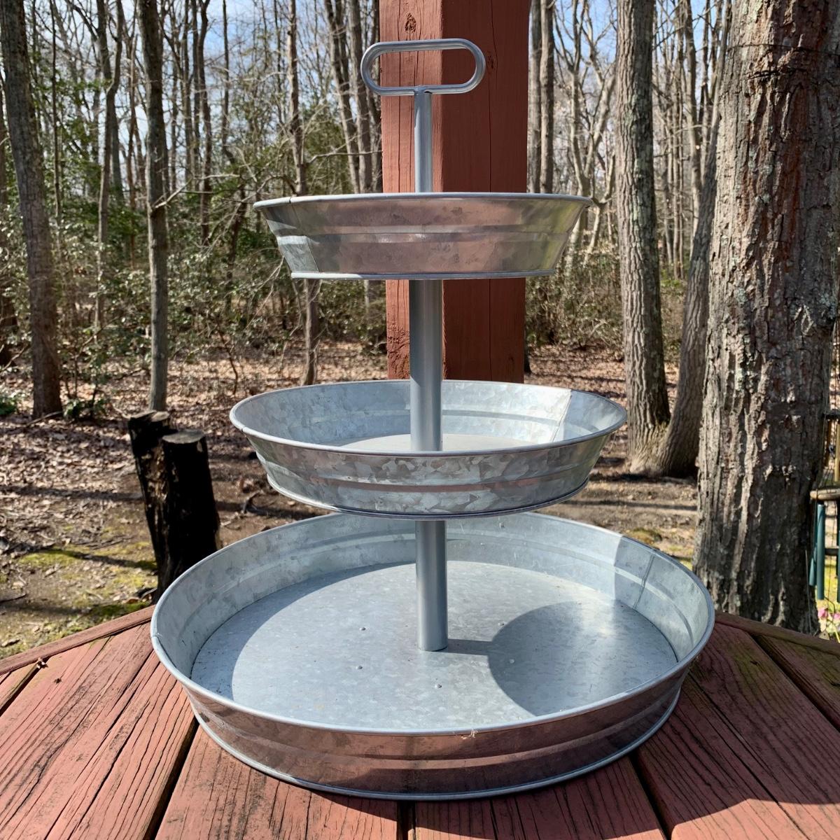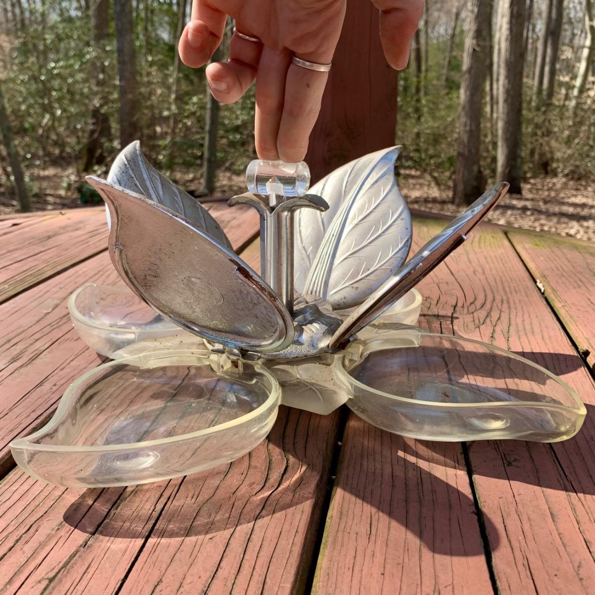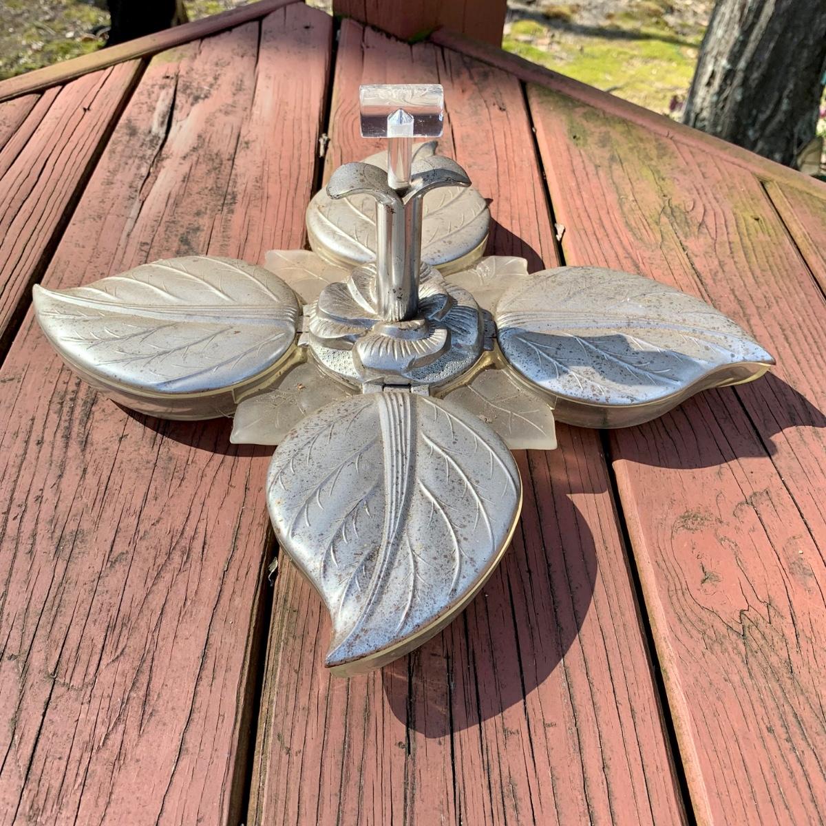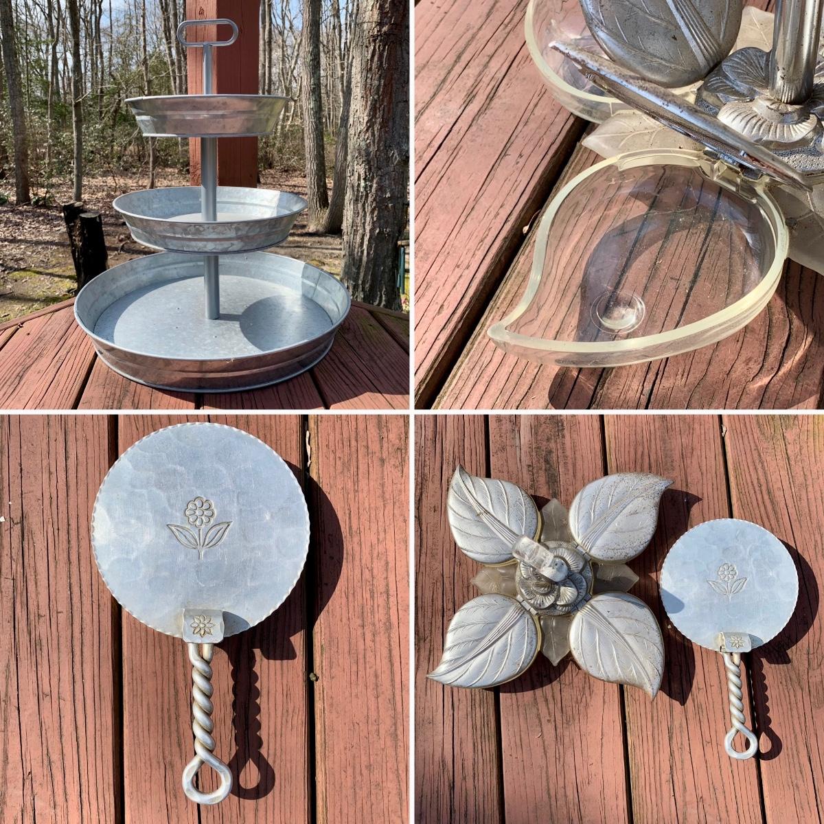 LOT 79 L: Vintage Buenilum Silent Butler/Crumb Catcher, 1960's Karoff Original Snack Server W/ Lucite Handle, & Galvanised Steel 3 Tiered Serving Tray