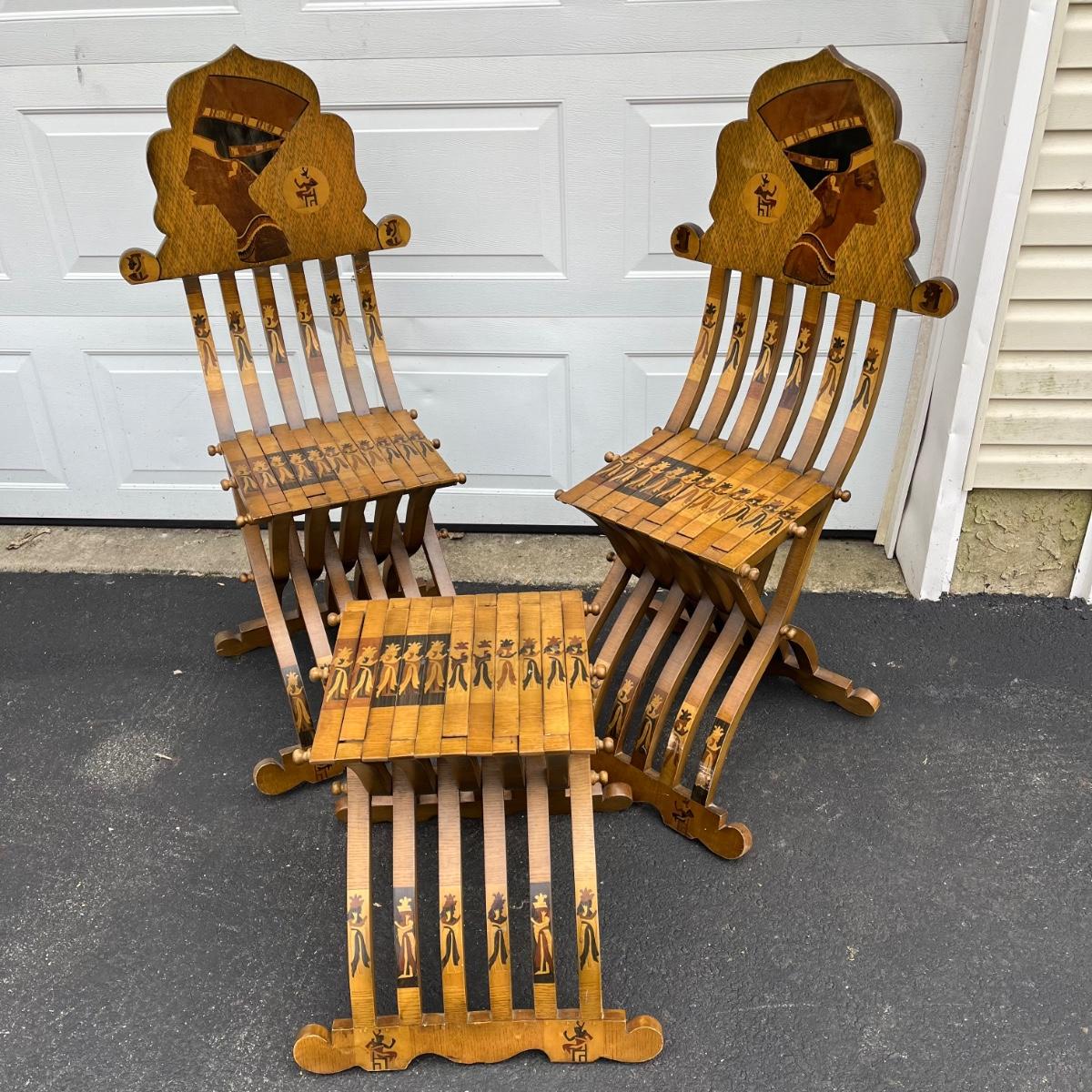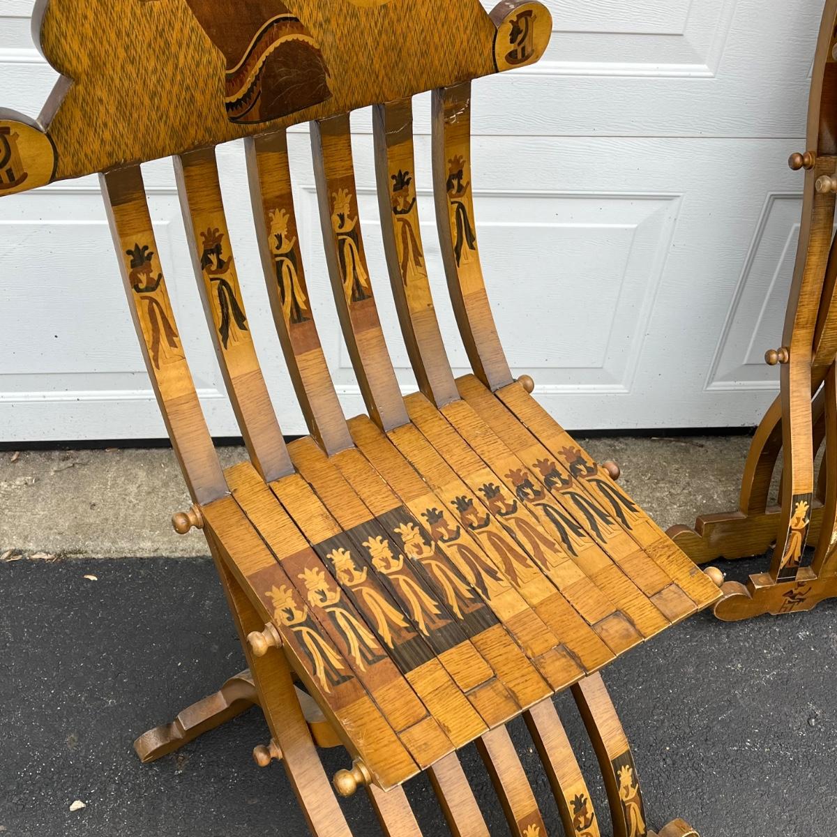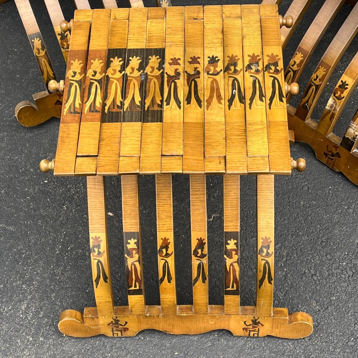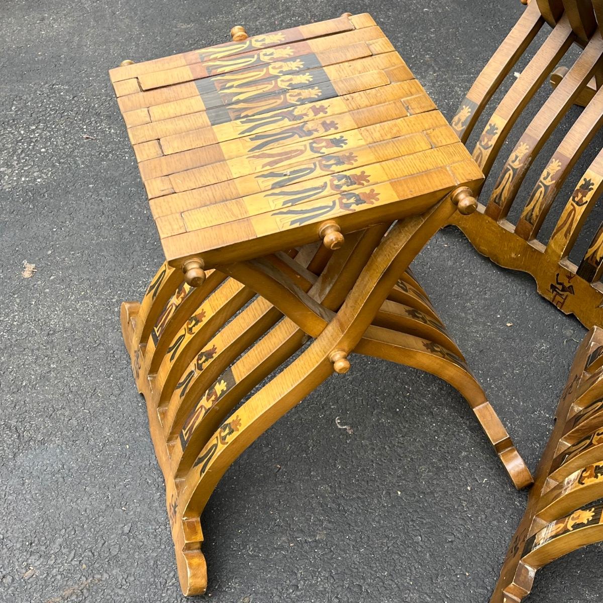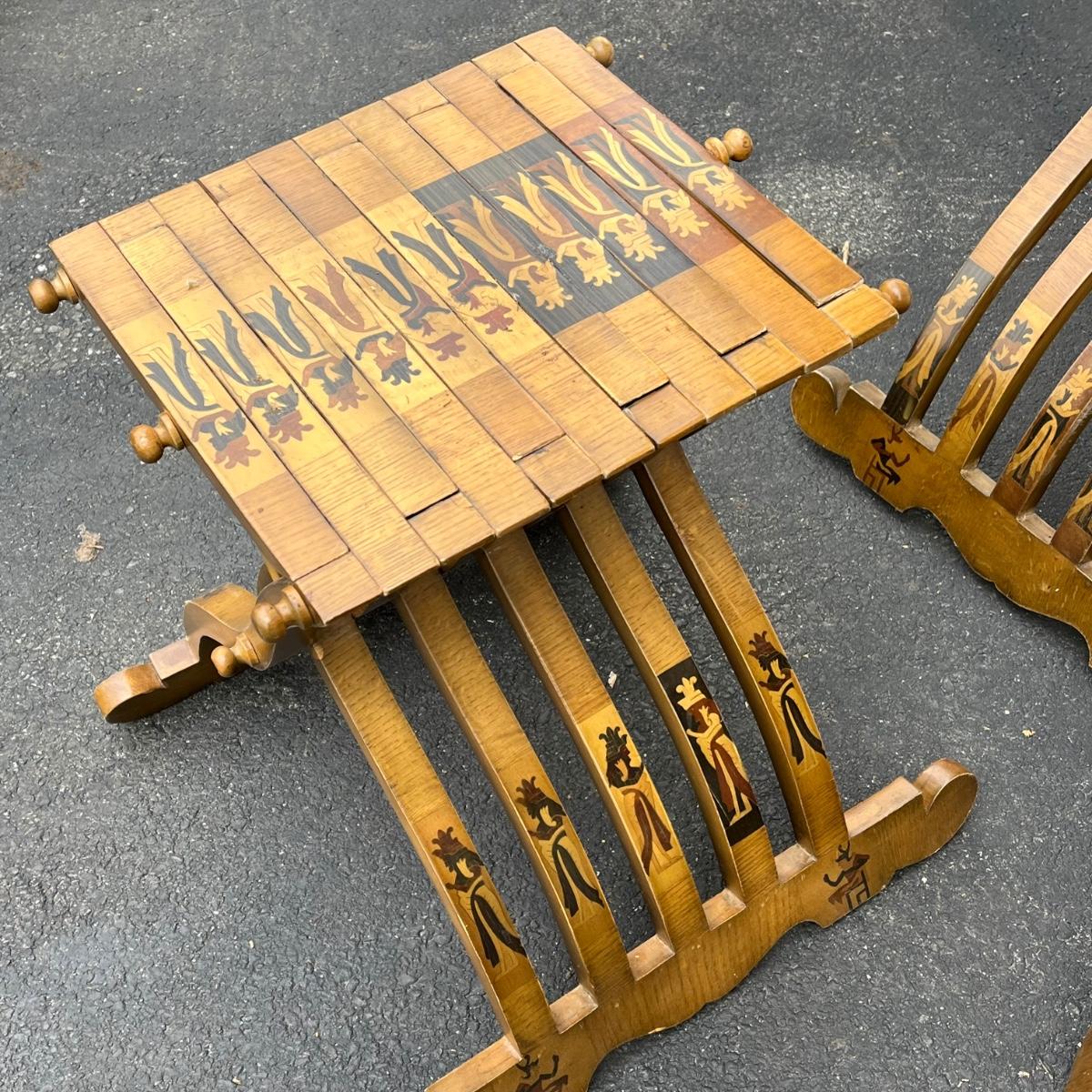 LOT 86G: Egyptian Themed Wooden Folding Chairs and Table Set