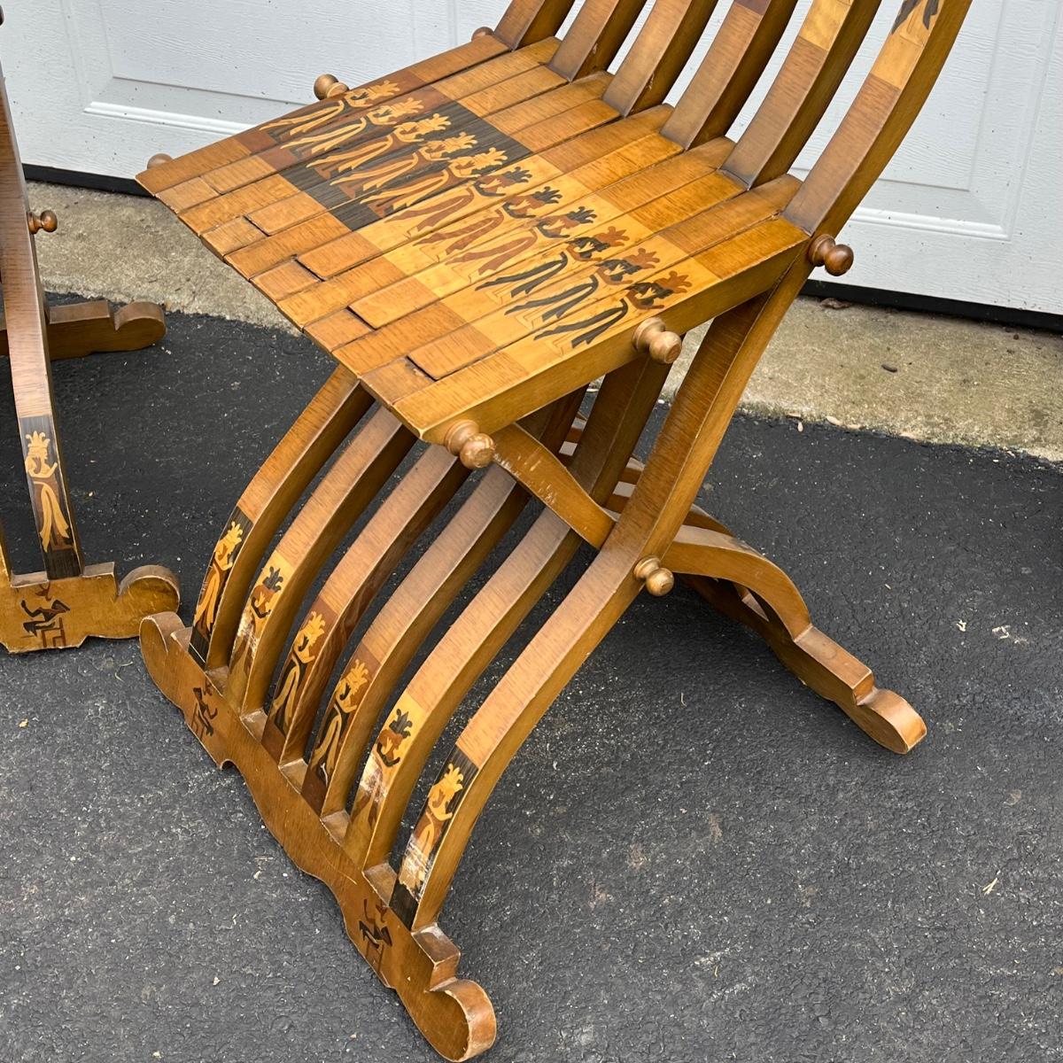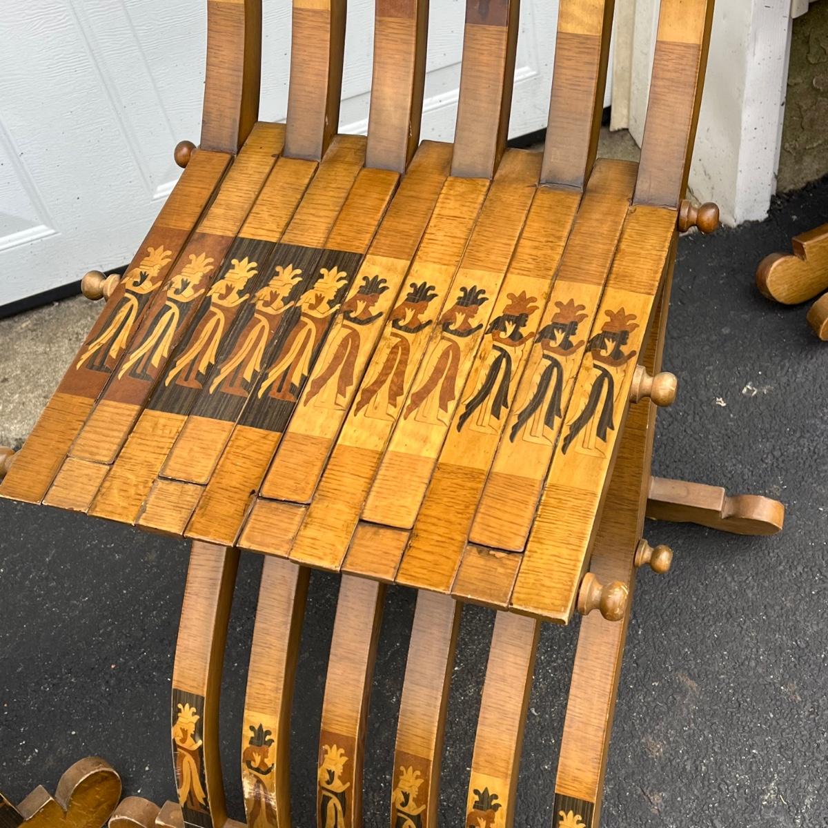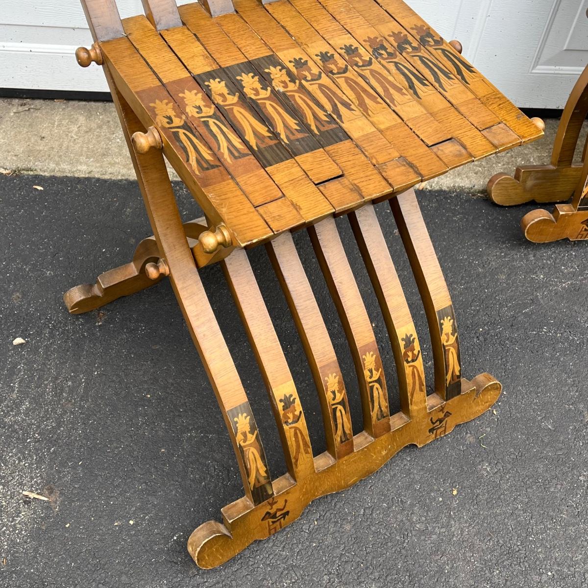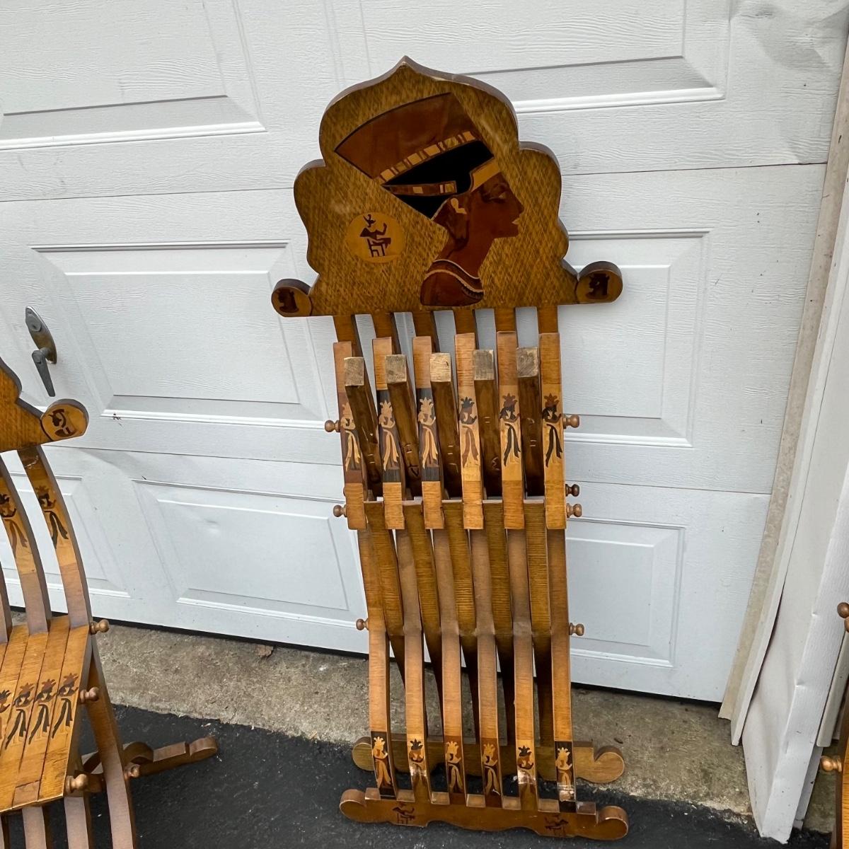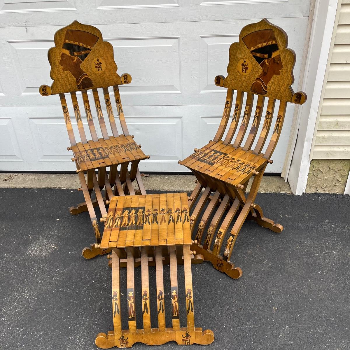 LOT 86G: Egyptian Themed Wooden Folding Chairs and Table Set