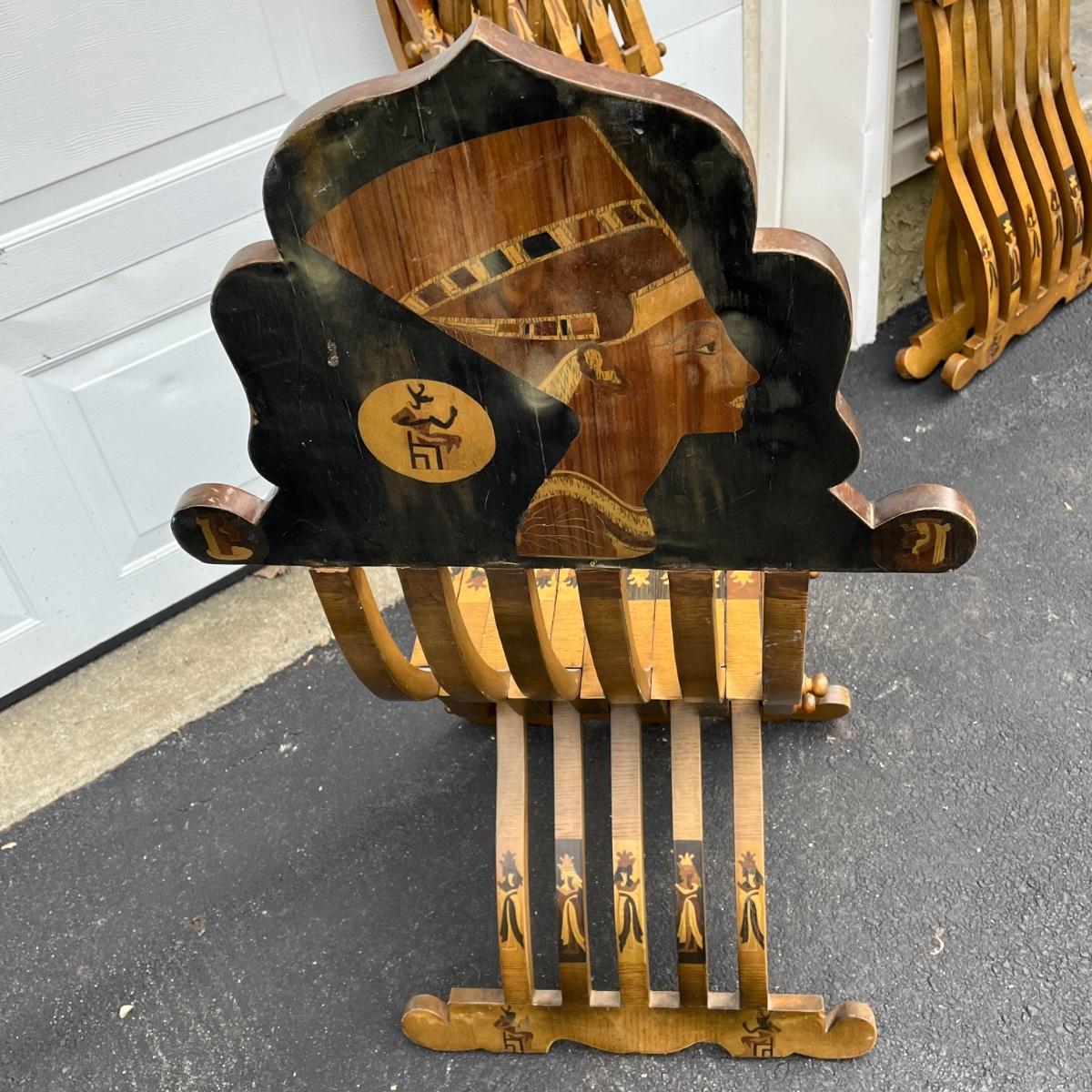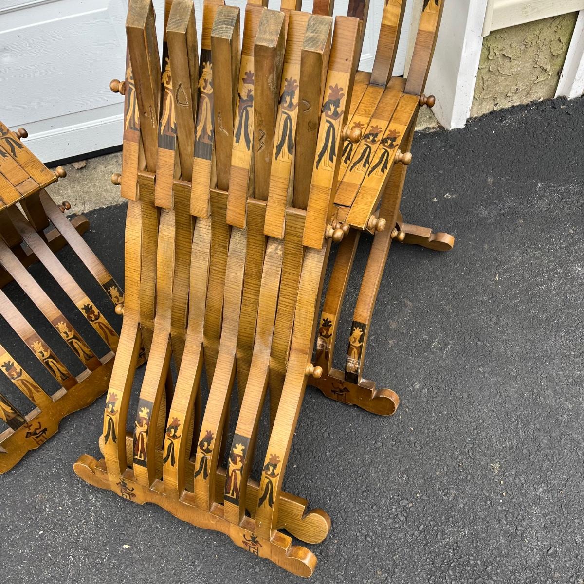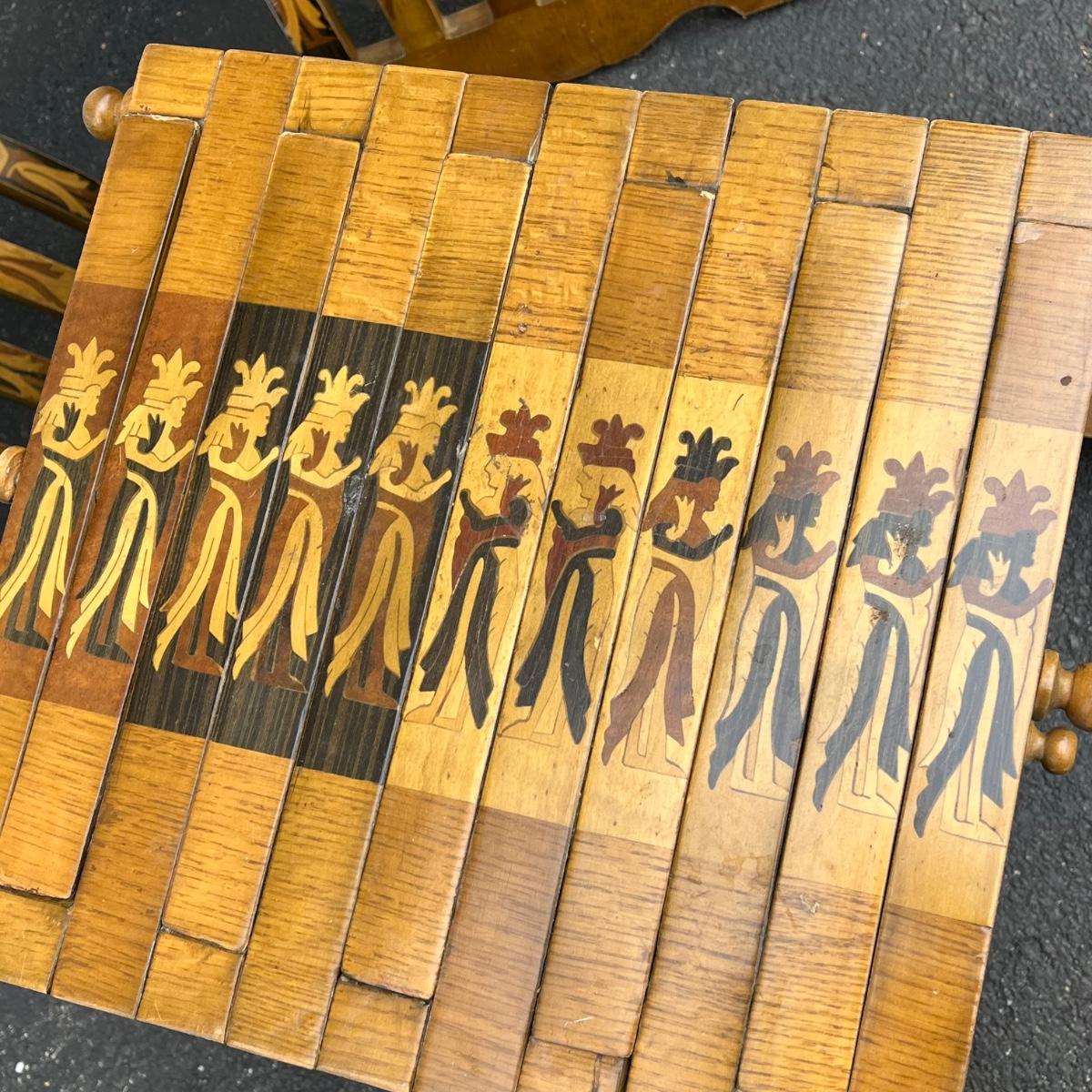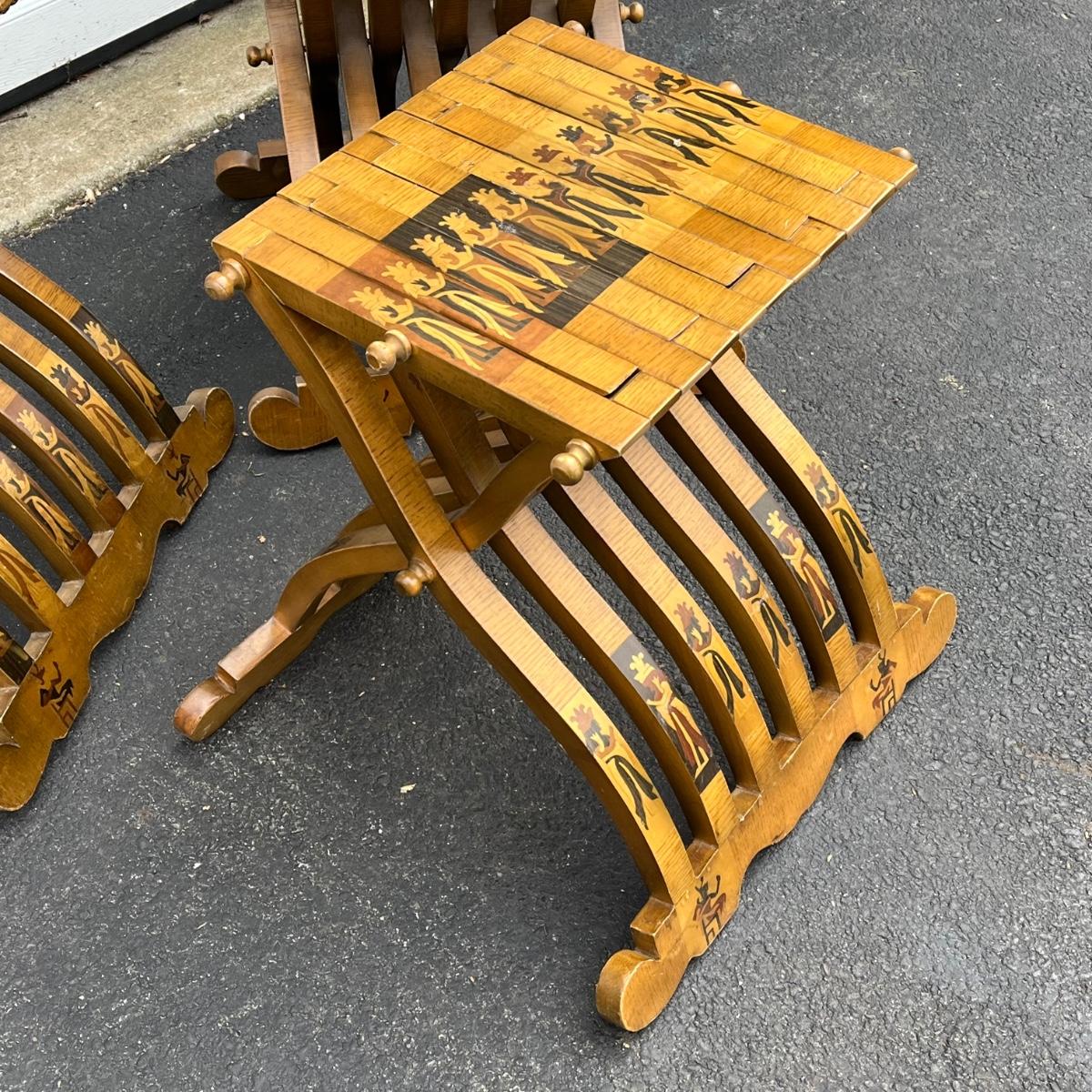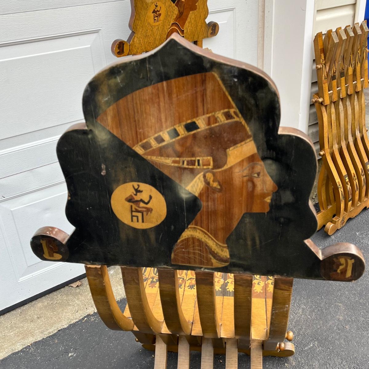 LOT 86G: Egyptian Themed Wooden Folding Chairs and Table Set