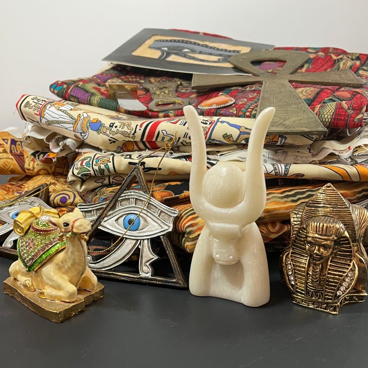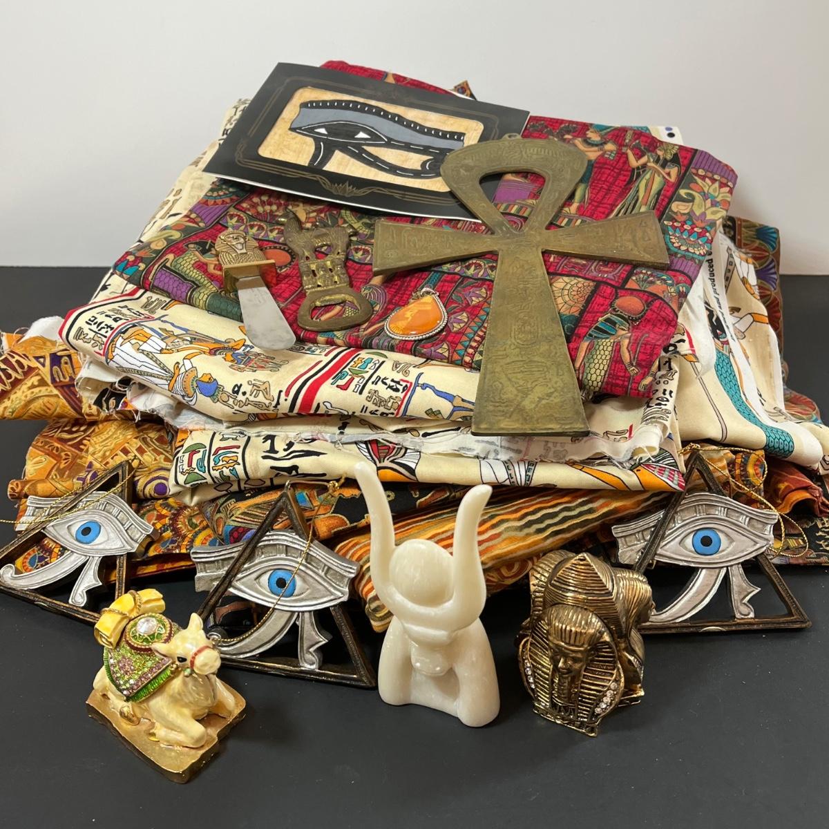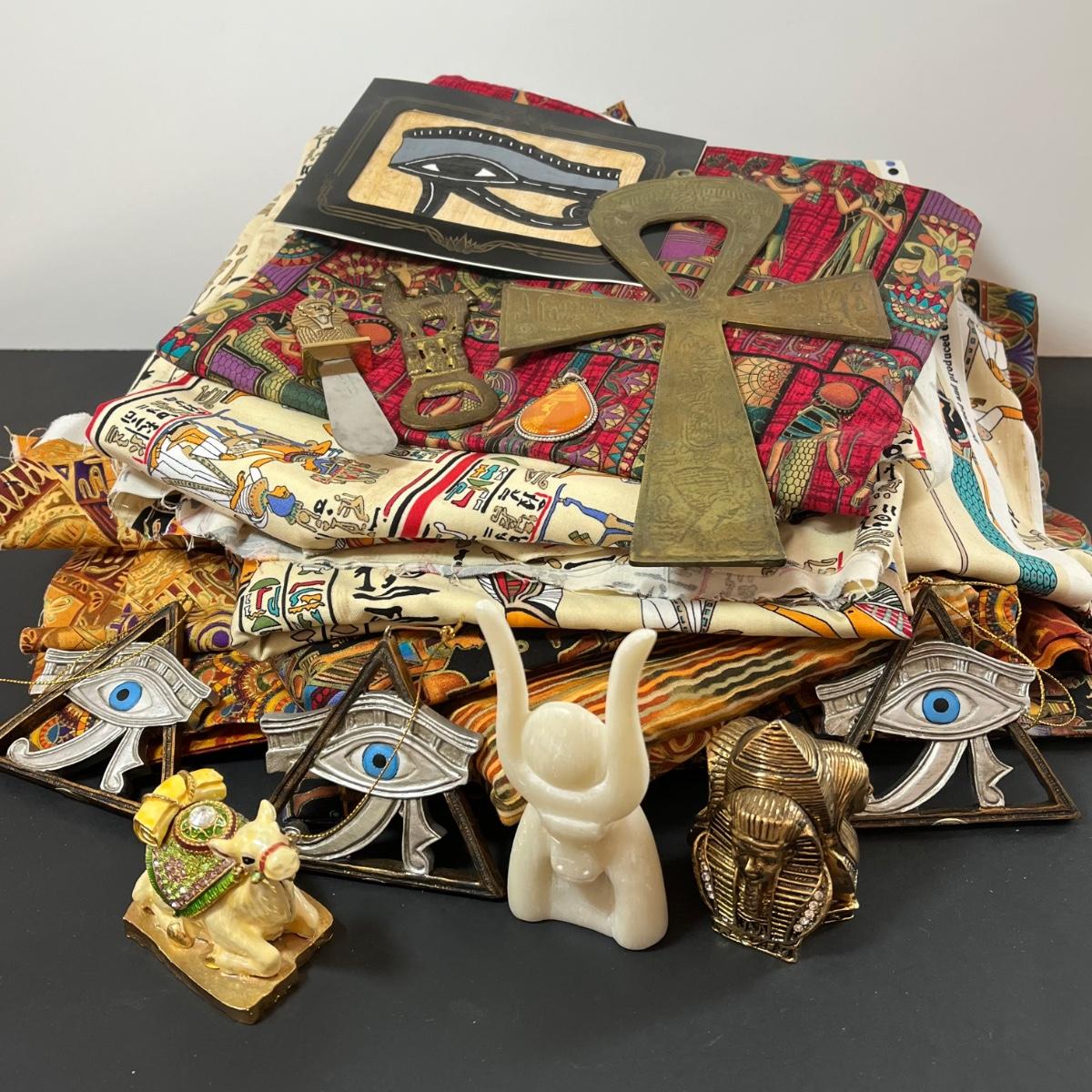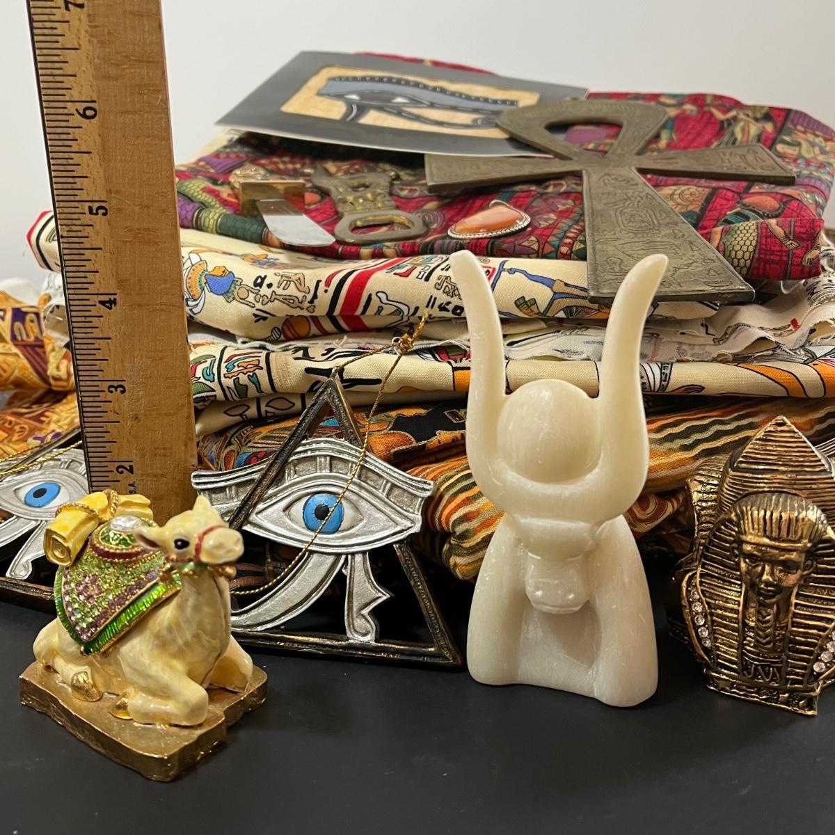 LOT 107G: Egyptian Themed Home Decor - Fabrics, Figurines, Magnetic Closure Trinket Dishes and More