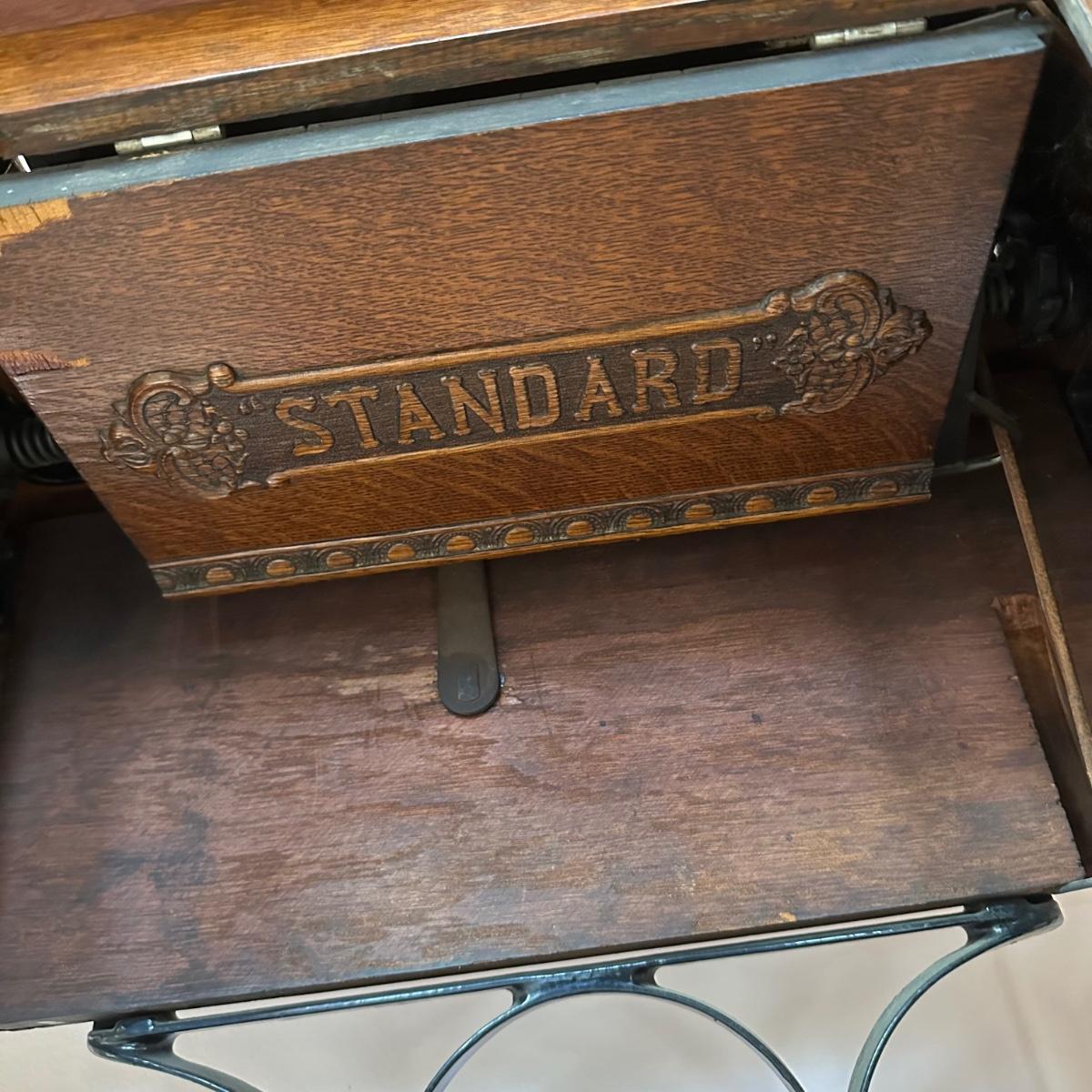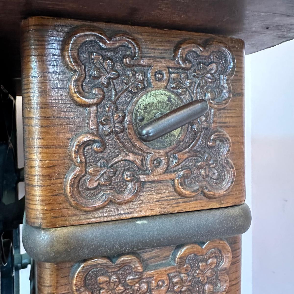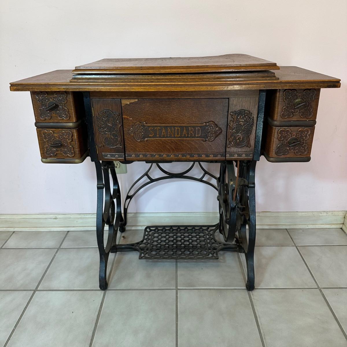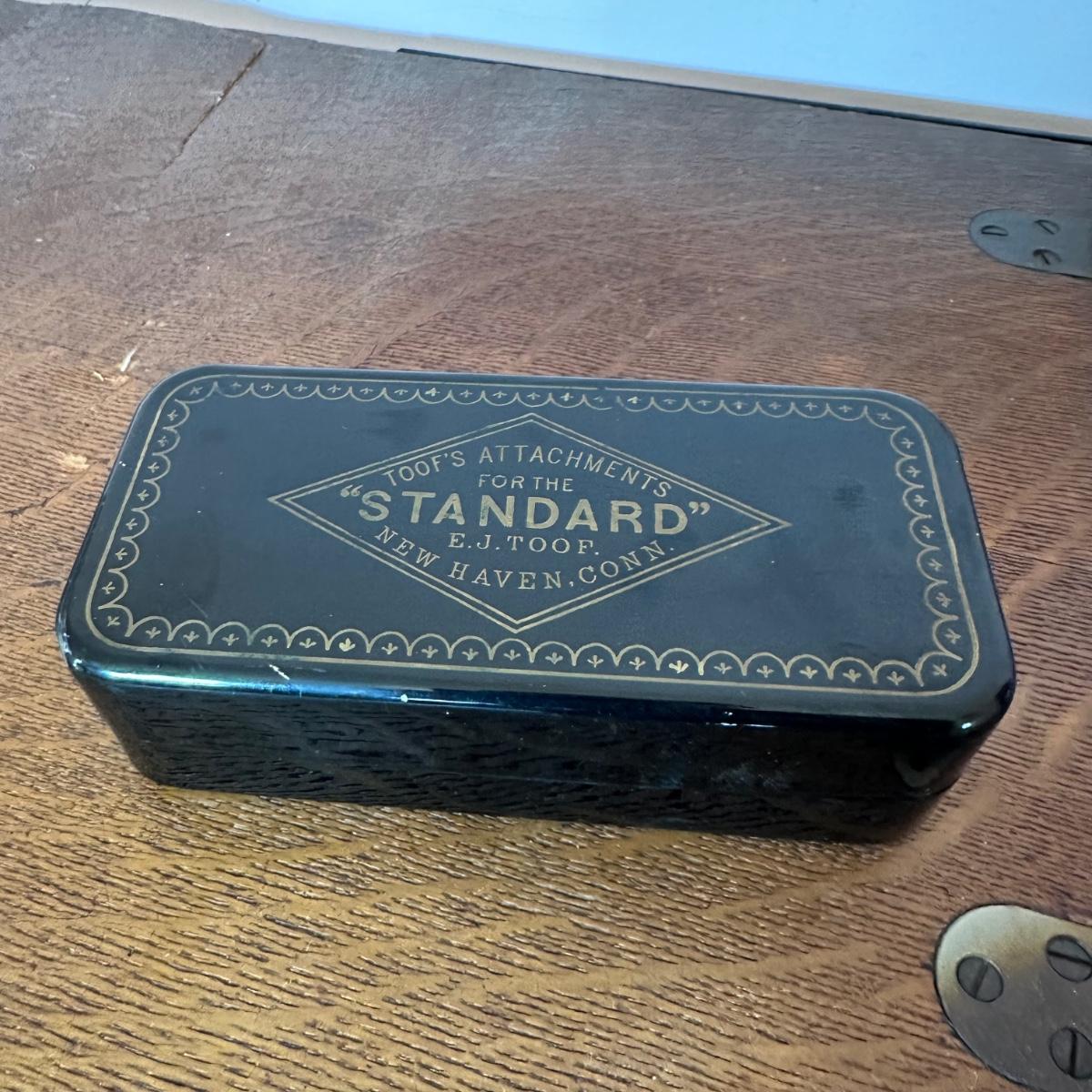 LOT 124S: Antique Standard Treadle Sewing Machine w/ key & Accessories
