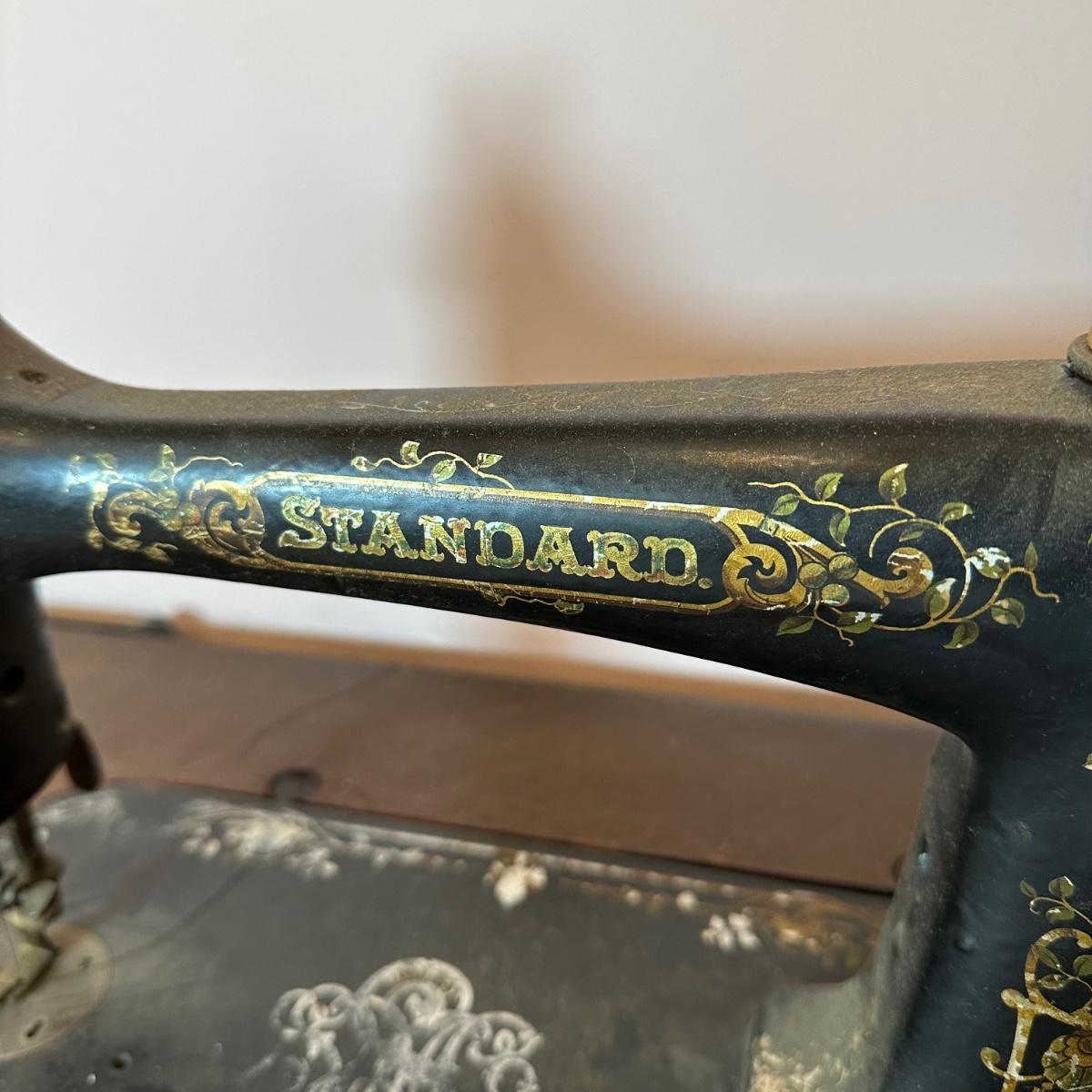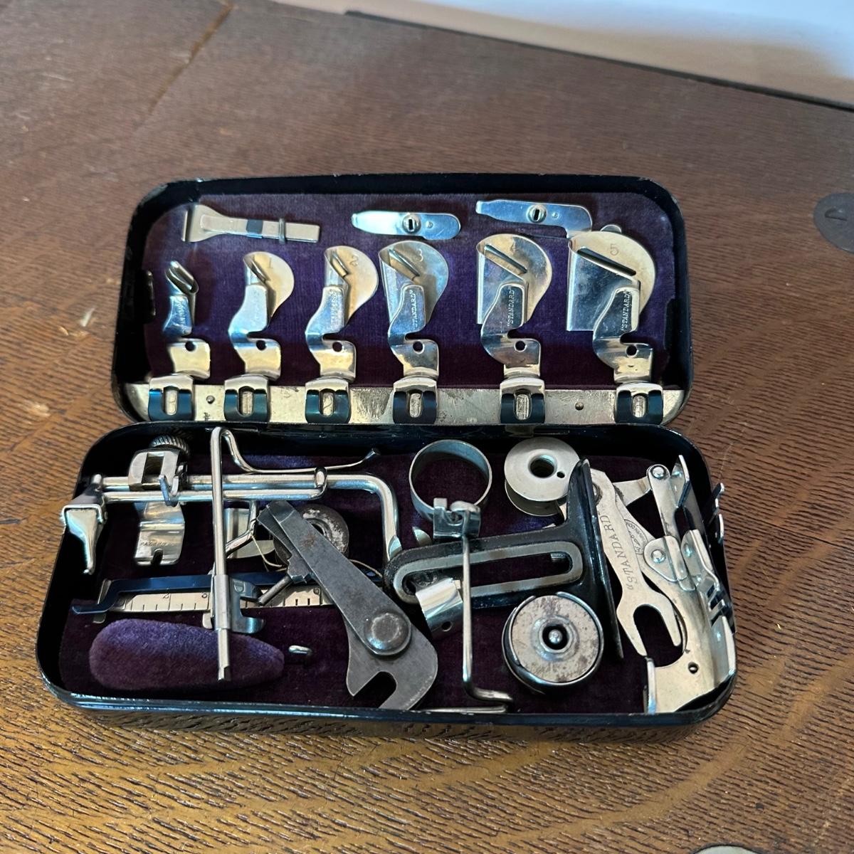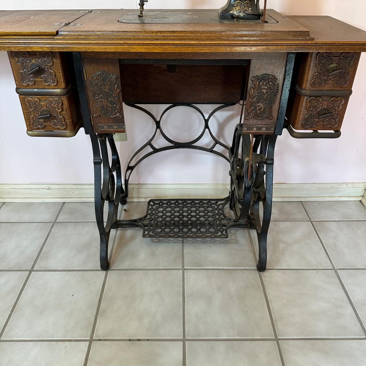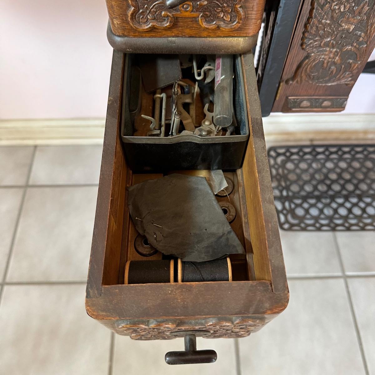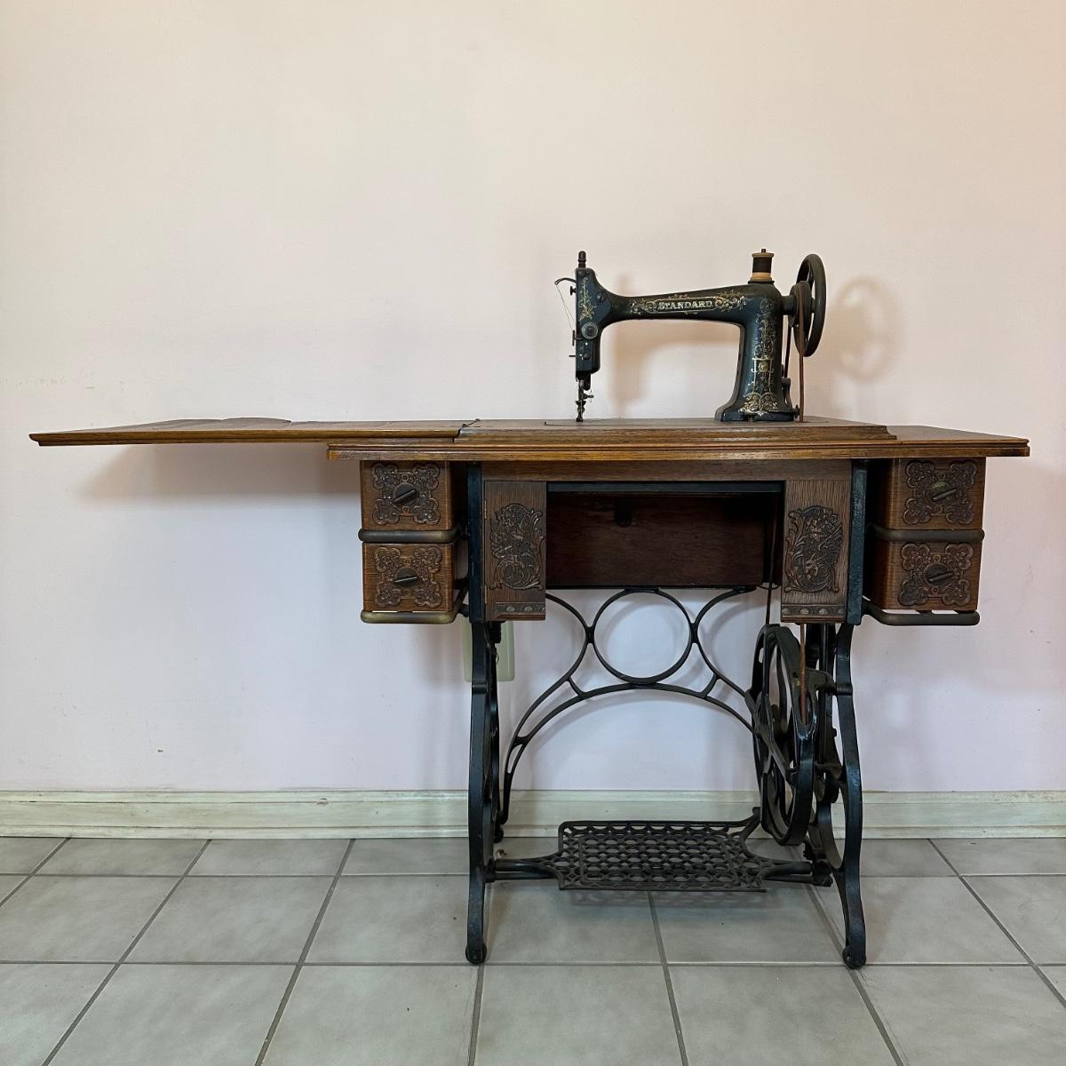 LOT 124S: Antique Standard Treadle Sewing Machine w/ key & Accessories
