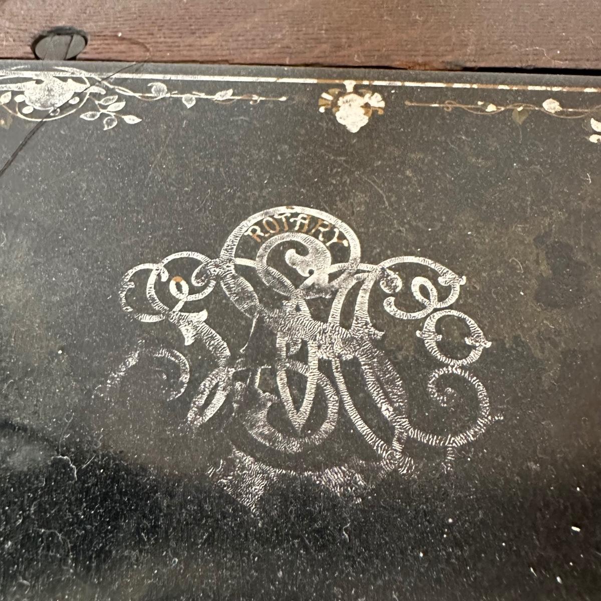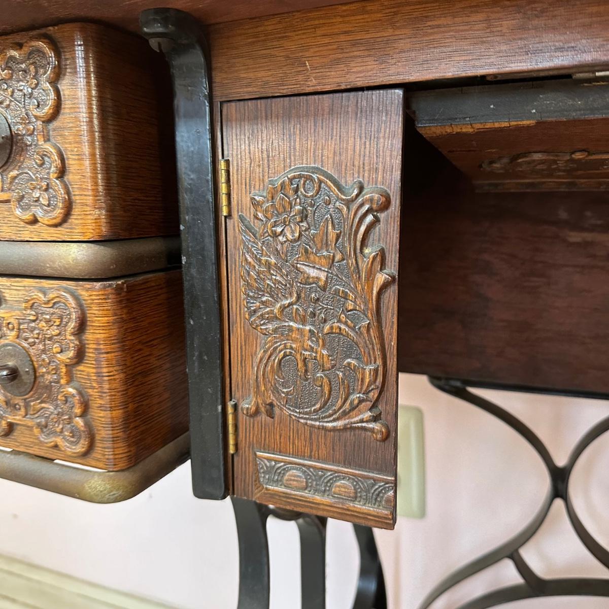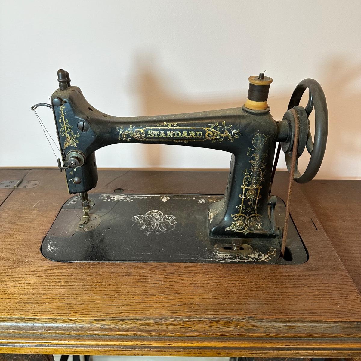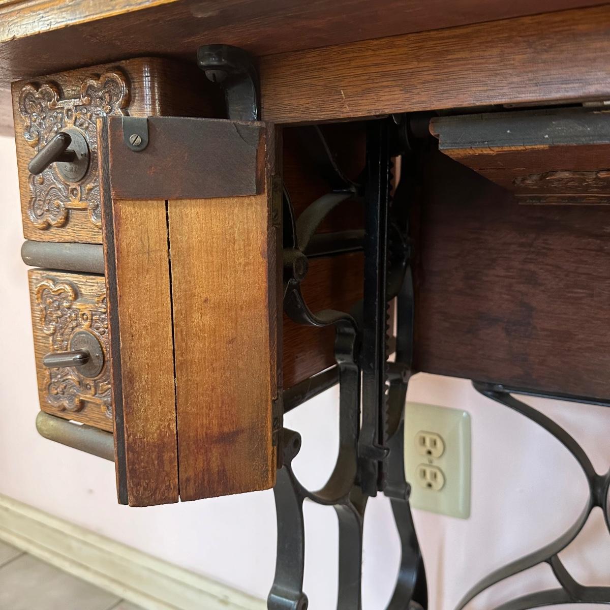 LOT 124S: Antique Standard Treadle Sewing Machine w/ key & Accessories