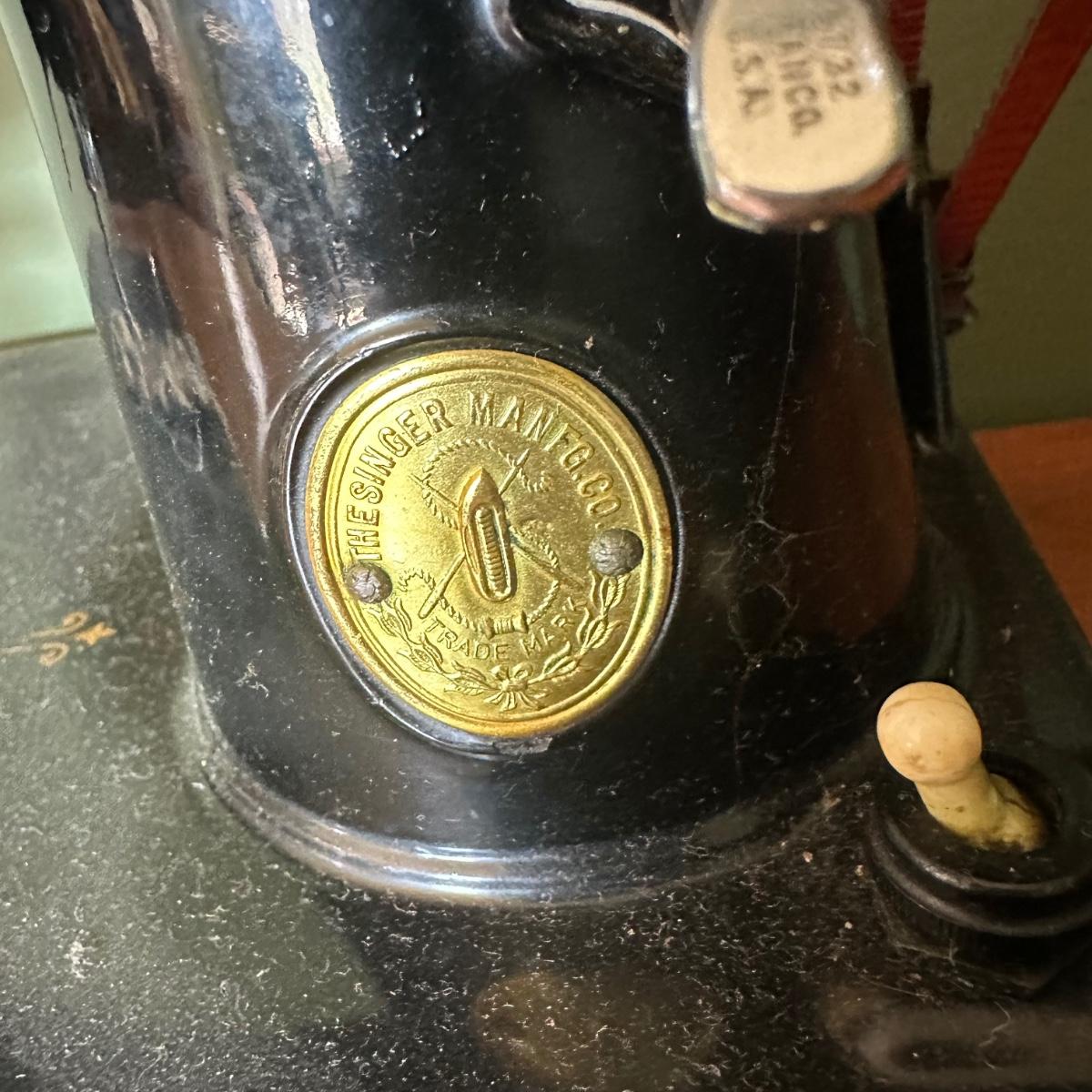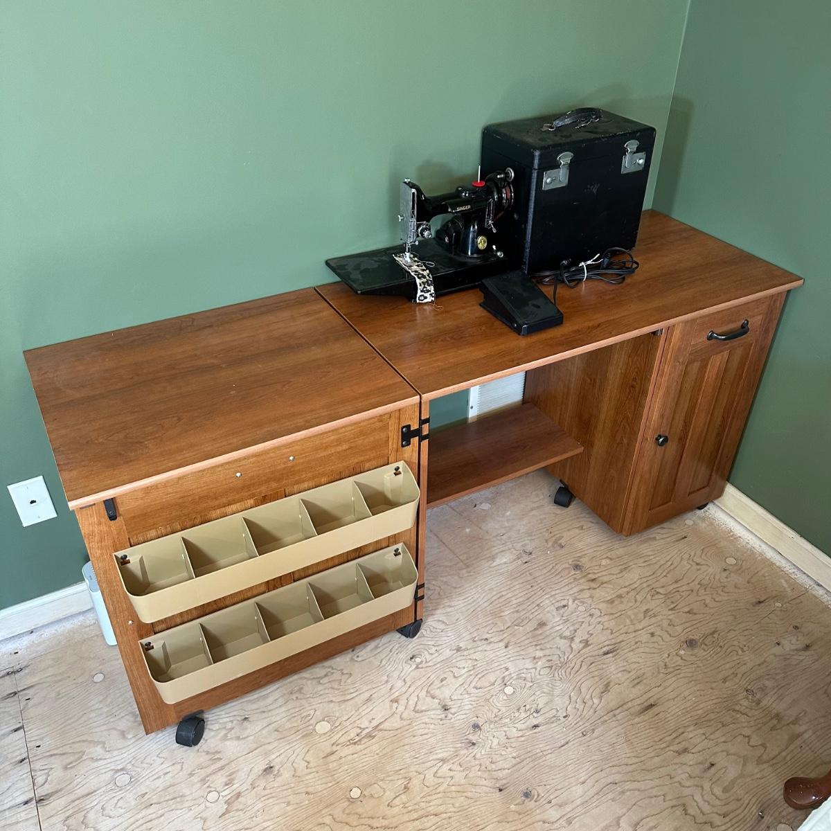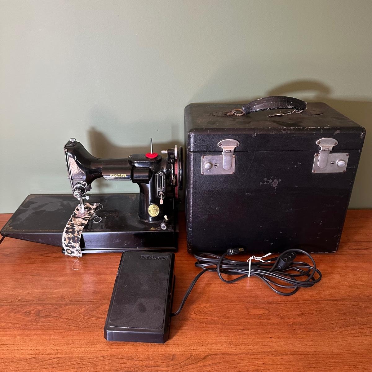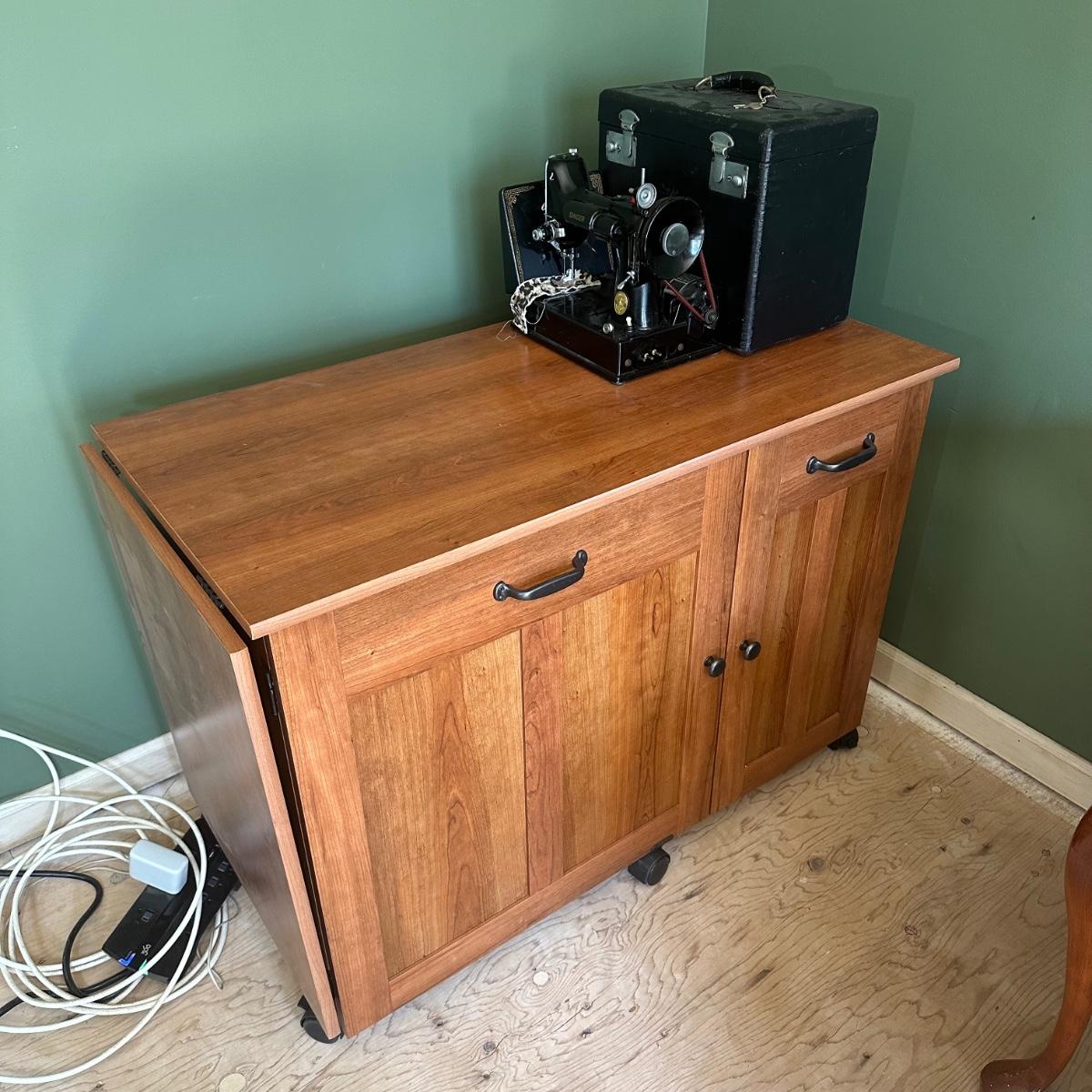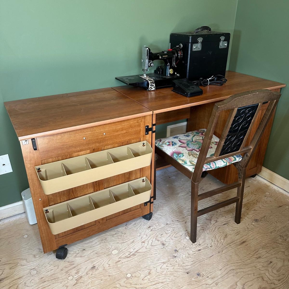 LOT 153S: Collapsing Wooden Sewing Table w/ Vintage Singer Sewing Machine & Chair