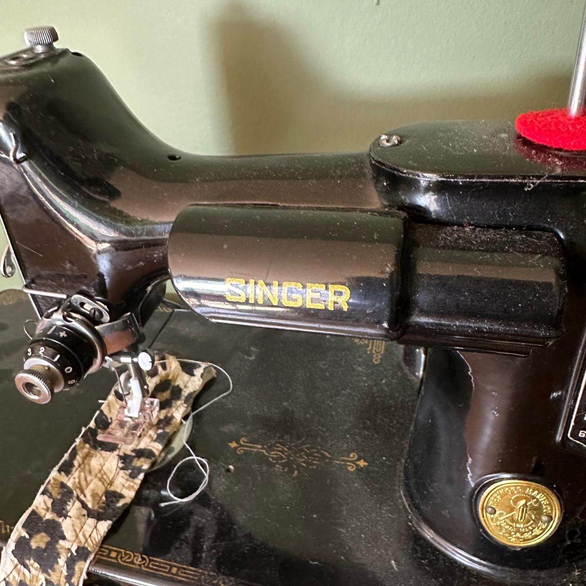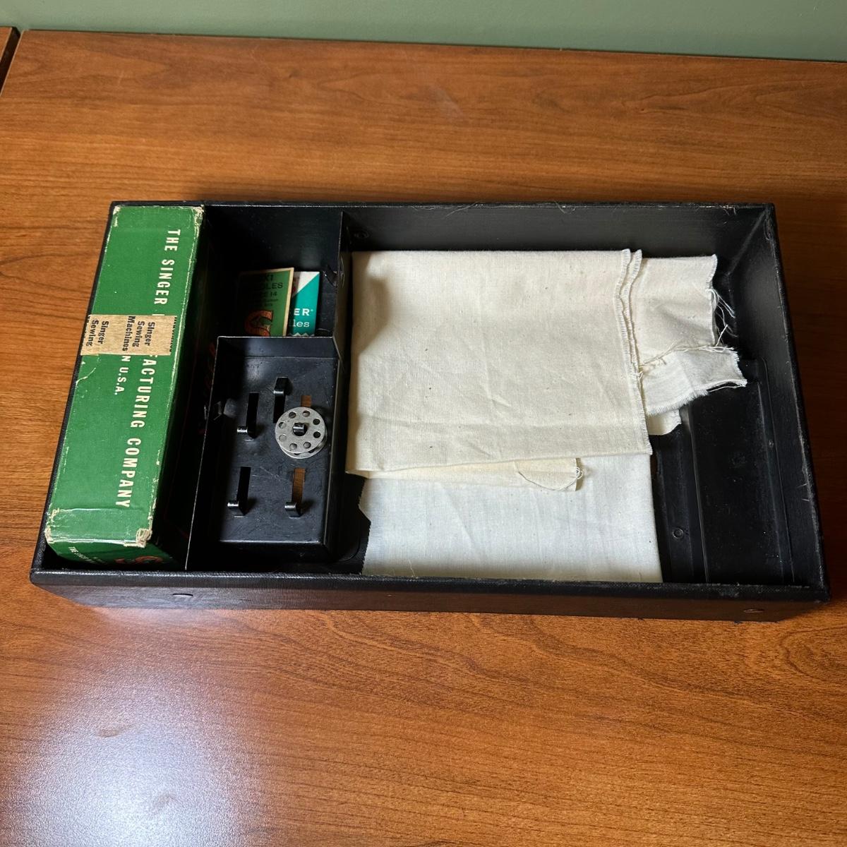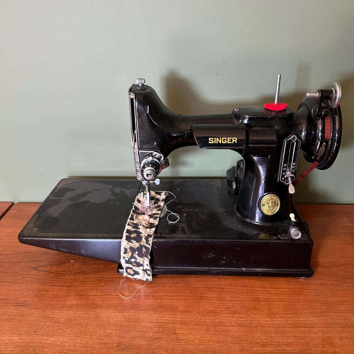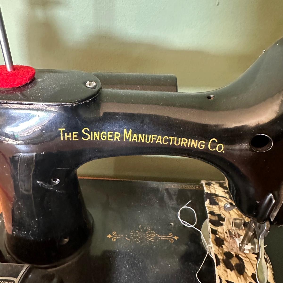 LOT 153S: Collapsing Wooden Sewing Table w/ Vintage Singer Sewing Machine & Chair