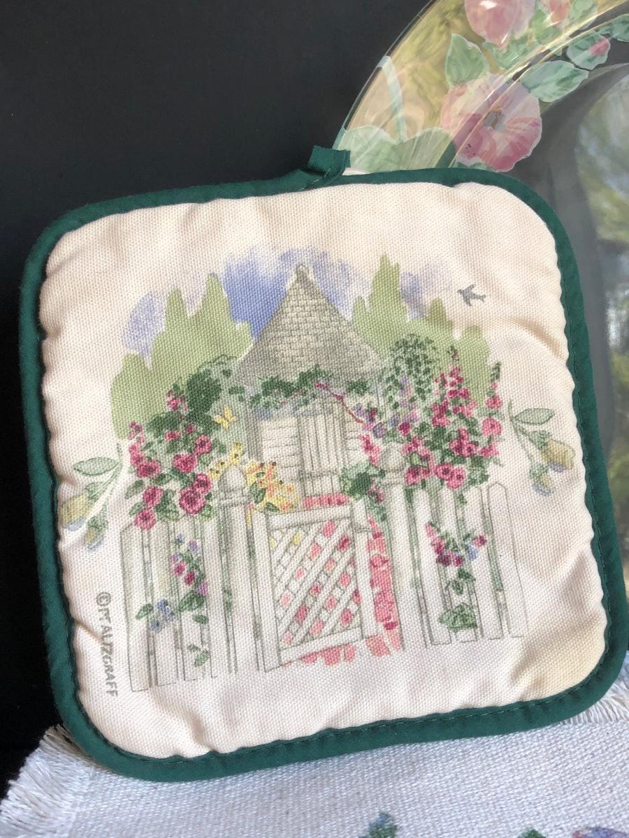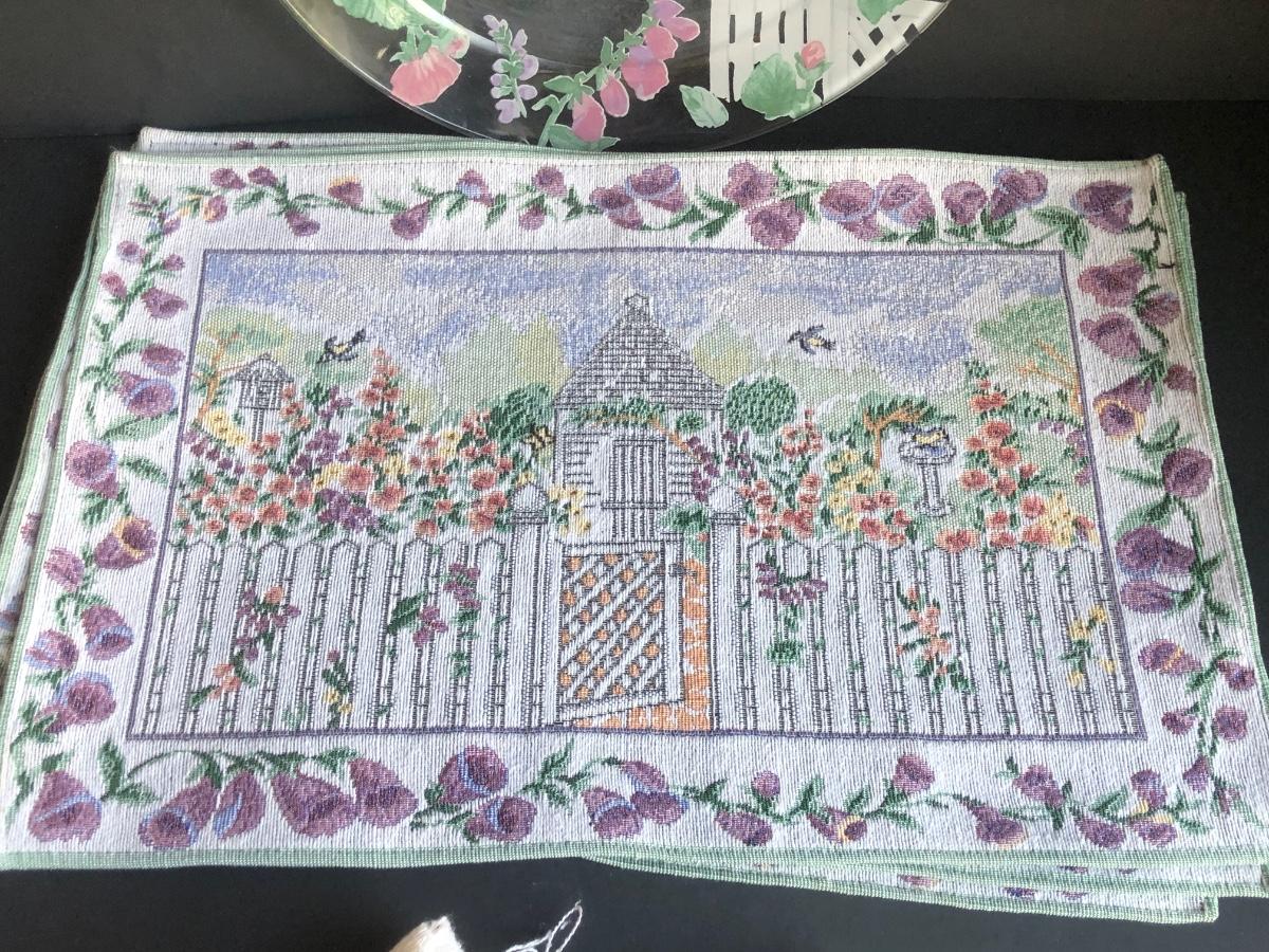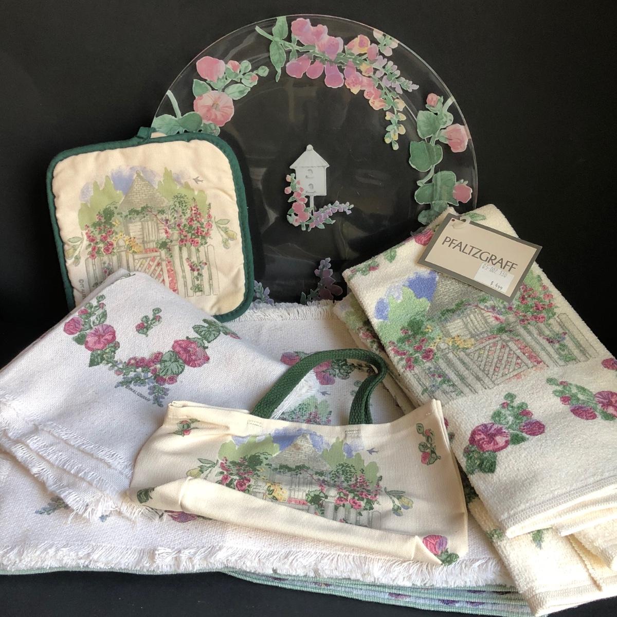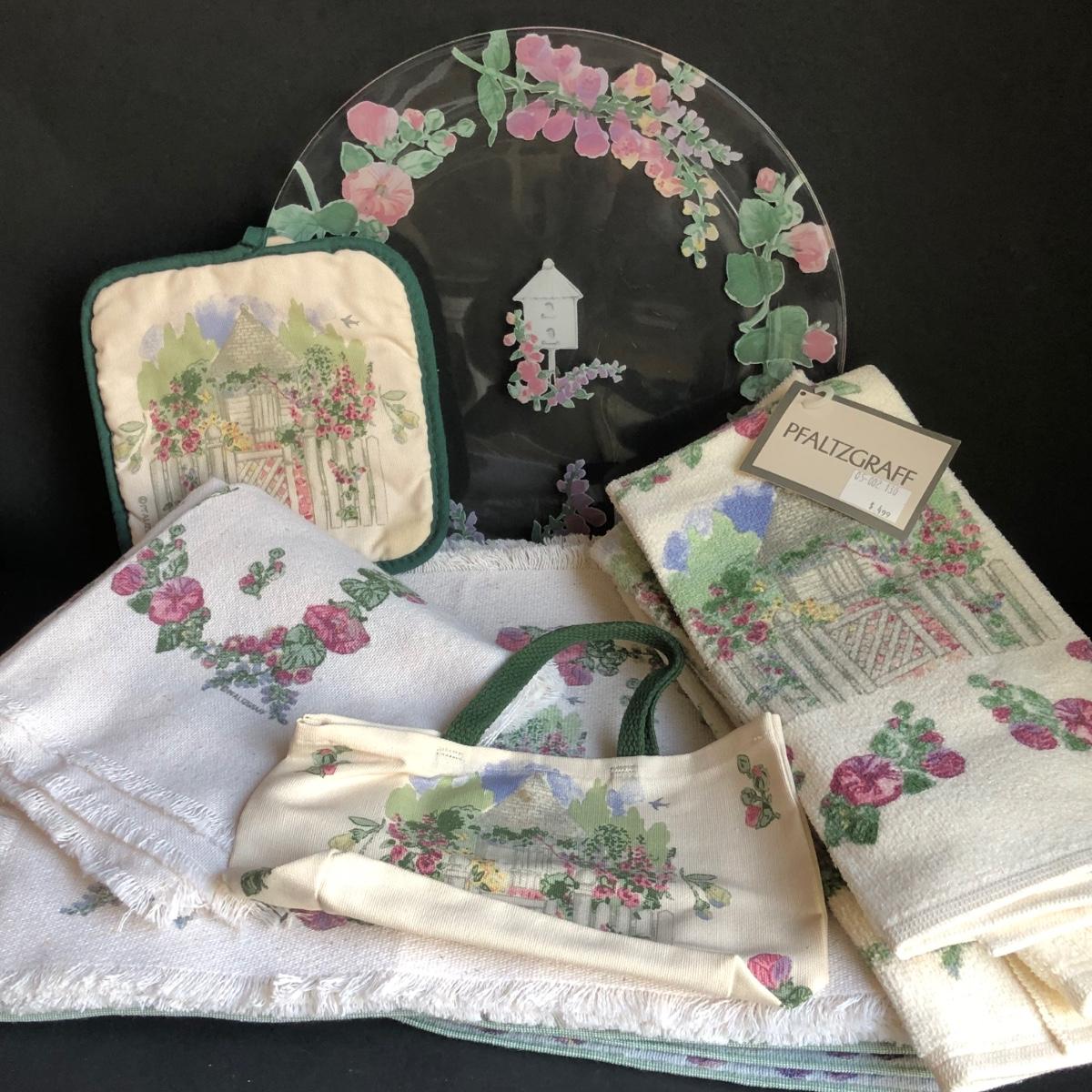 LOT 162K: Pfaltzgraff Cape May Bird House / Garden Gate Collection - Glass Plate, Pot Holder, Tea Towels, Small Bag & Placemats