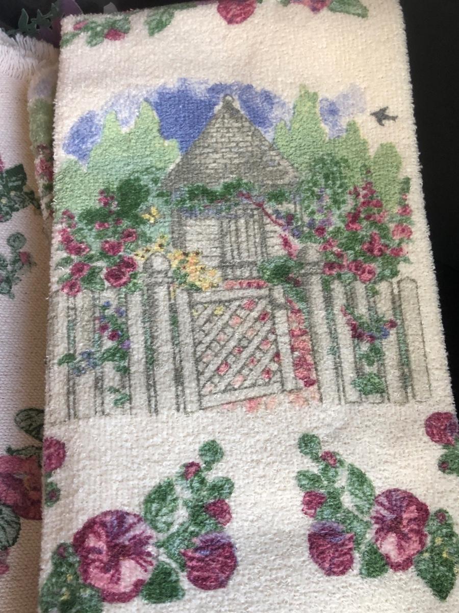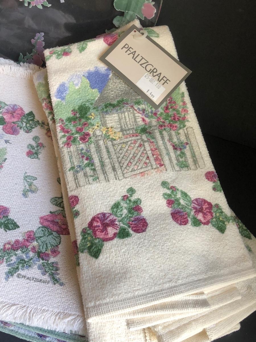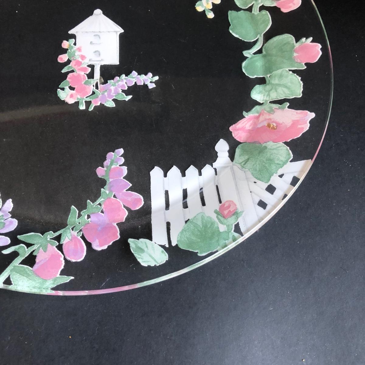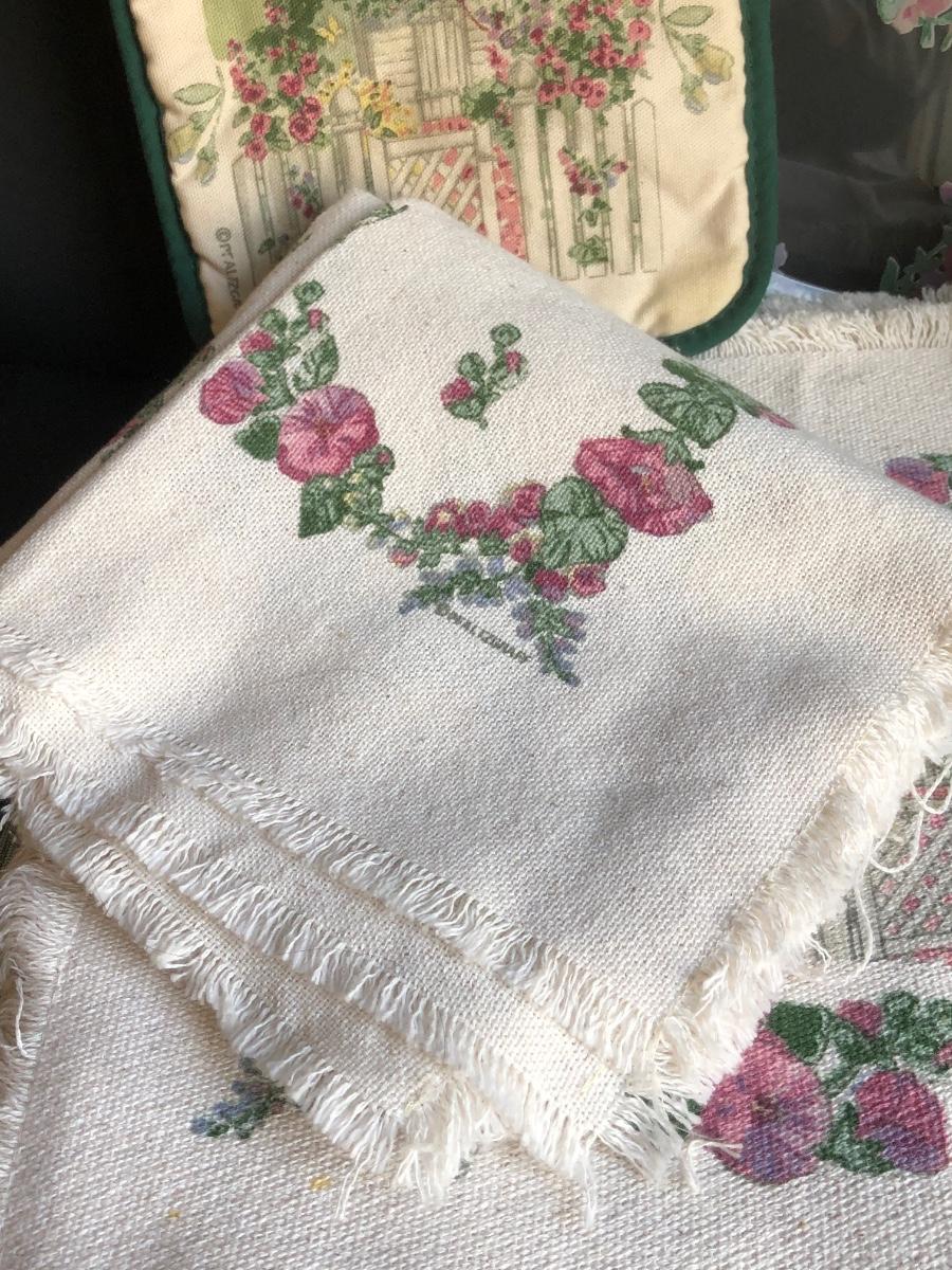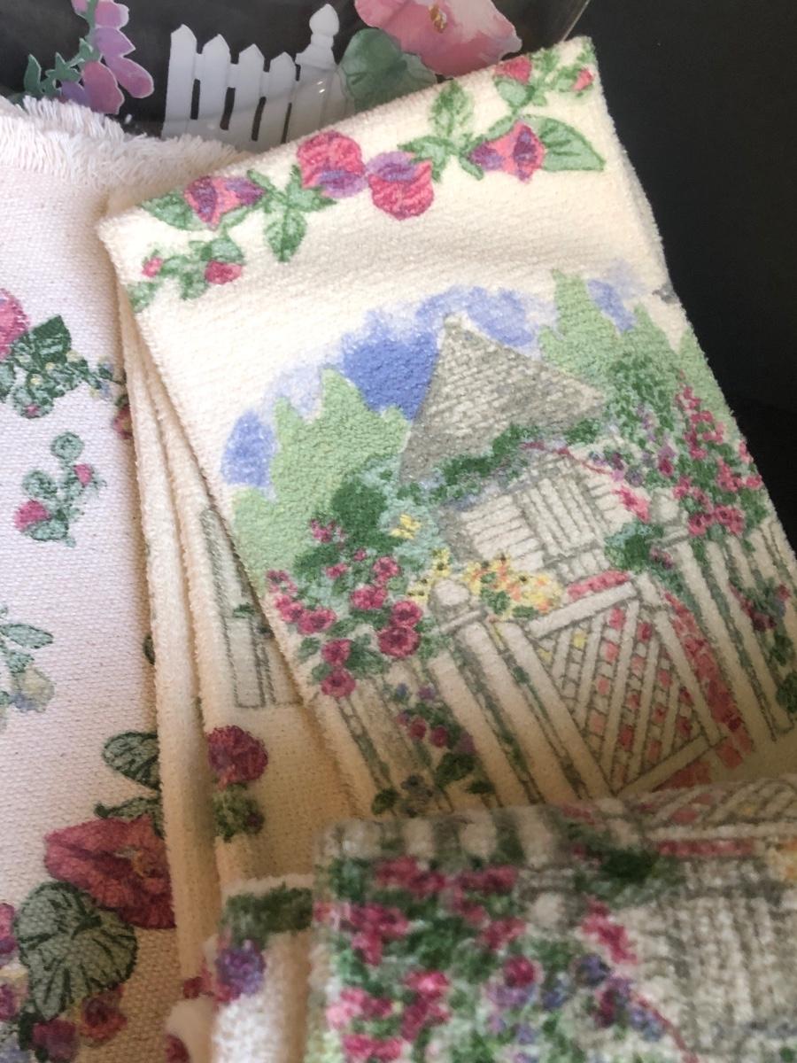 LOT 162K: Pfaltzgraff Cape May Bird House / Garden Gate Collection - Glass Plate, Pot Holder, Tea Towels, Small Bag & Placemats
