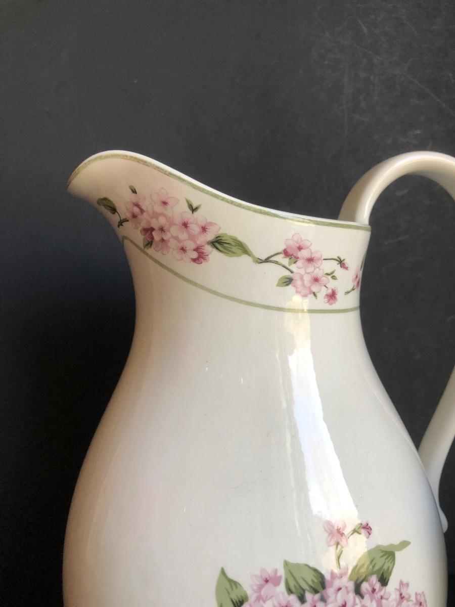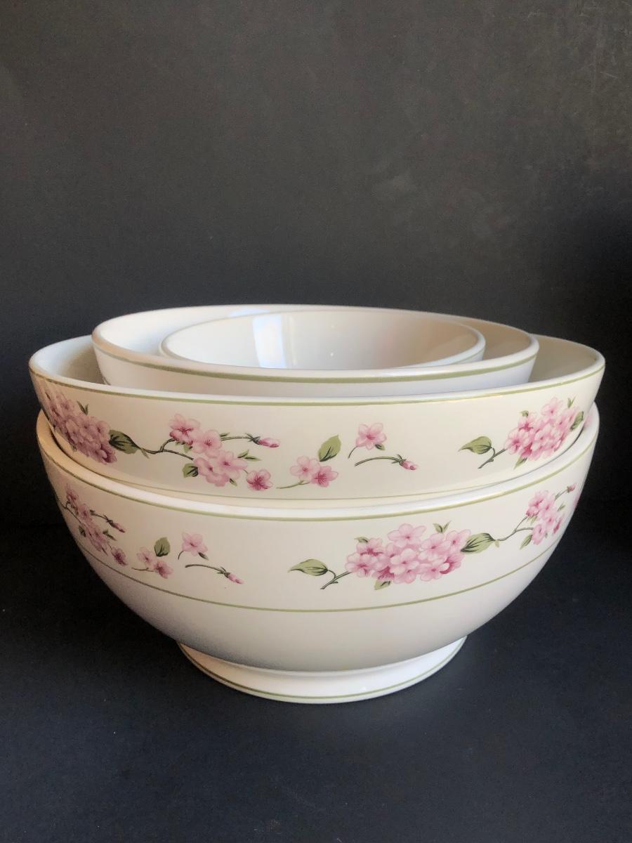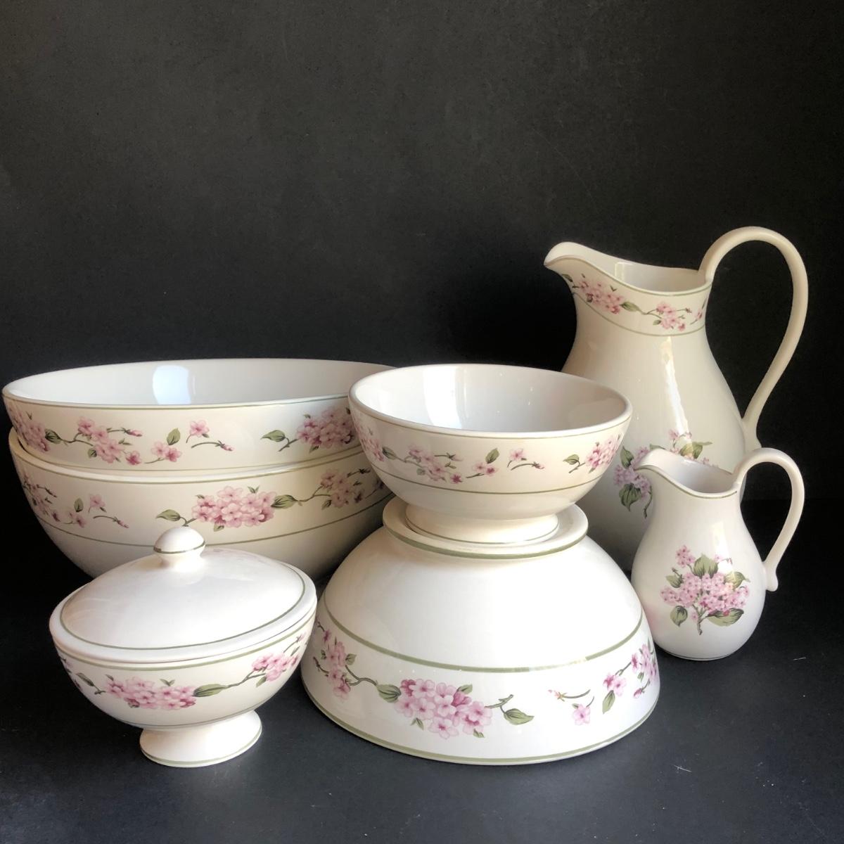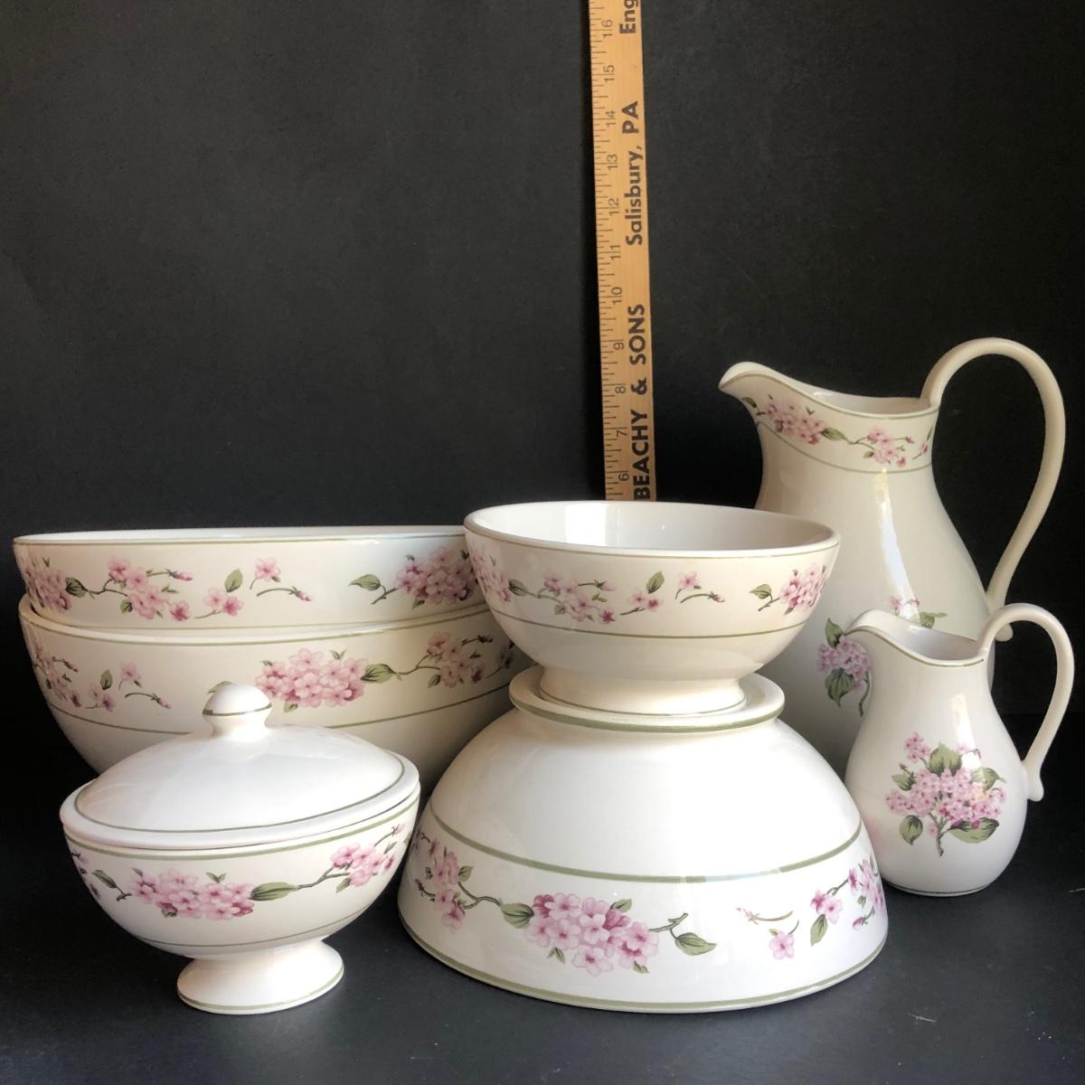 LOT 167K: Martha Steward Hydrangea Pattern China - Pitcher, Sugar Bowl, Creamer & Mixing Bowls
