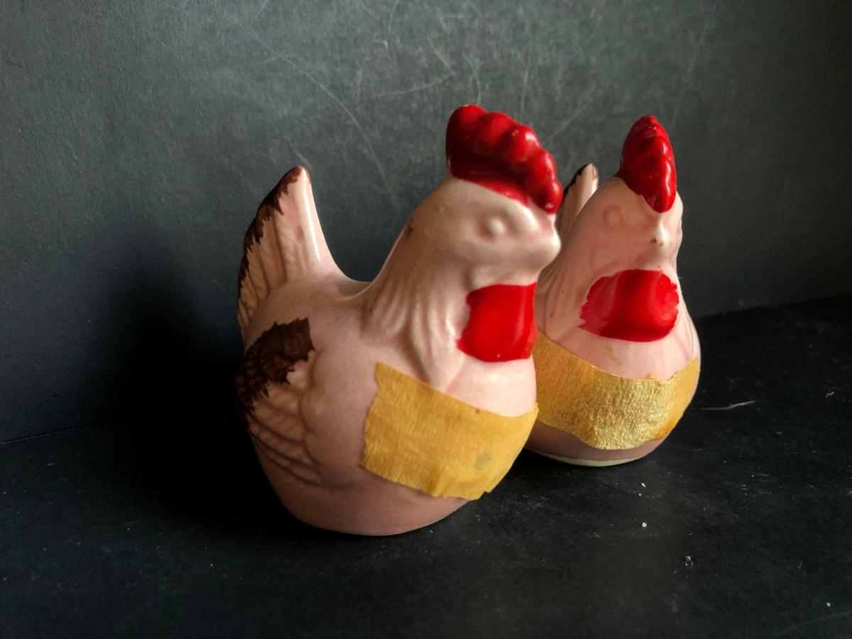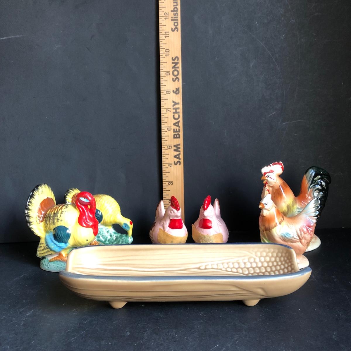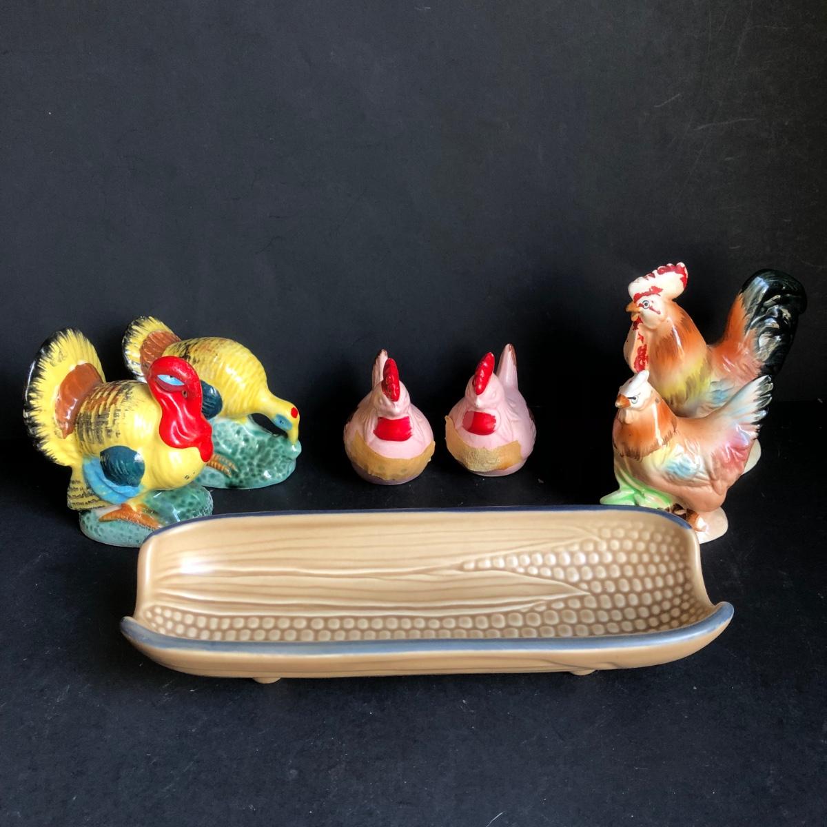 LOT 193K: Pfaltzgraff Corn Dish w/ Chicken, Rooster & Turkey Salt and Pepper Shakers