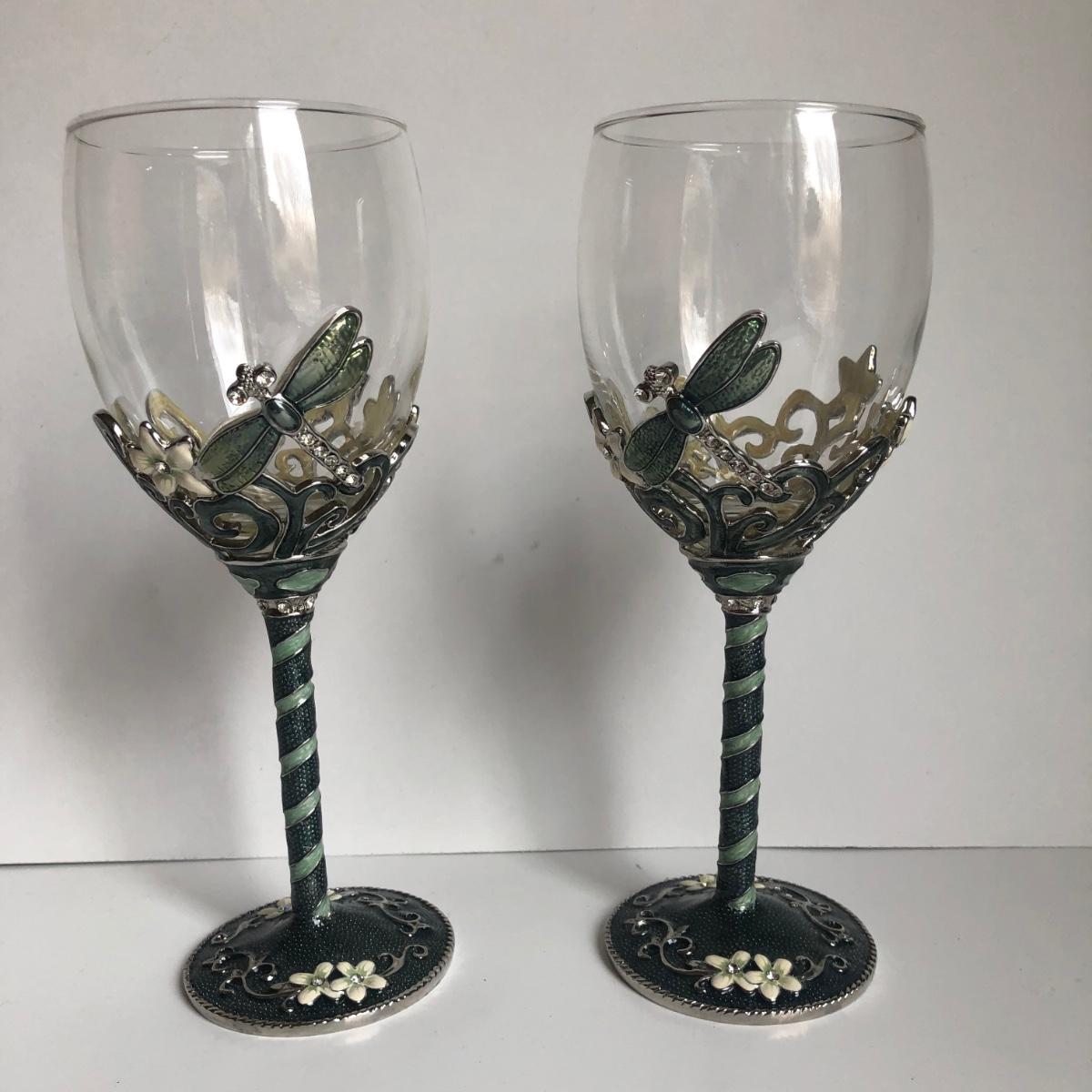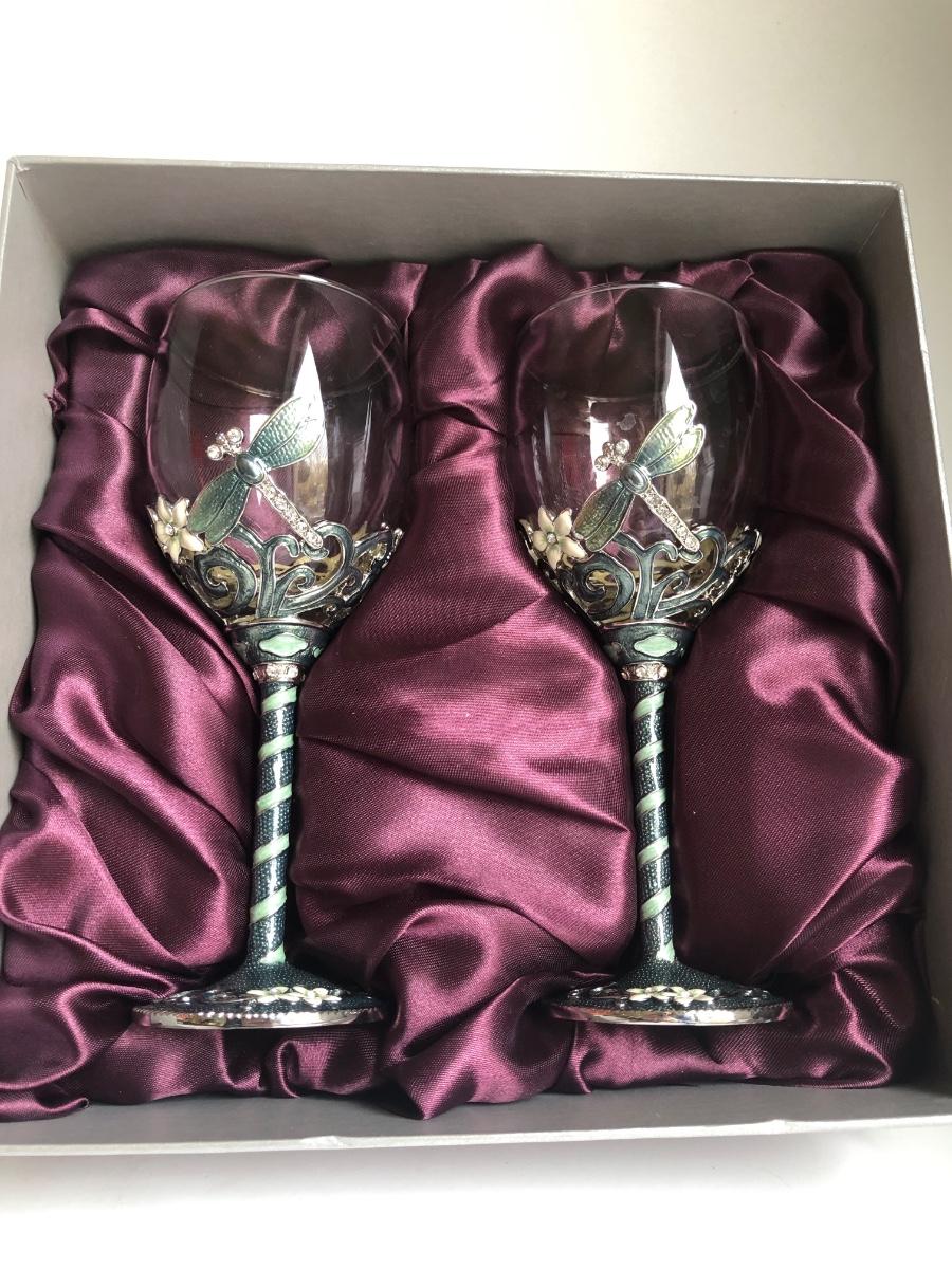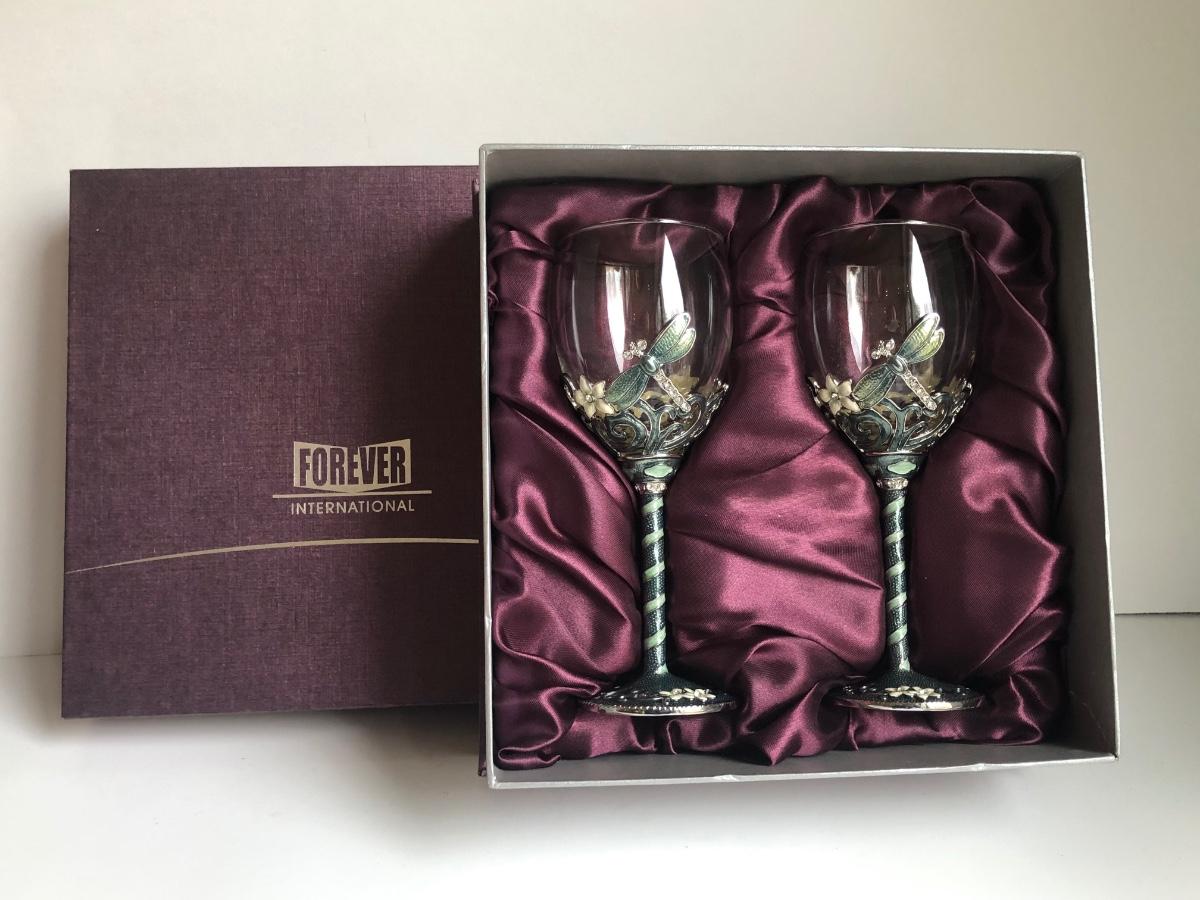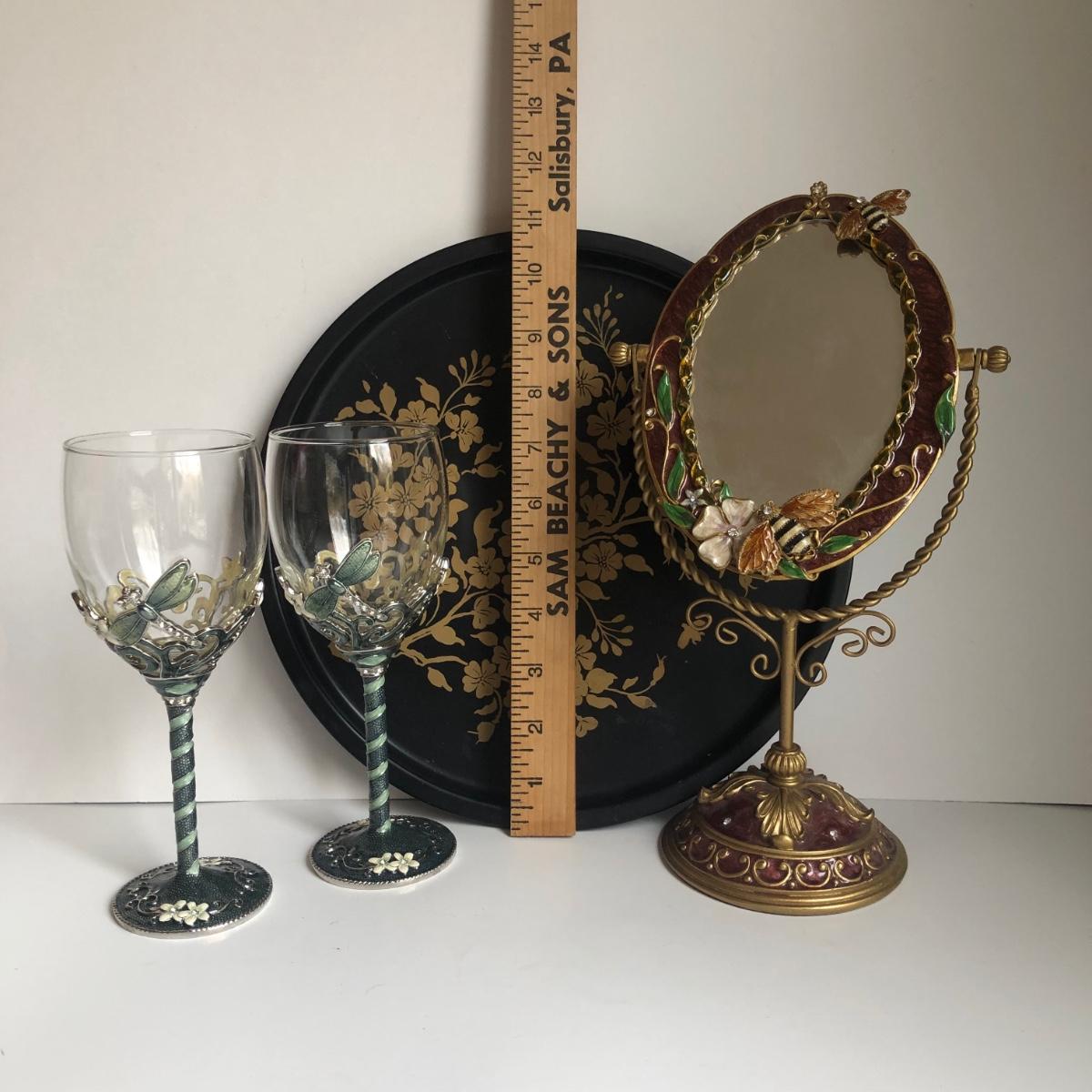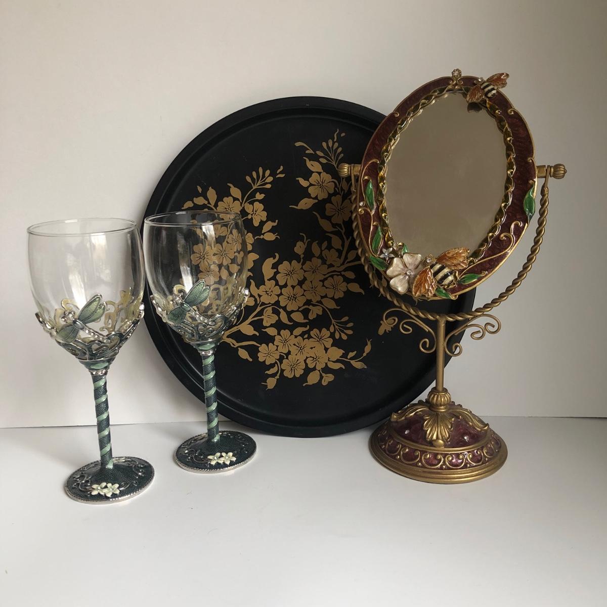 LOT 198L: Forever International Dragonfly Wine Glasses w/ Lined Box, Gilded Ornate Bee Mirror & Floral Tray