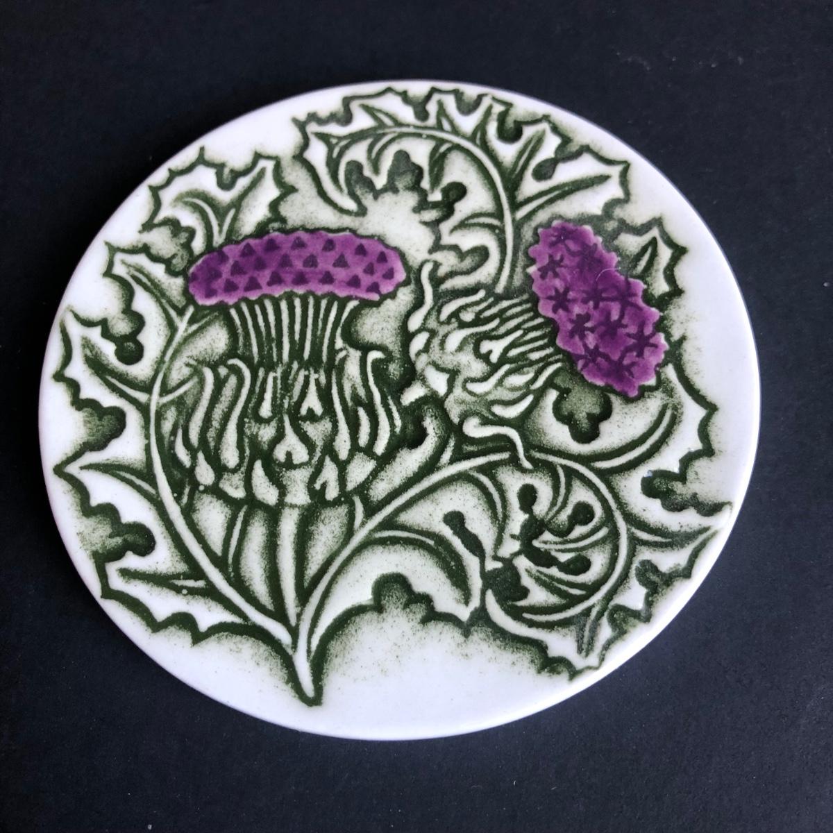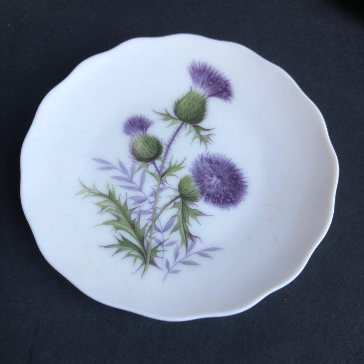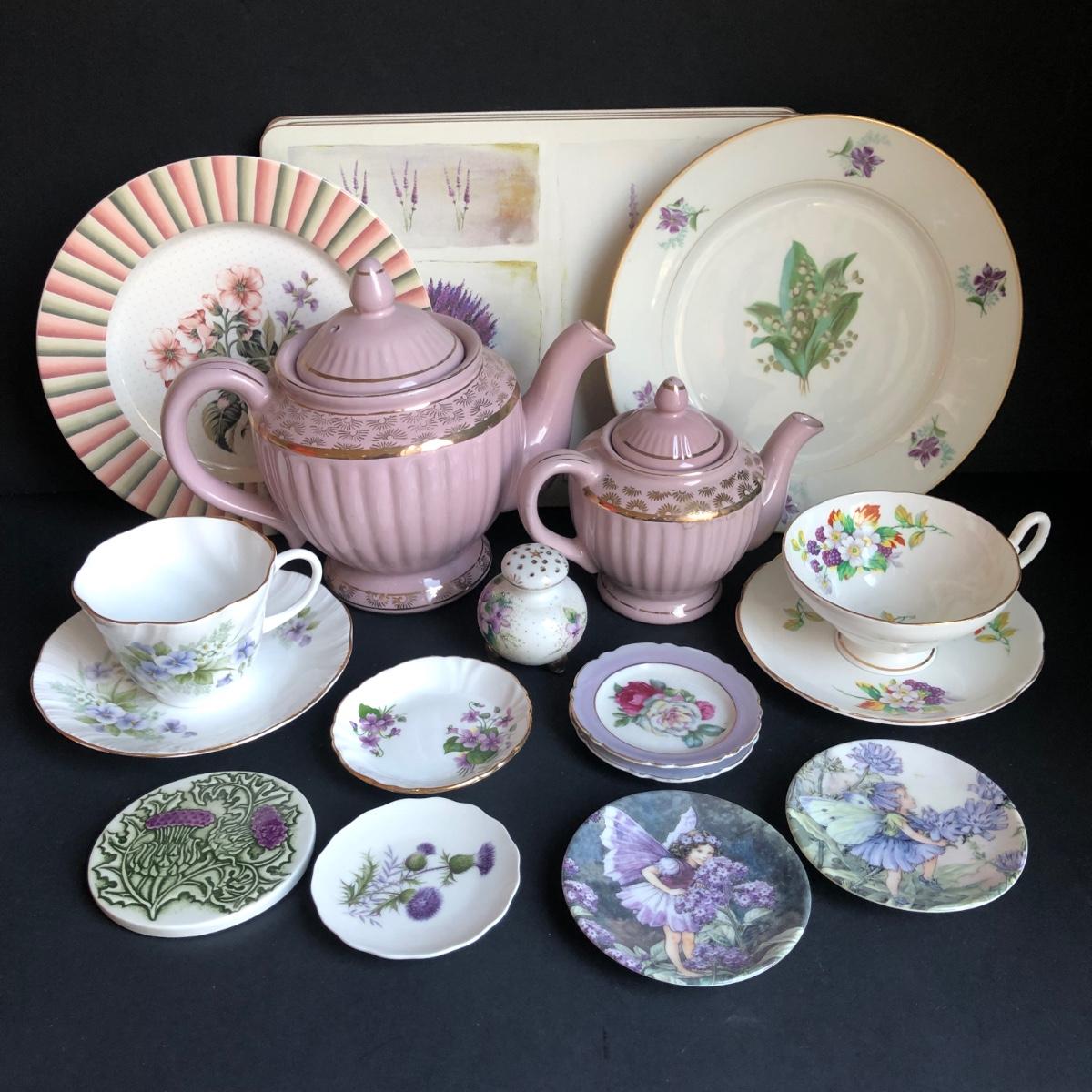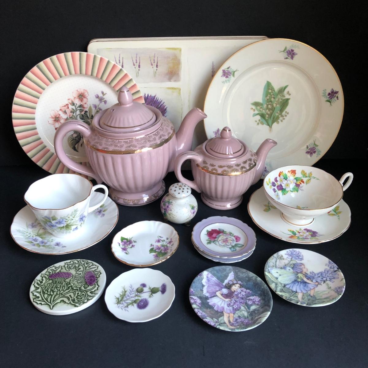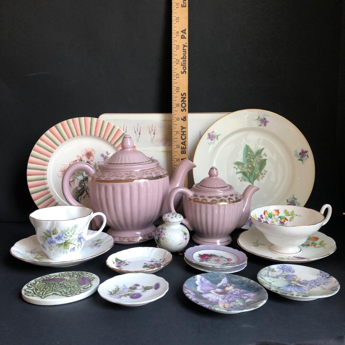 LOT 204L: Purple China & More - Scottish Thistle Dishes, Flower Fairies Trinket Dishes, Lenox Herbal Garden Plate, Teapots, Cork Back Placemats & More