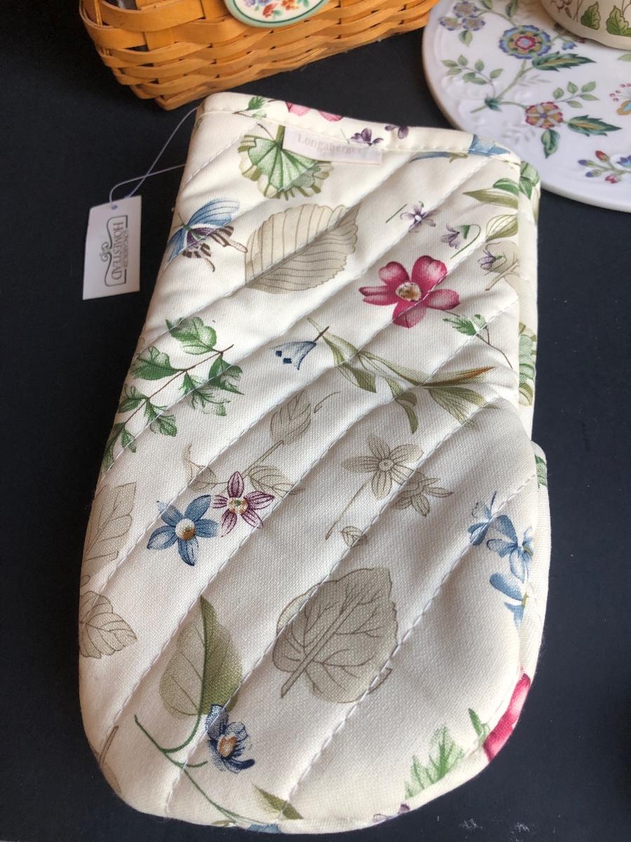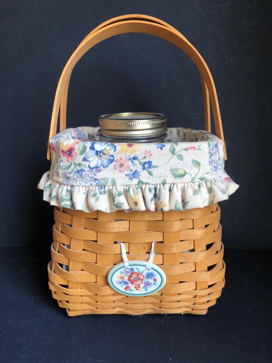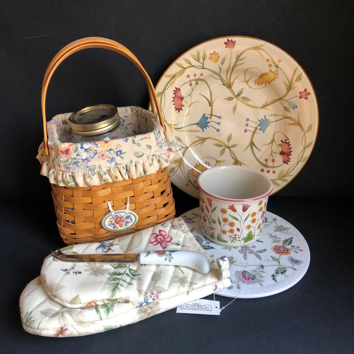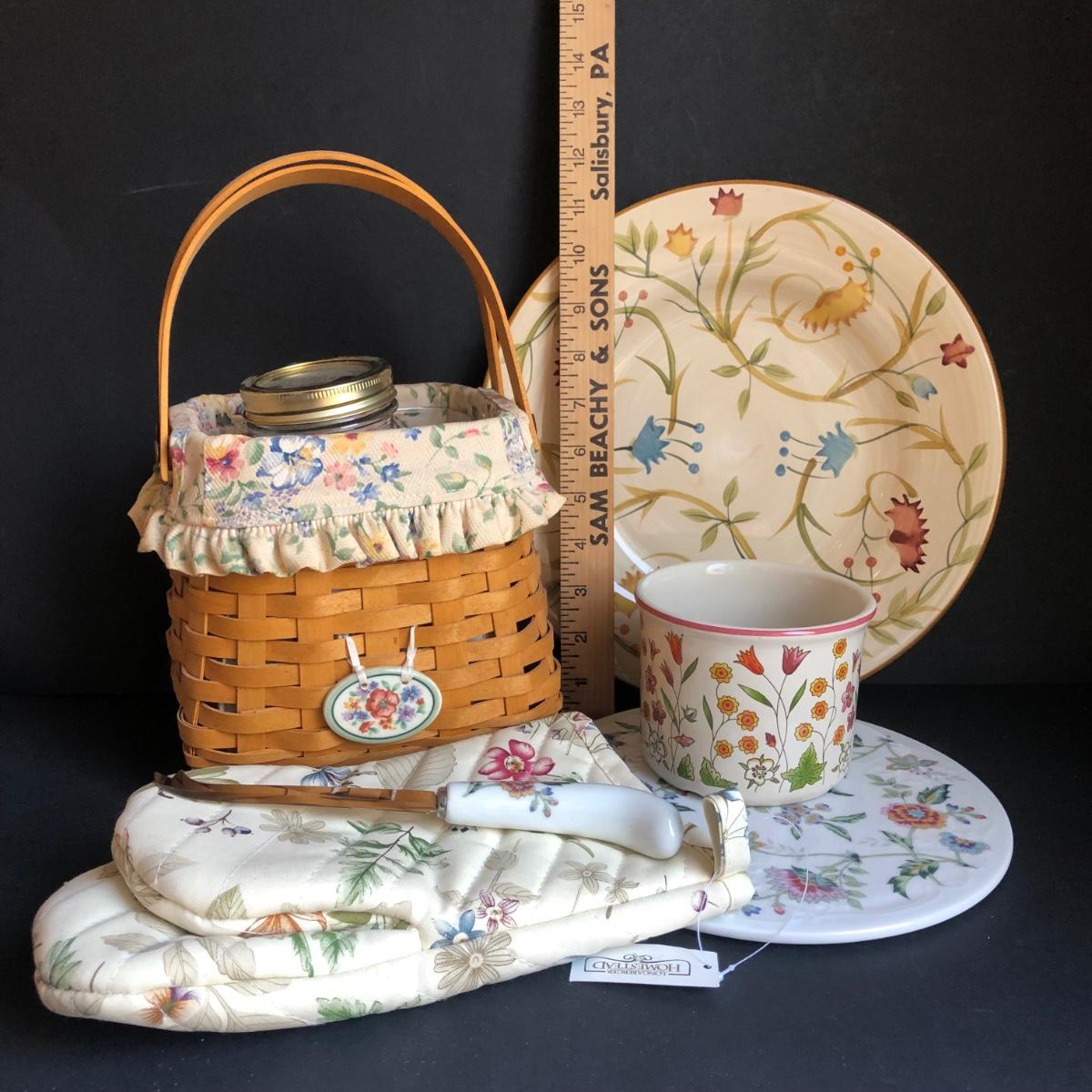 LOT 209S: Longaberger & More - Floral Basket, Blue Ribbon Glass Jar, Pottery Planter, Oven Mitt & More