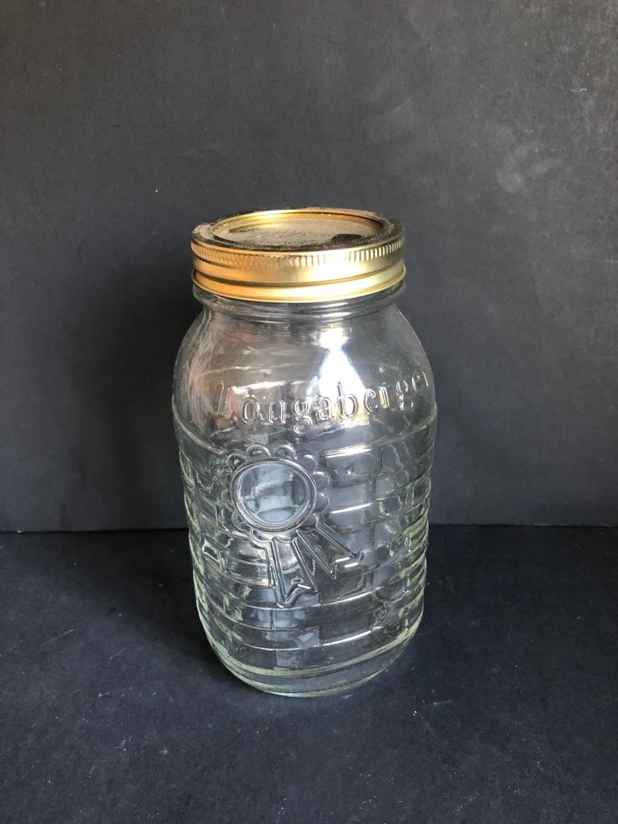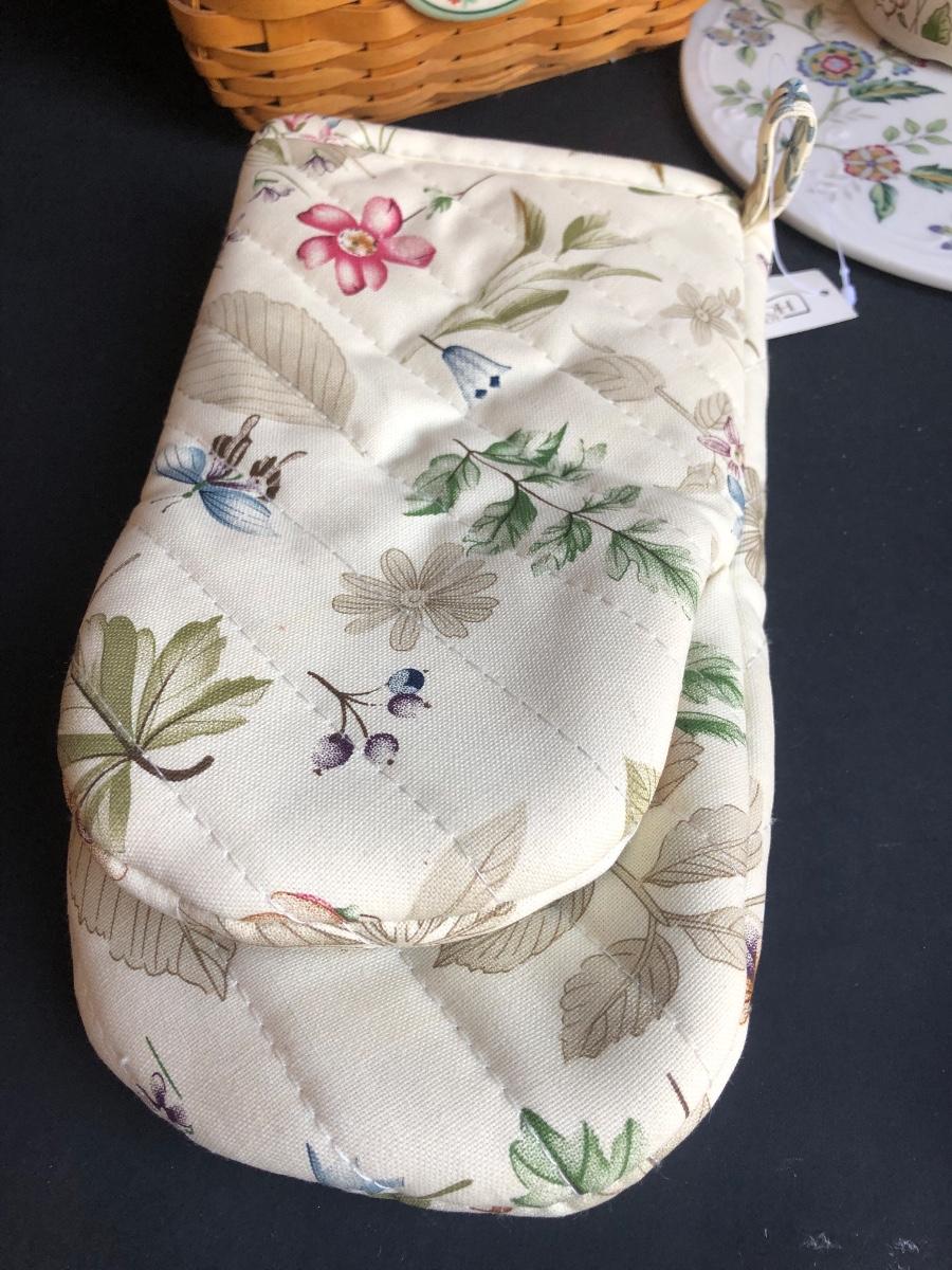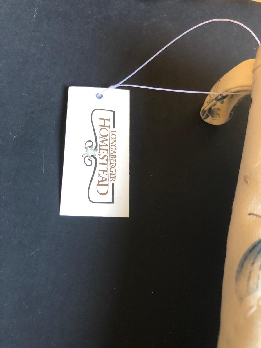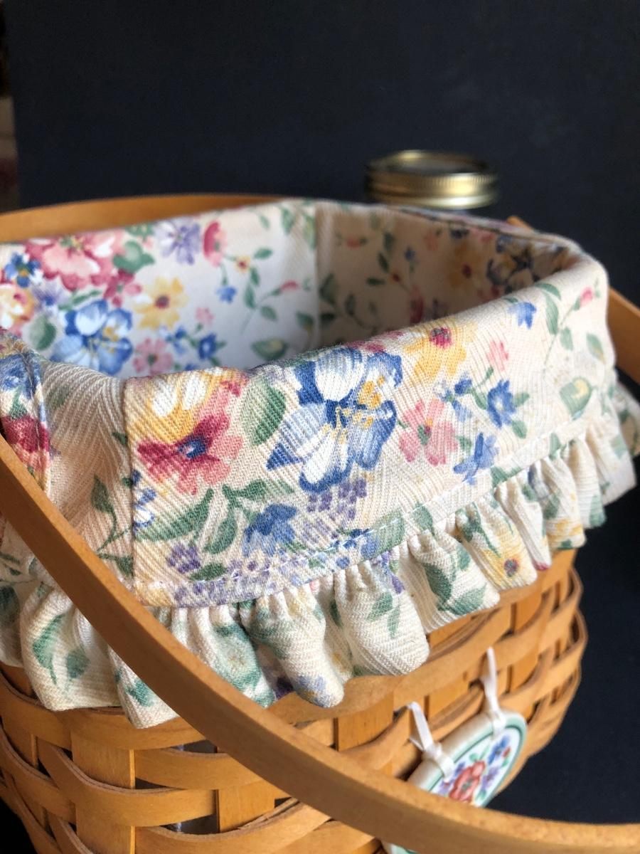 LOT 209S: Longaberger & More - Floral Basket, Blue Ribbon Glass Jar, Pottery Planter, Oven Mitt & More